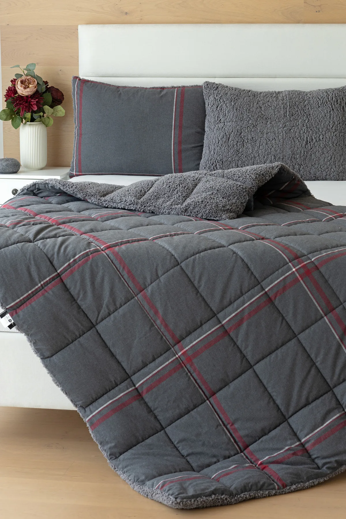Atraktivní tmavě šedý podklad polštáře Ida protíná bílá a vínově červená linka, spodní stranu zdobí barevně sladěný beránek v tmavě šedém odstínu. K polštáři lze dokoupit také prošívanou přikrývku ve stejném designu.