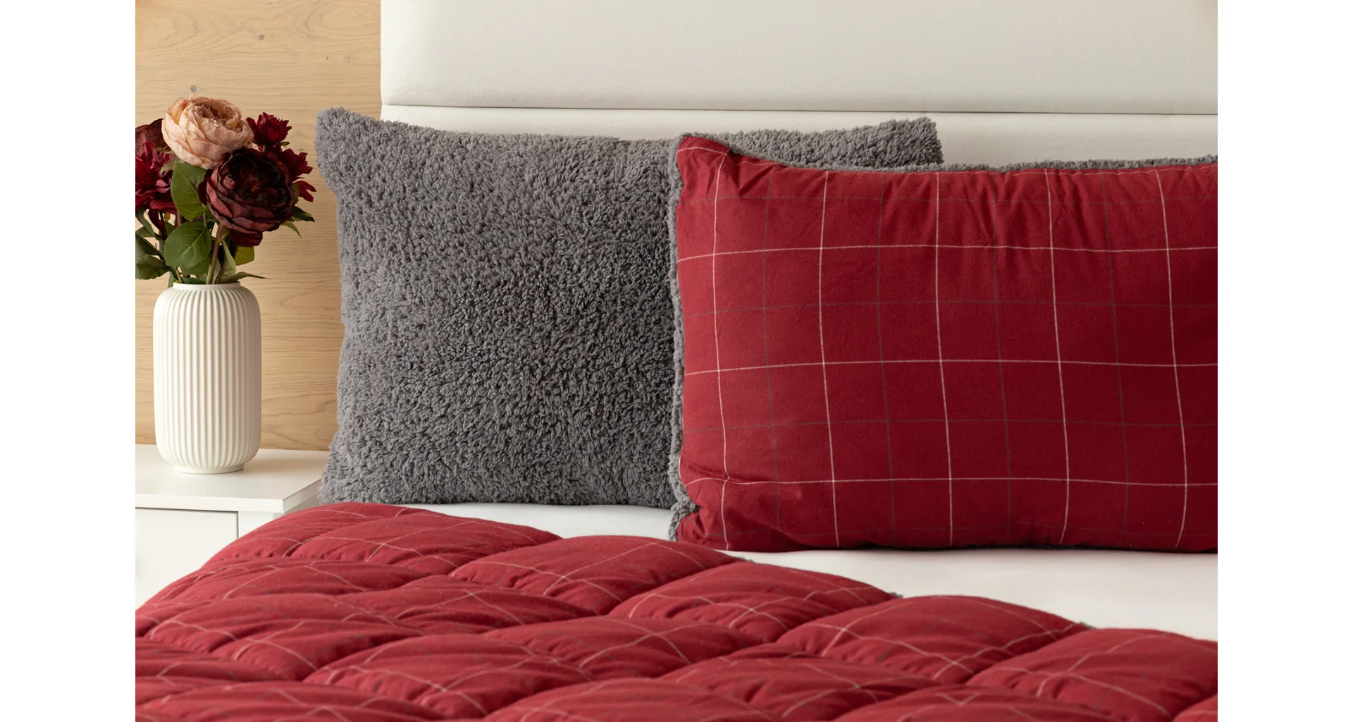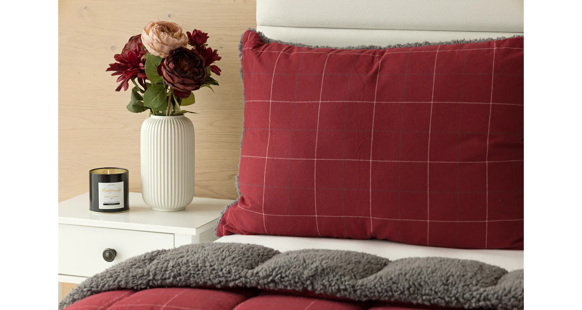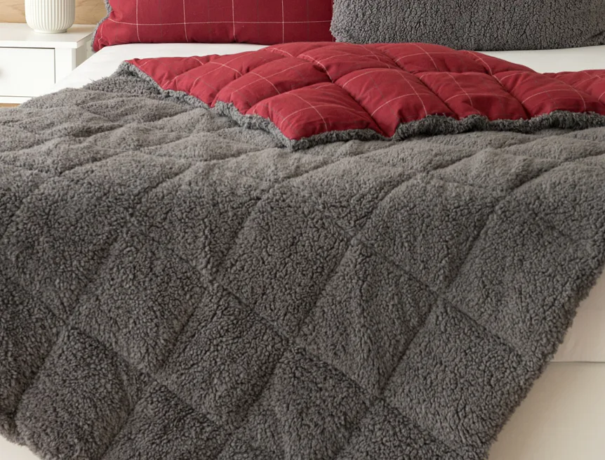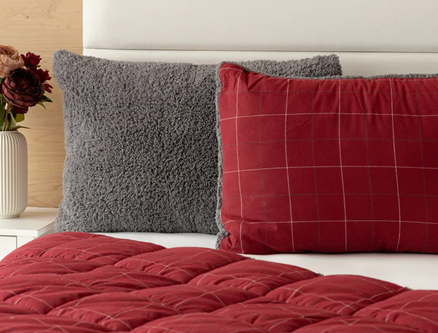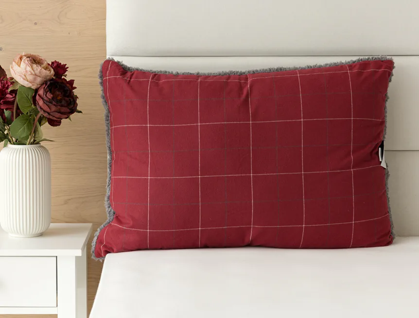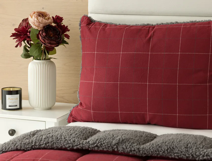 Vzor Linda ve sváteční červené barvě s jemným kostkovaným motivem doplňuje tmavě šedý beránek. K polštáři lze dokoupit také prošívanou přikrývku ve stejném designu.