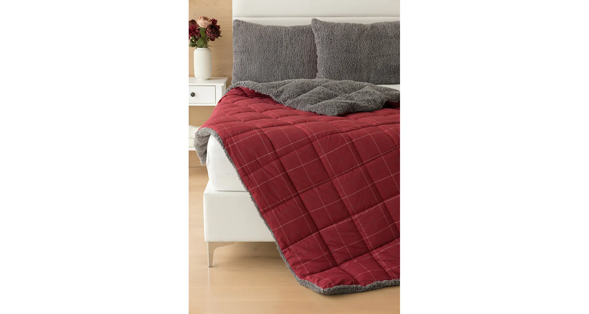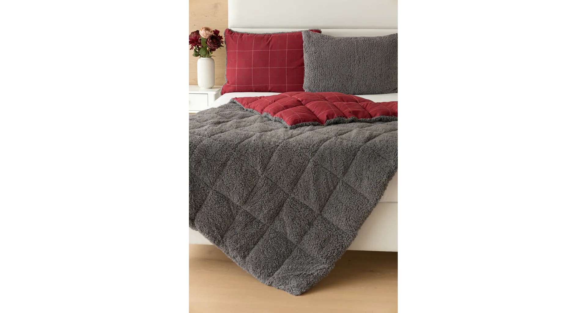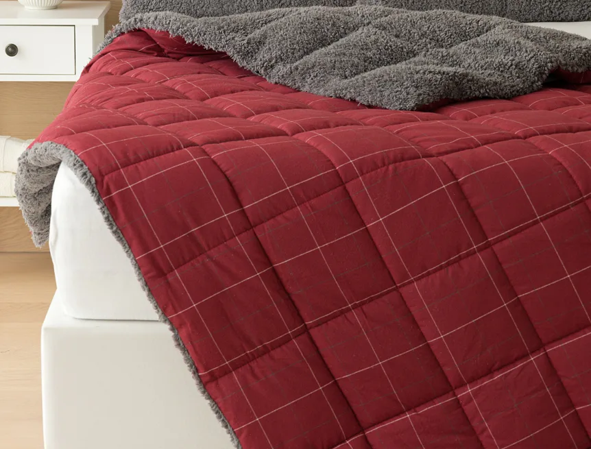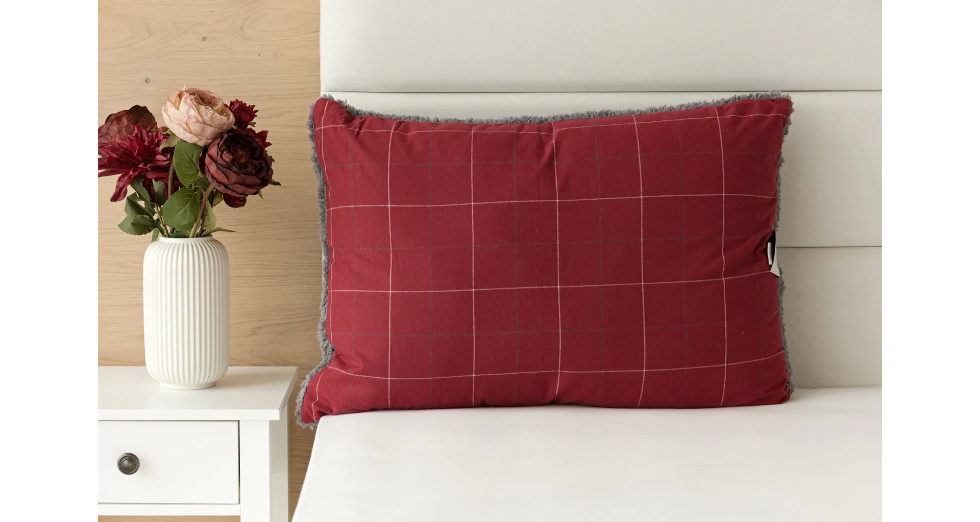 Vzor Linda ve sváteční červené barvě s jemným kostkovaným motivem doplňuje tmavě šedý beránek. K polštáři lze dokoupit také prošívanou přikrývku ve stejném designu.