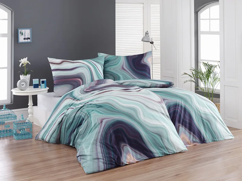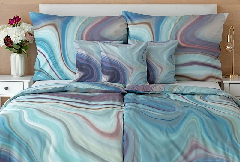 Moderní povlečení Achát se stane skutečným klenotem nejen minimalisticky zařízené ložnice. Nechte se okouzlit noblesně sladěnými barvami, ve kterých se odrážejí jemné tóny odstínů modré, šedé, fialové, starorůžové i zlatavě hnědé.