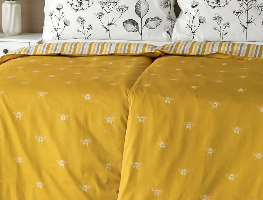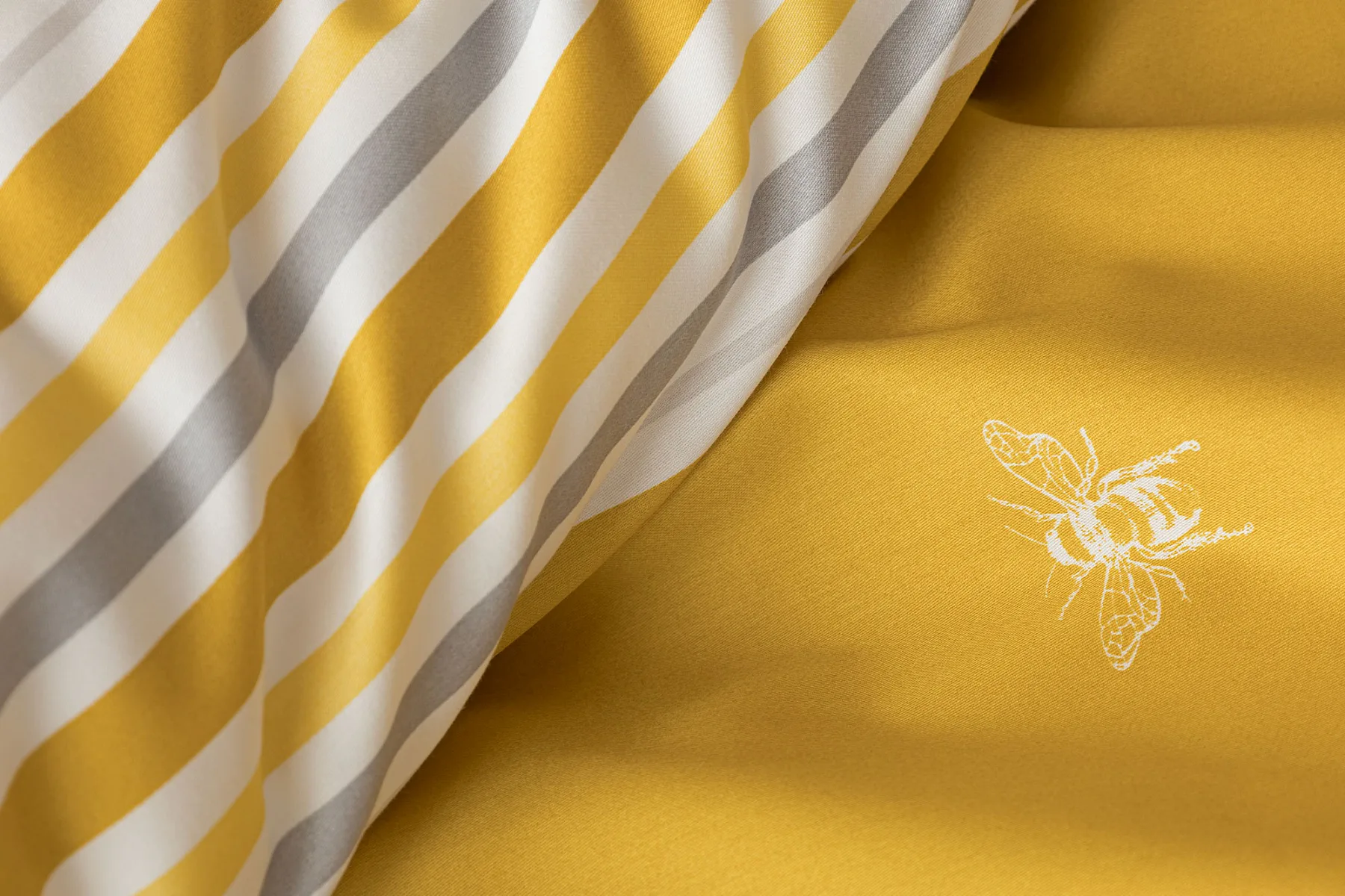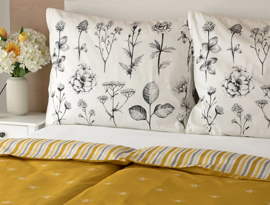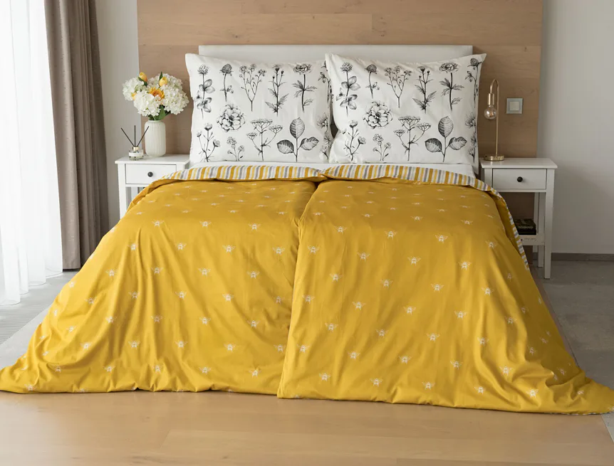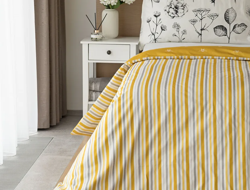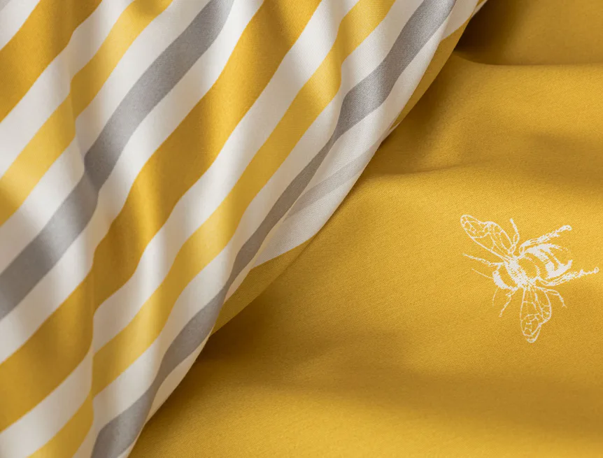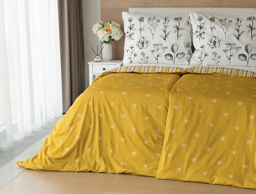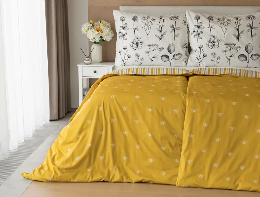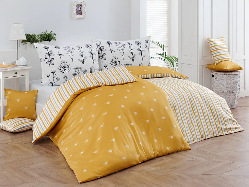 Moderní odstíny, decentní motiv včeliček, nadčasové proužky a jemná květinová kresba učiní z povlečení Adore ze 100% bavlny elegantní doplněk vaší ložnice. Hřejivá medově zlatá barva nechává vyniknout drobnému bílému motivu včelek na vrchní straně cíchy. Spodní strana povlaku na přikrývku je ve znamení zlatavých, světle žlutých, bílých a světle šedých proužků. Povlak na polštář je z obou stran posetý jemnou kresbou lučních květin.