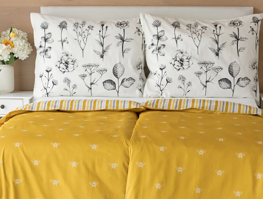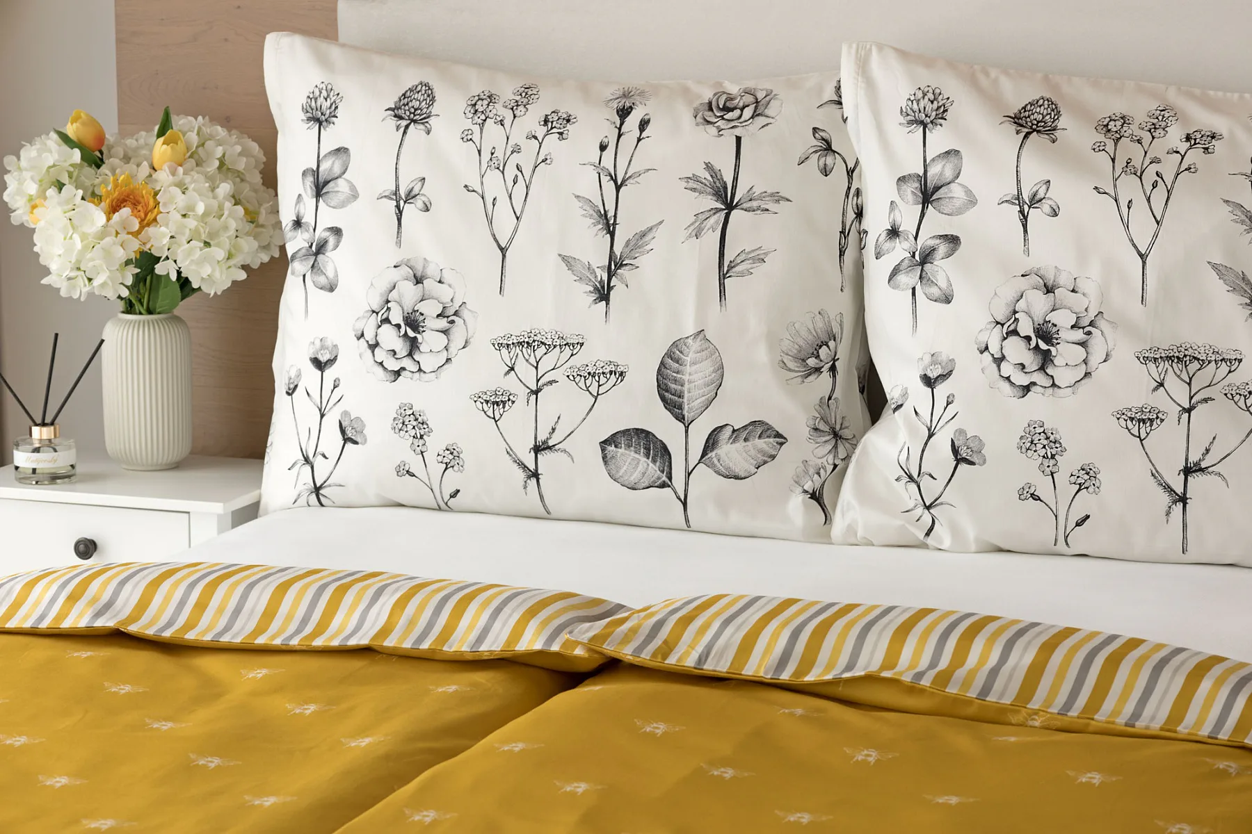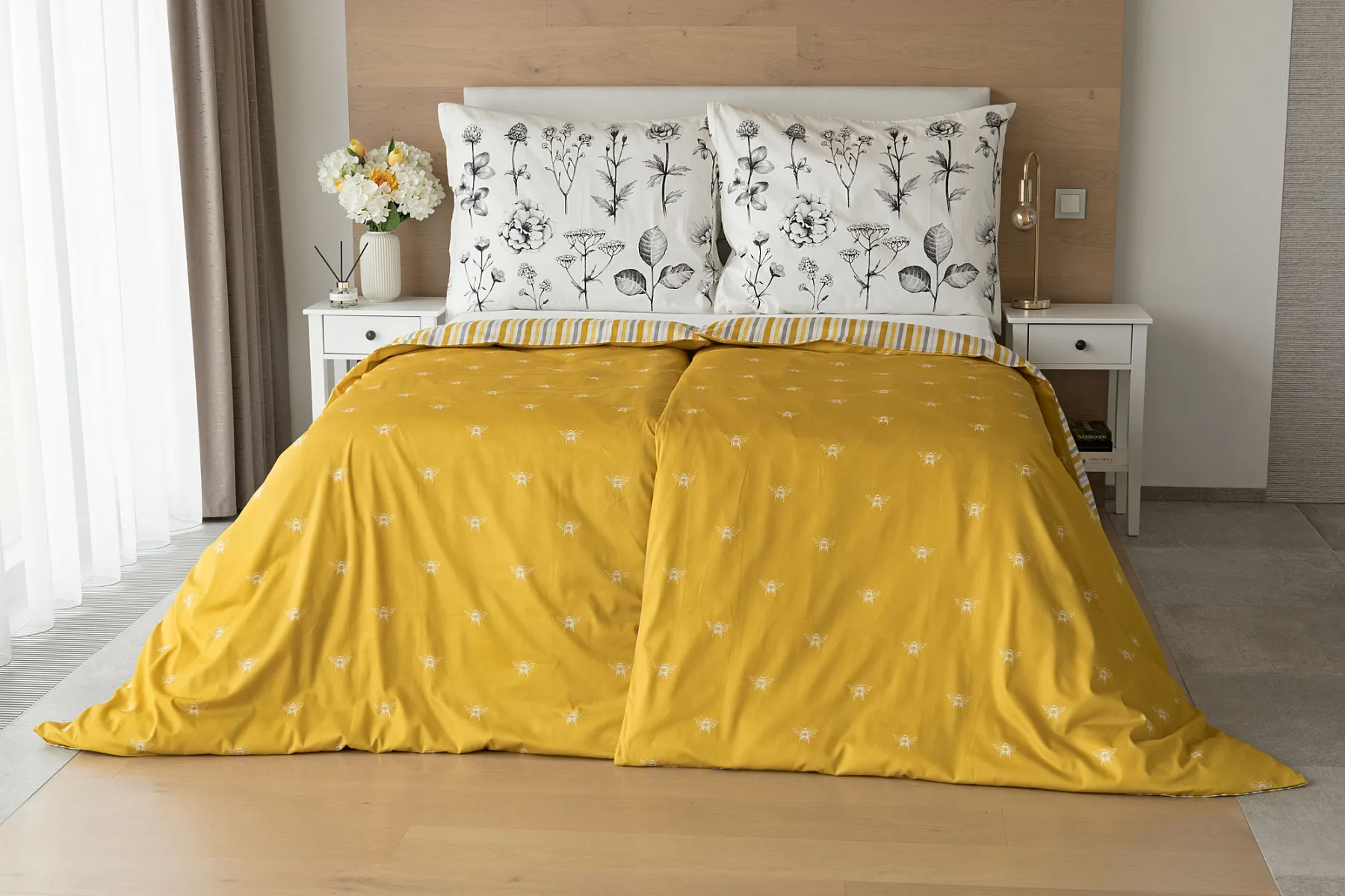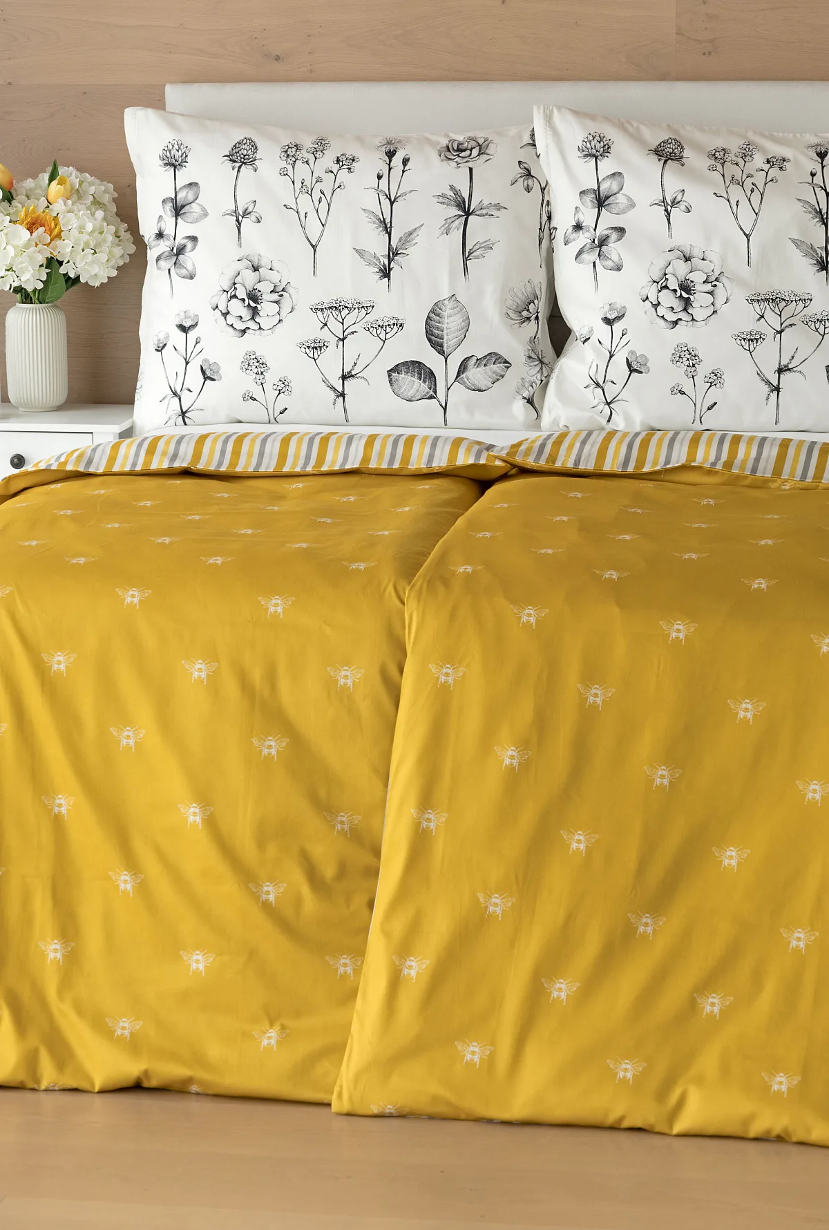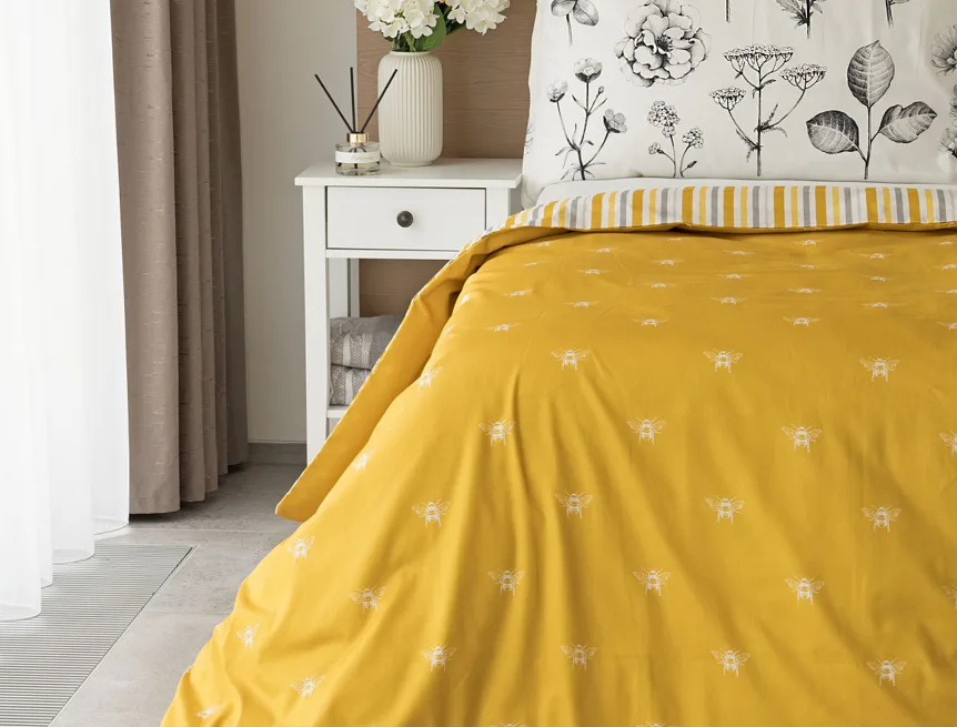 Moderní odstíny, decentní motiv včeliček, nadčasové proužky a jemná květinová kresba učiní z povlečení Adore ze 100% bavlny elegantní doplněk vaší ložnice. Hřejivá medově zlatá barva nechává vyniknout drobnému bílému motivu včelek na vrchní straně cíchy. Spodní strana povlaku na přikrývku je ve znamení zlatavých, světle žlutých, bílých a světle šedých proužků. Povlak na polštář je z obou stran posetý jemnou kresbou lučních květin.