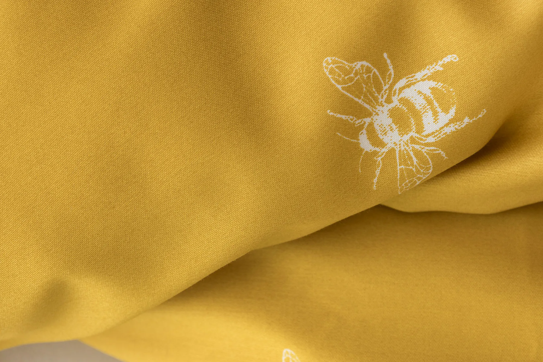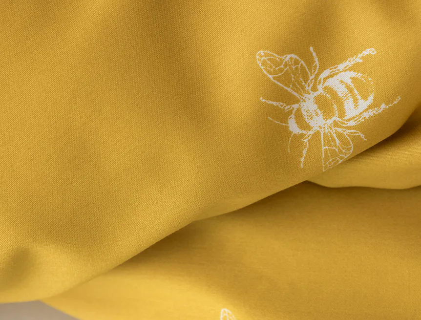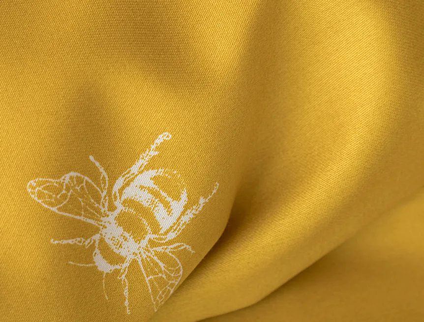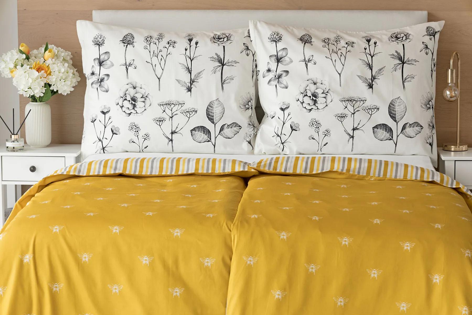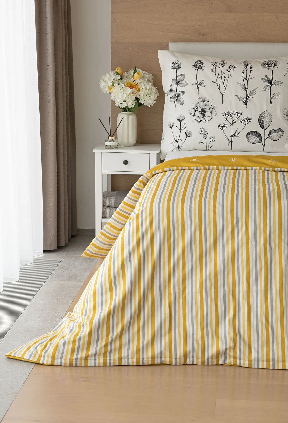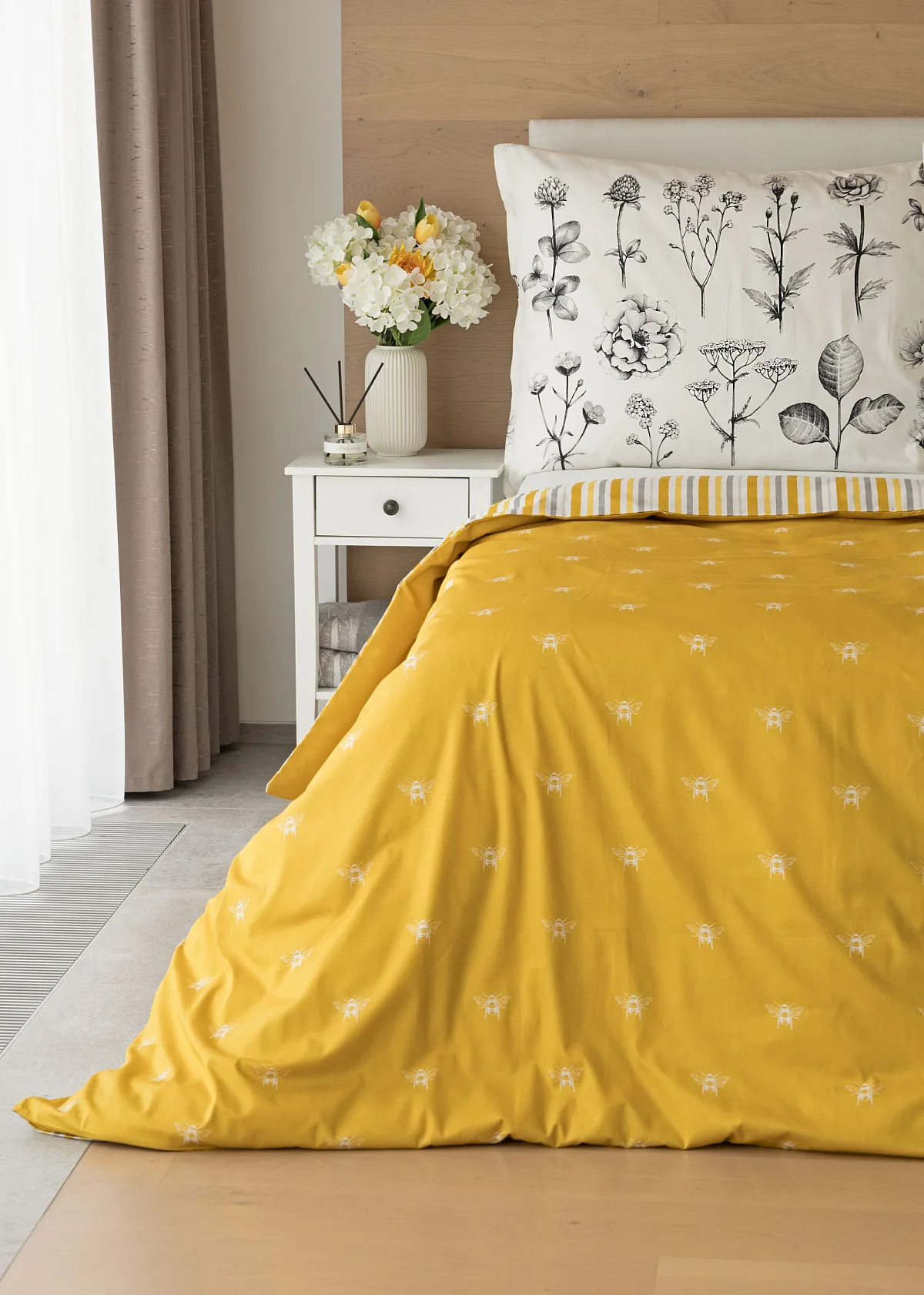 Moderní odstíny, decentní motiv včeliček, nadčasové proužky a jemná květinová kresba učiní z povlečení Adore ze 100% bavlny elegantní doplněk vaší ložnice. Hřejivá medově zlatá barva nechává vyniknout drobnému bílému motivu včelek na vrchní straně cíchy. Spodní strana povlaku na přikrývku je ve znamení zlatavých, světle žlutých, bílých a světle šedých proužků. Povlak na polštář je z obou stran posetý jemnou kresbou lučních květin.