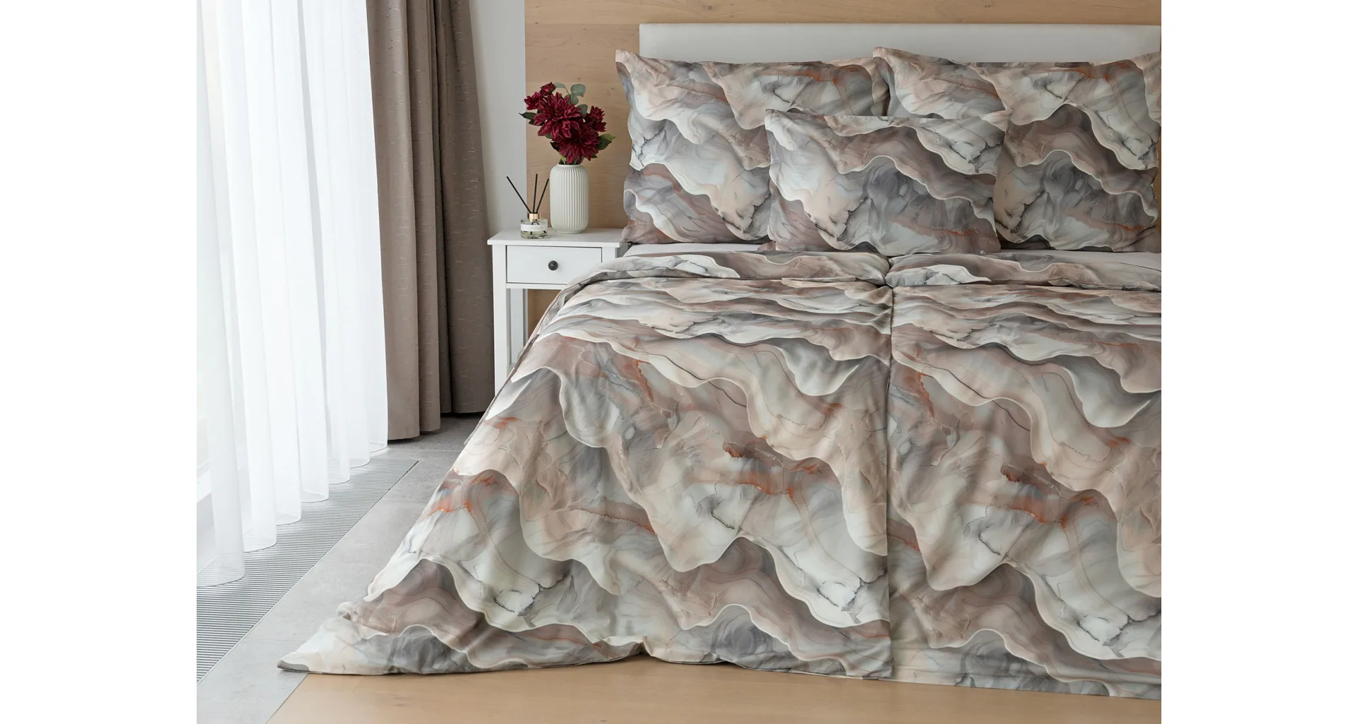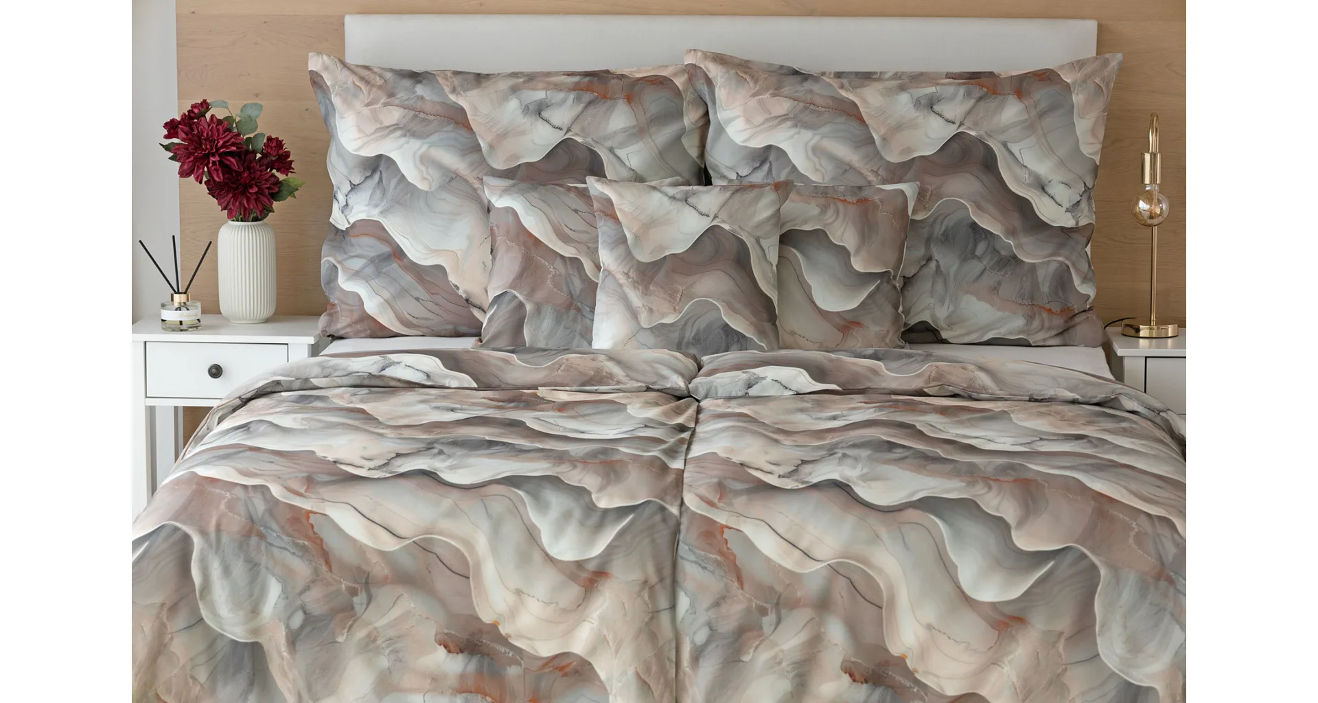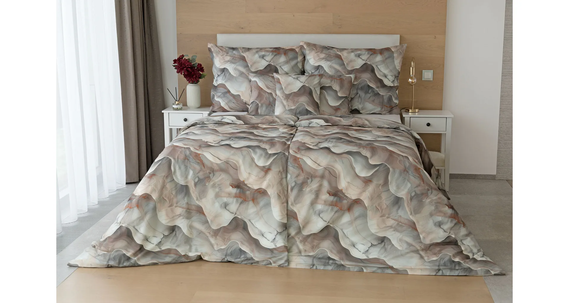 Bavlněné ložní povlečení Amede vnese do vaší ložnice pozitivní energii a nabudí vás do každého dne. Spojení zemitých tónů hnědé, cihlové a šedé barvy v abstraktním vzoru tvoří dokonalý celek, který vyladí váš interiér k dokonalosti. Díky nejmodernější digitální tiskové technologii vyniká vzor v precizním detailu.