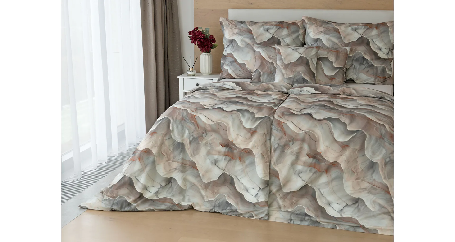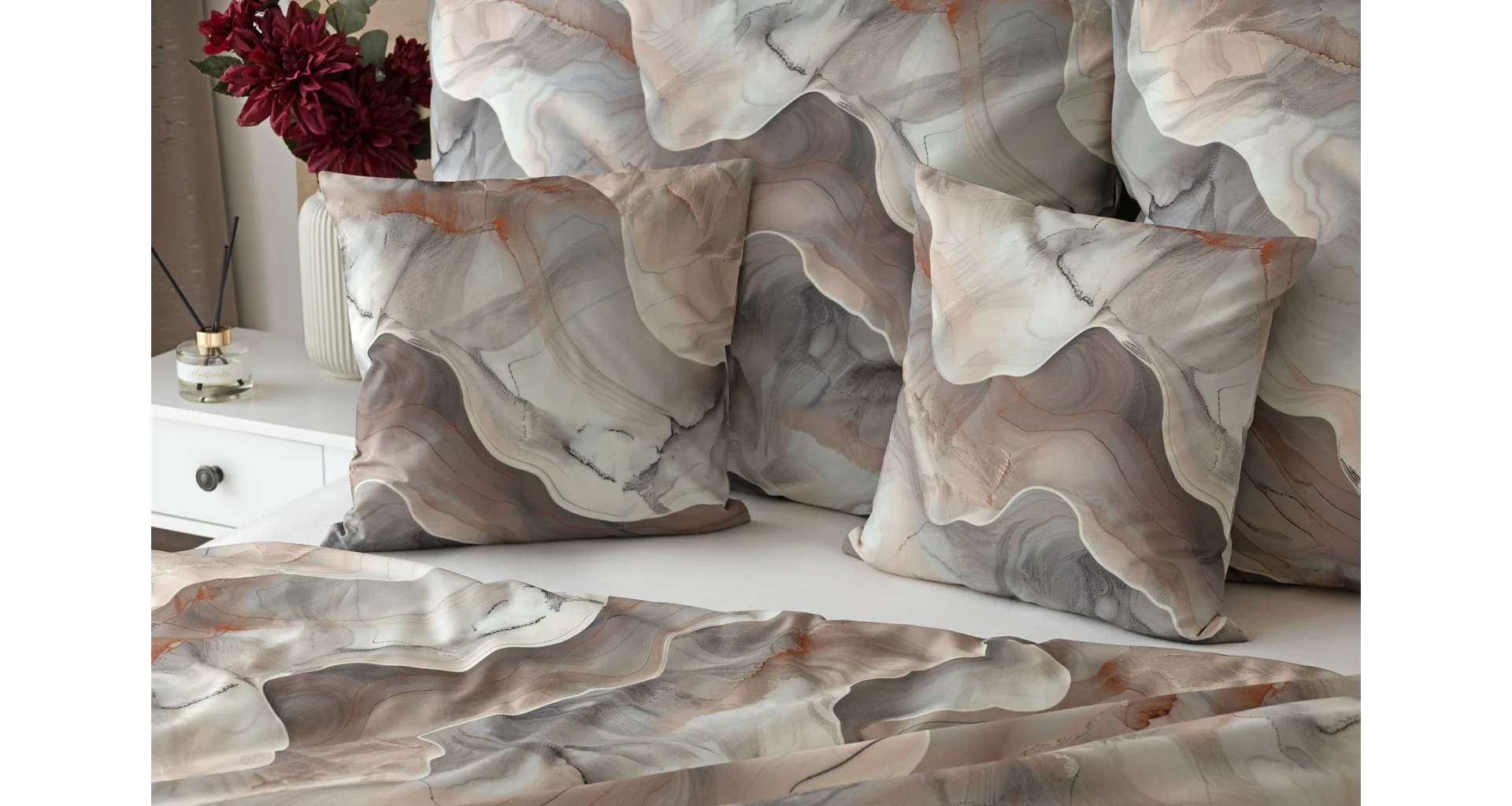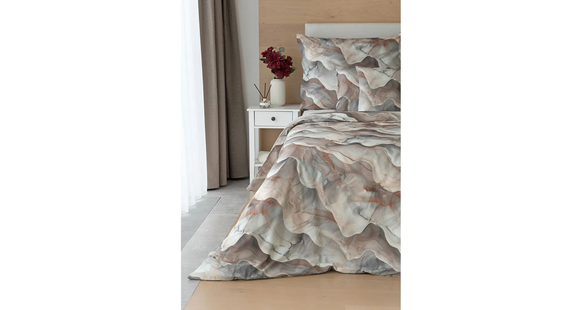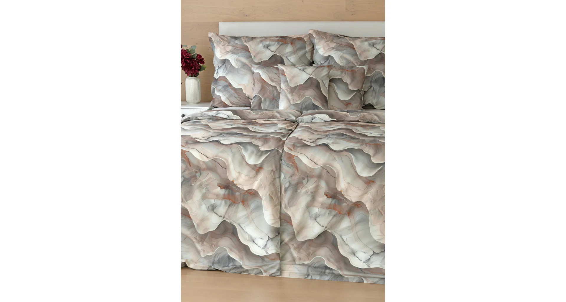 Bavlněné ložní povlečení Amede vnese do vaší ložnice pozitivní energii a nabudí vás do každého dne. Spojení zemitých tónů hnědé, cihlové a šedé barvy v abstraktním vzoru tvoří dokonalý celek, který vyladí váš interiér k dokonalosti. Díky nejmodernější digitální tiskové technologii vyniká vzor v precizním detailu.
