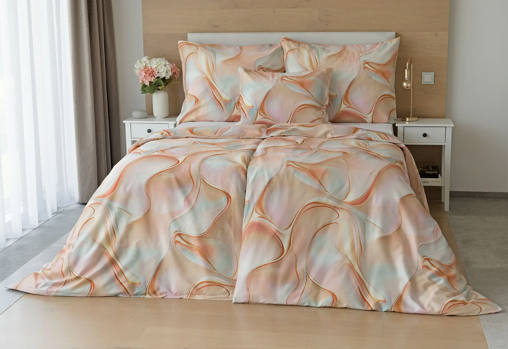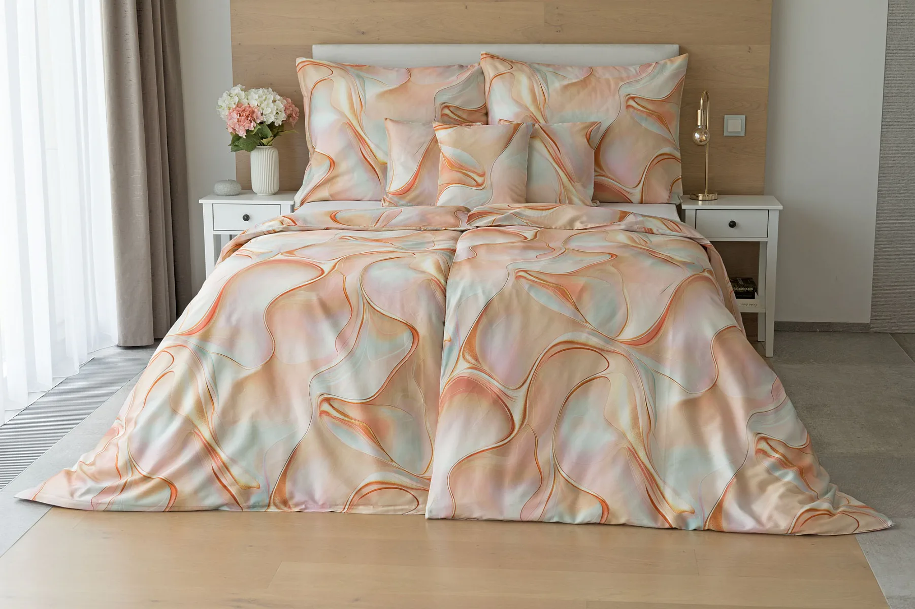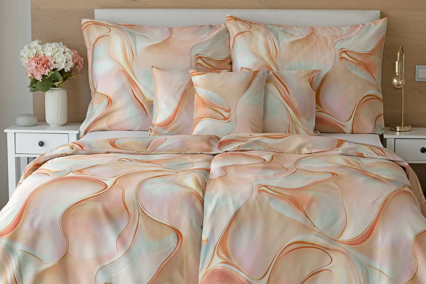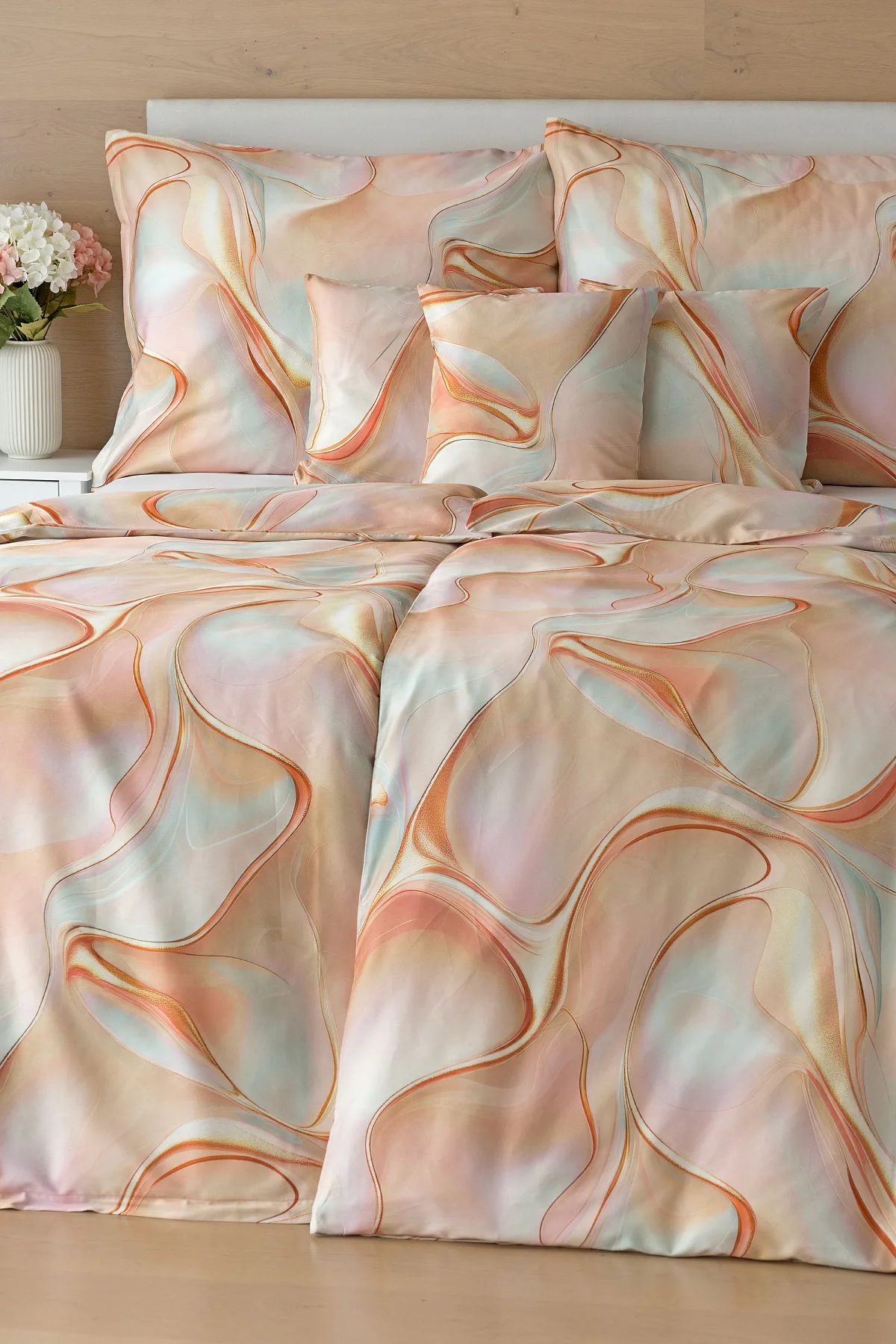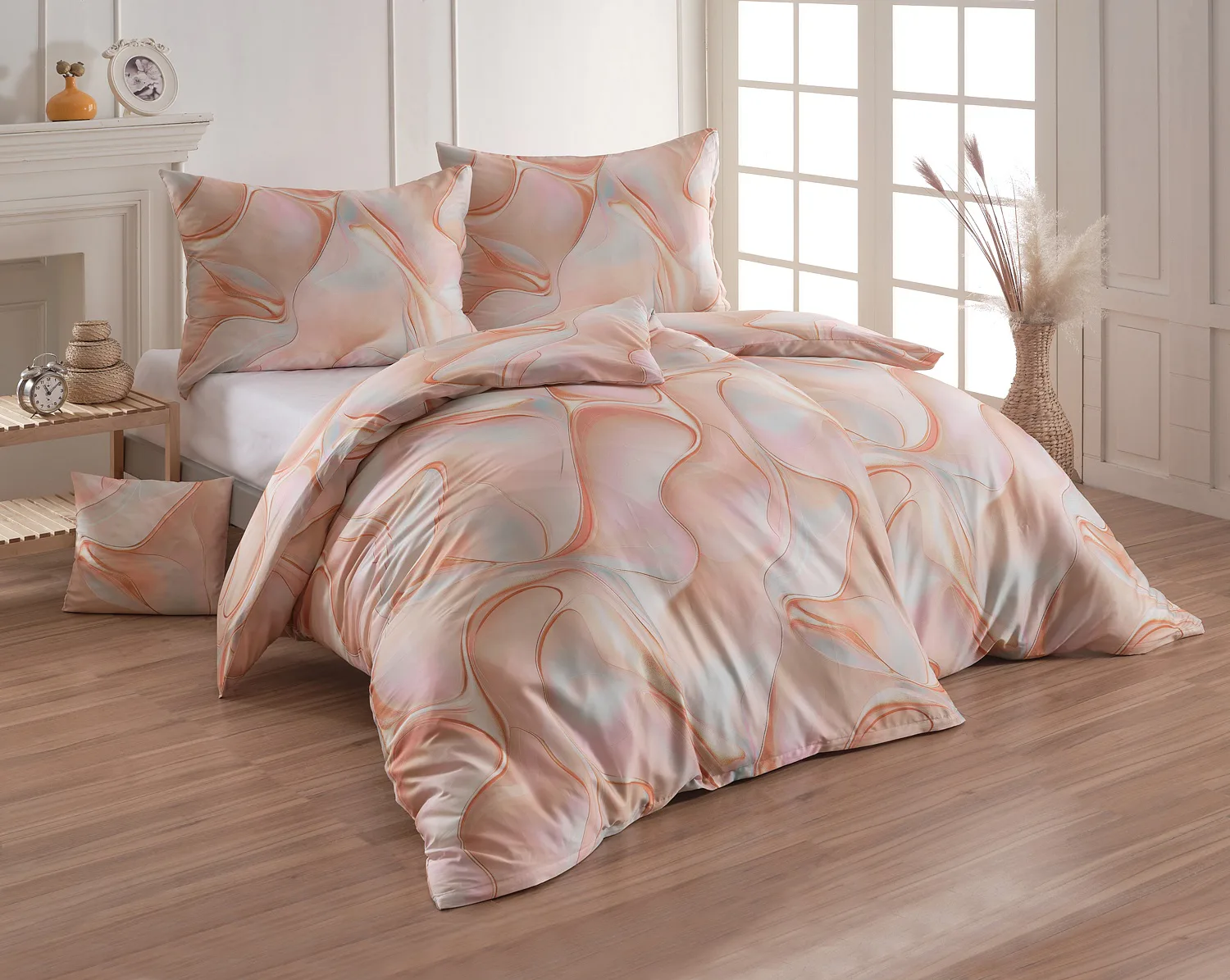 Nechte se uchvátit originálním designem bavlněného ložního povlečení Amulet. V abstraktním vzoru se snoubí celá paleta atraktivních růžových a meruňkových tónů protnutých oranžovými a žlutými konturami autorského návrhu. Díky nejmodernějšímu digitálnímu tisku vynikají barevné přechody i ostré prvky v precizním detailu. Eleganci vzoru podtrhuje hebký bavlněný satén s decentním leskem.