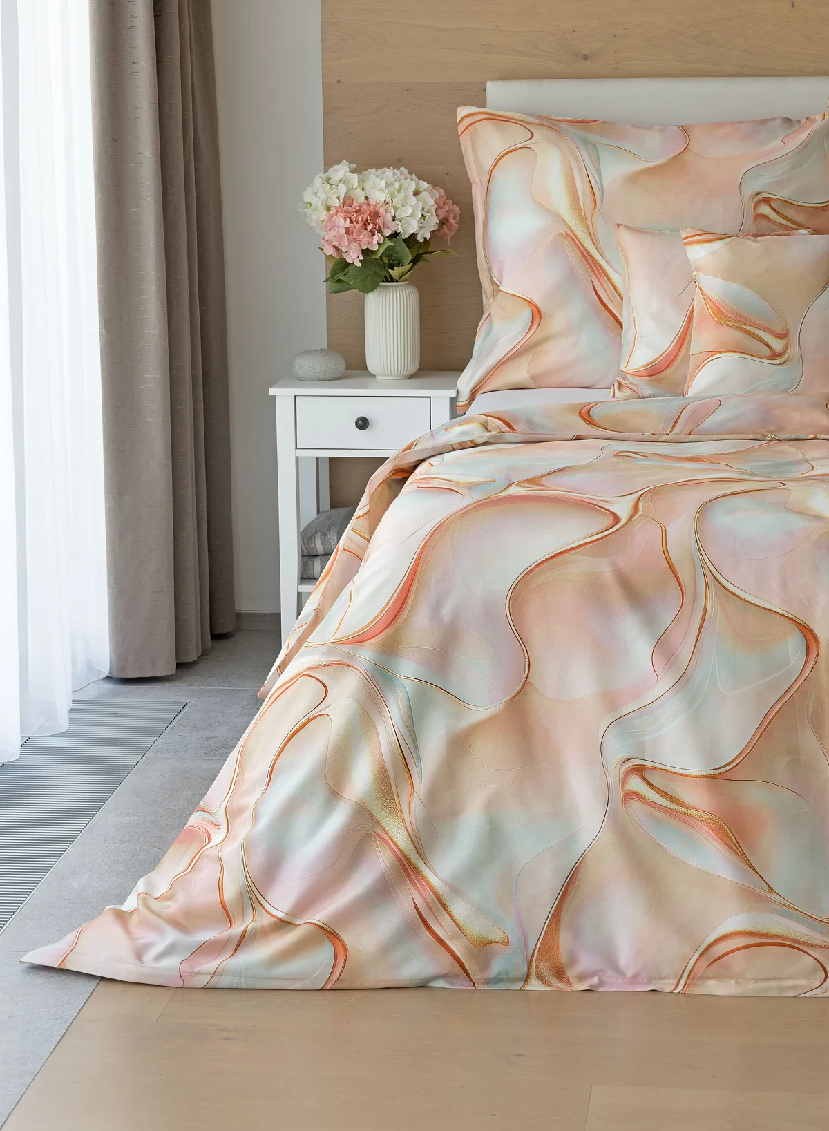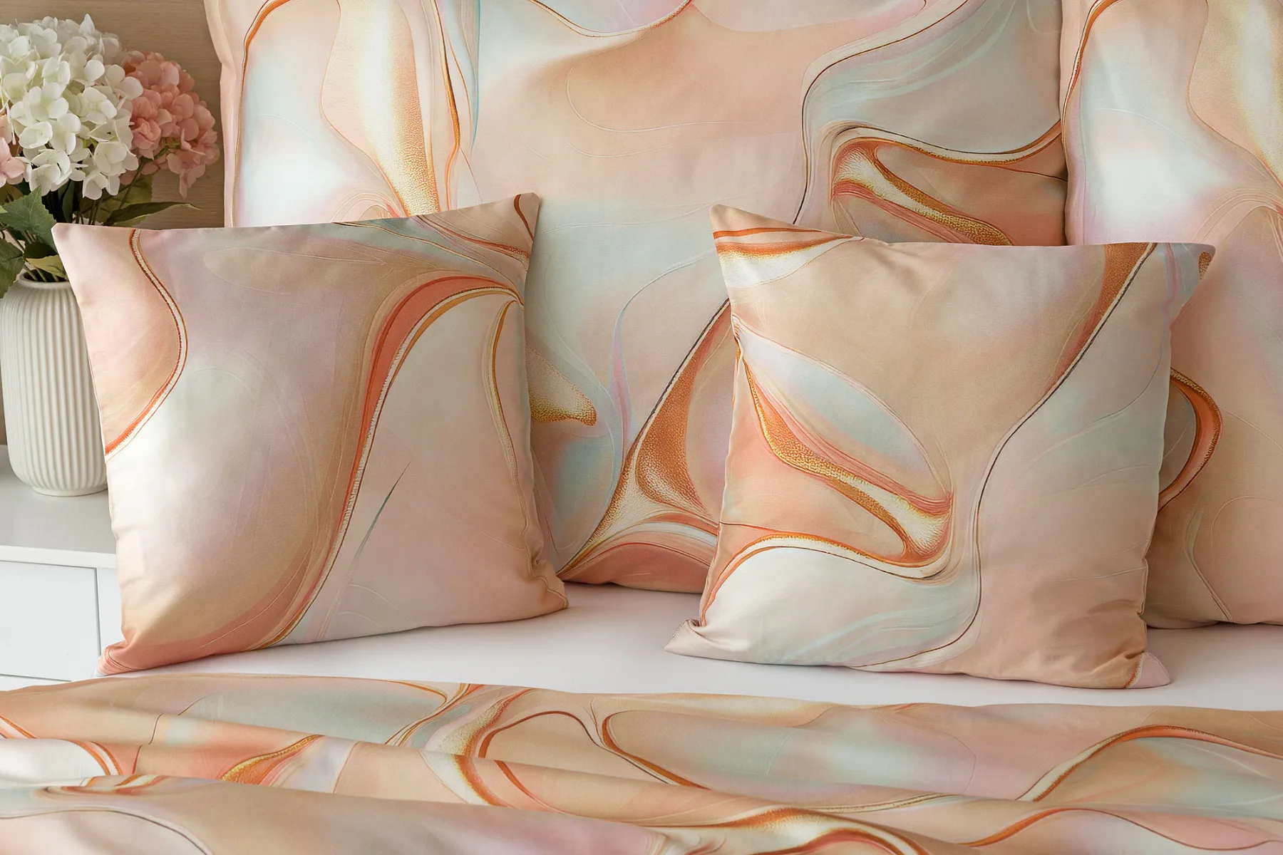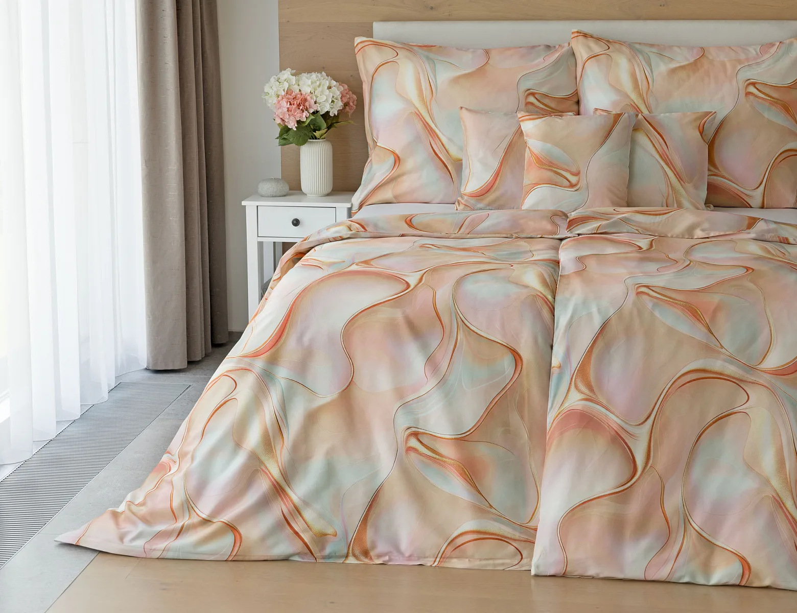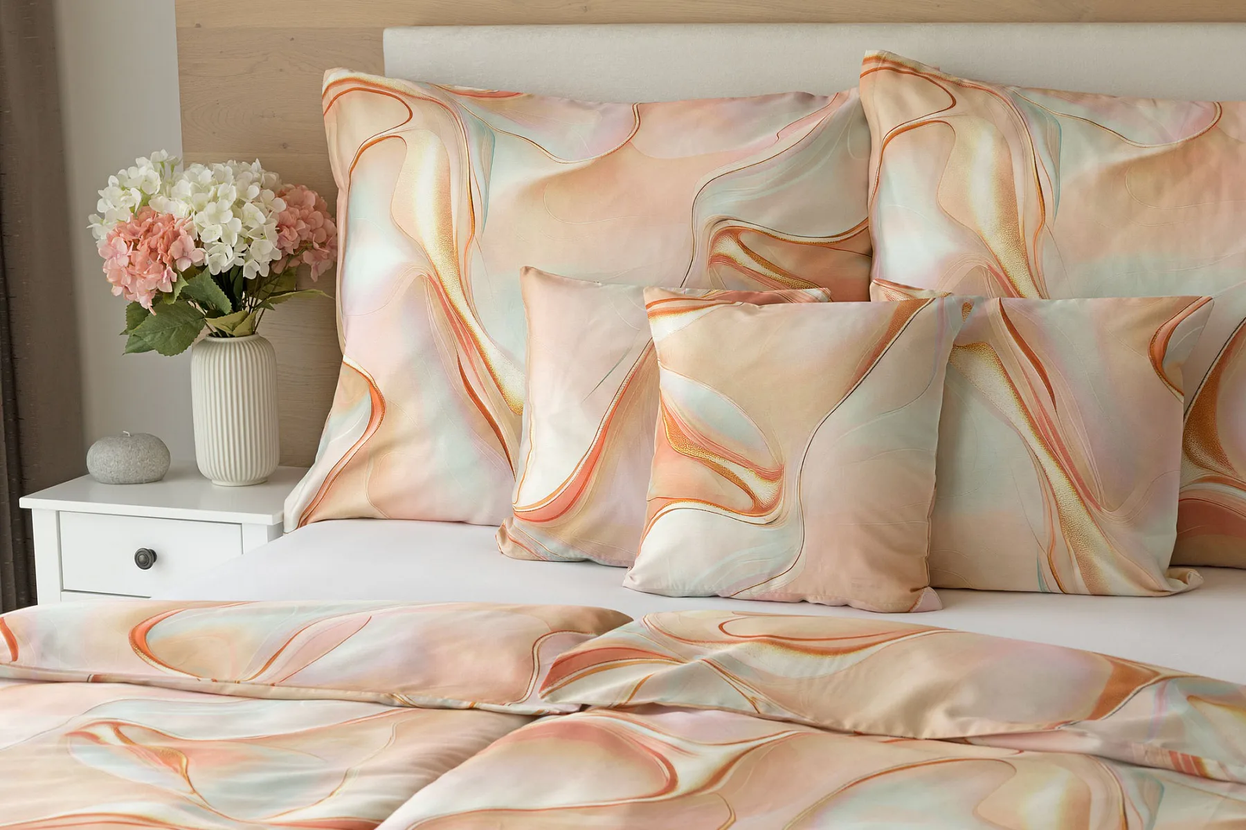 Nechte se uchvátit originálním designem bavlněného ložního povlečení Amulet. V abstraktním vzoru se snoubí celá paleta atraktivních růžových a meruňkových tónů protnutých oranžovými a žlutými konturami autorského návrhu. Díky nejmodernějšímu digitálnímu tisku vynikají barevné přechody i ostré prvky v precizním detailu. Eleganci vzoru podtrhuje hebký bavlněný satén s decentním leskem.