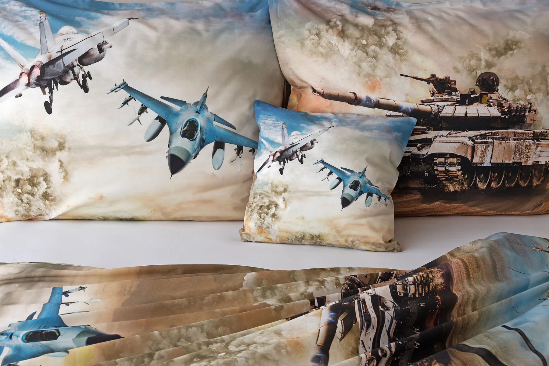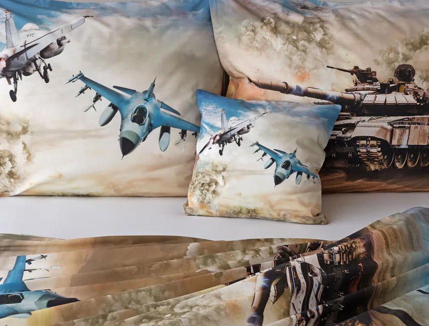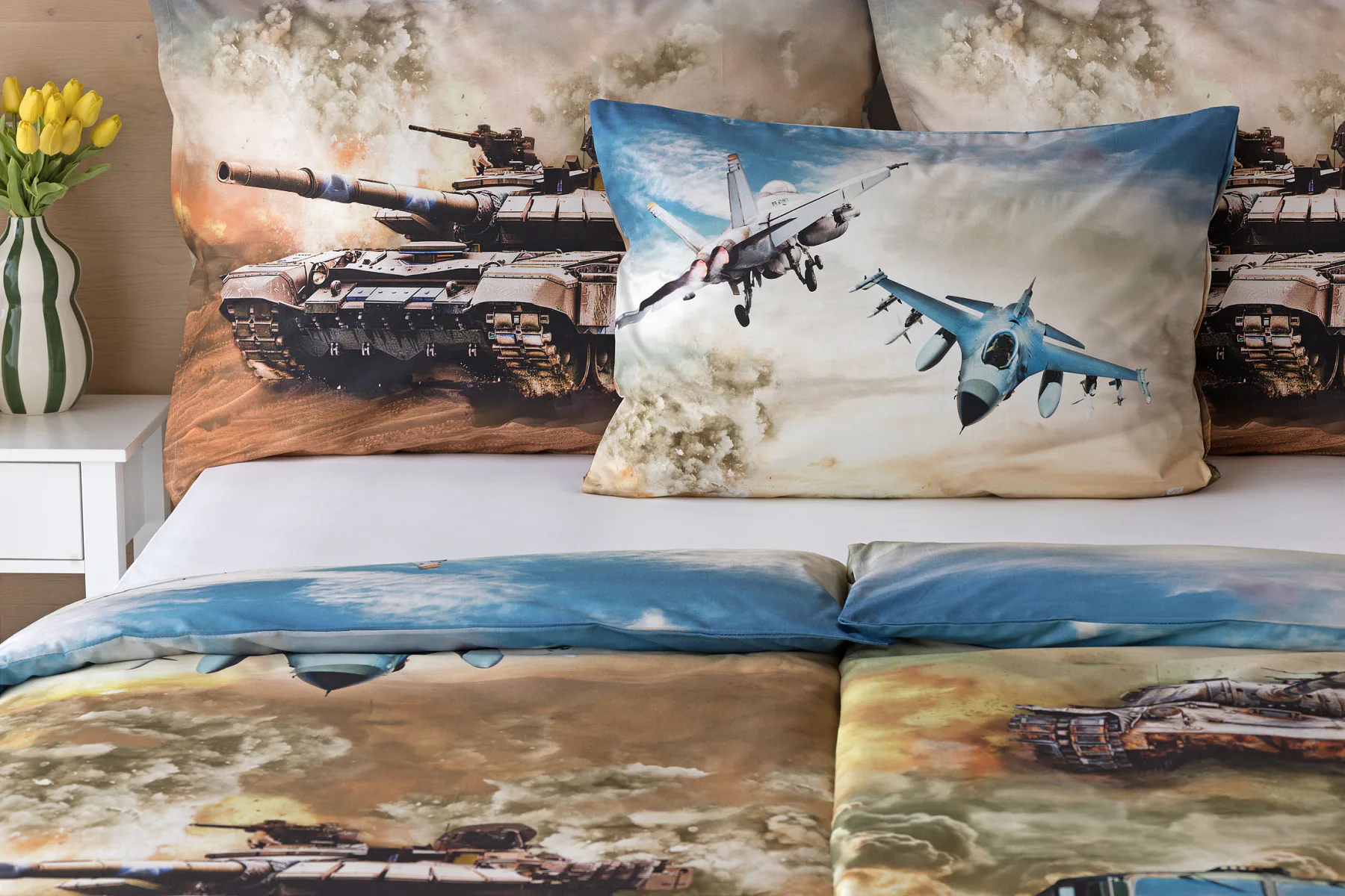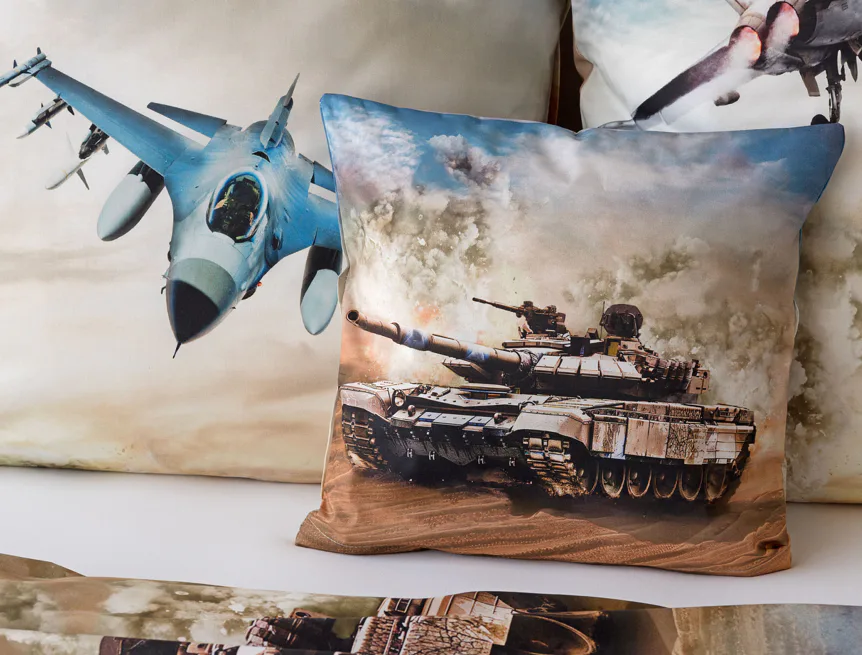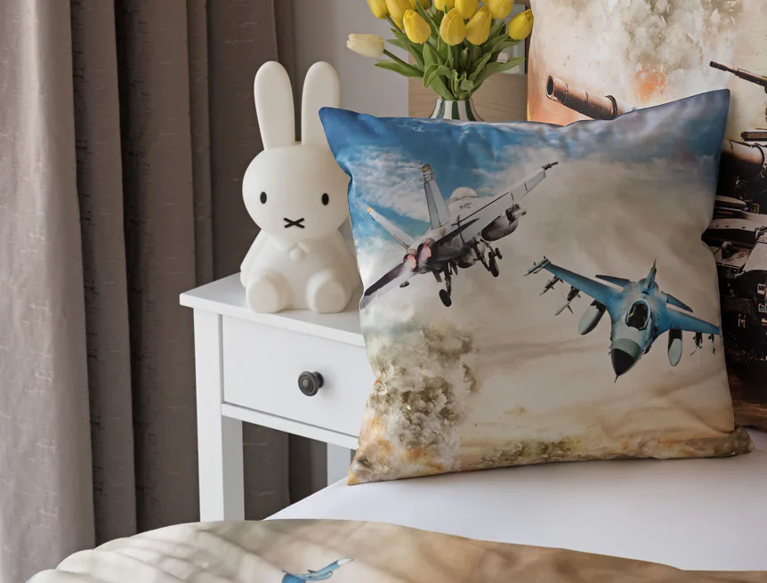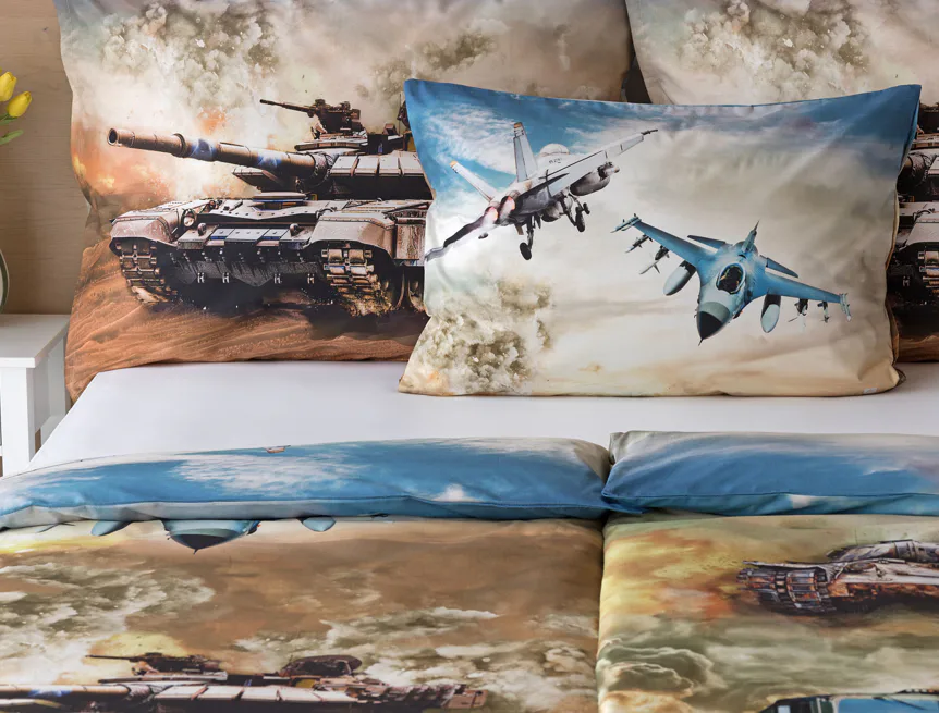 Povlak na přikrývku je z obou stran stejný. Povlak na polštář zachycuje z každé strany jiný motiv (vrchní stranu zdobí motiv stíhaček, spodní strana zachycuje motiv tanku). Na lícové straně polštáře je v pravém dolním rohu umístěno malé logo „M“. Povlečení je vyrobeno ze 100% bavlny a je opatřeno praktickým zipovým uzávěrem.