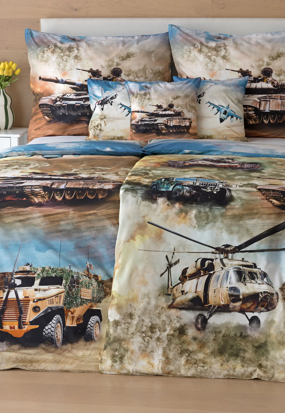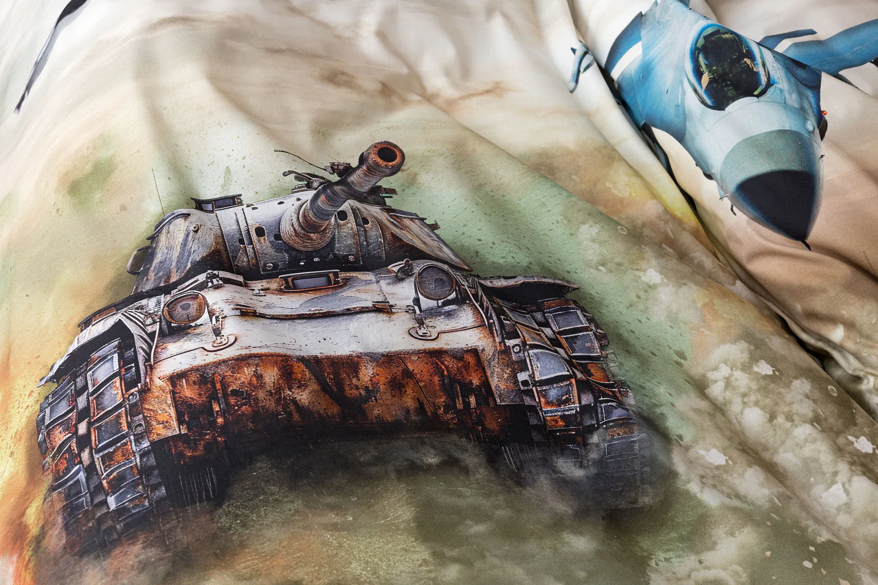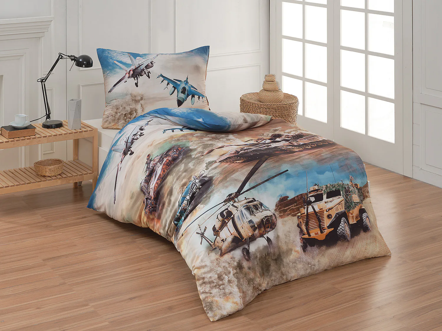Povlak na přikrývku je z obou stran stejný. Povlak na polštář zachycuje z každé strany jiný motiv (vrchní stranu zdobí motiv stíhaček, spodní strana zachycuje motiv tanku). Na lícové straně polštáře je v pravém dolním rohu umístěno malé logo „M“. Povlečení je vyrobeno ze 100% bavlny a je opatřeno praktickým zipovým uzávěrem.