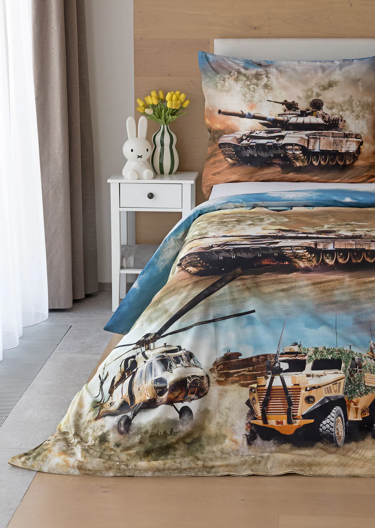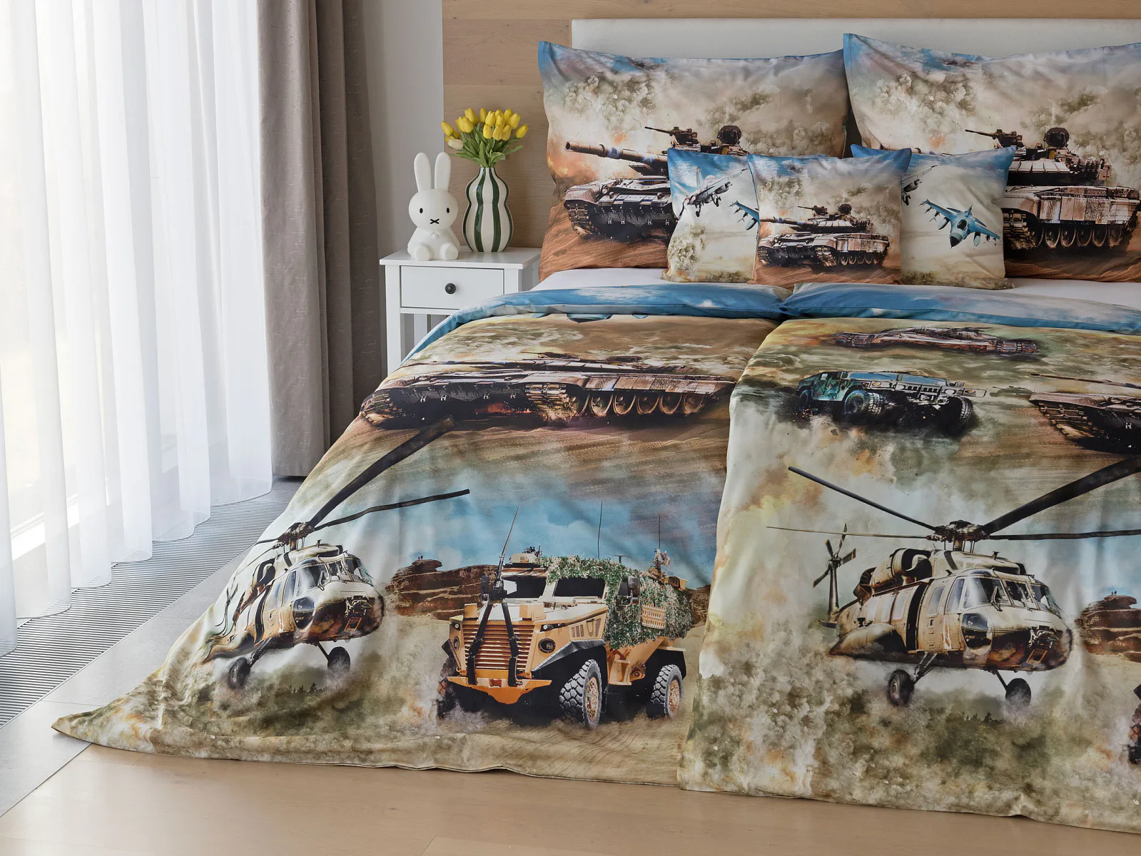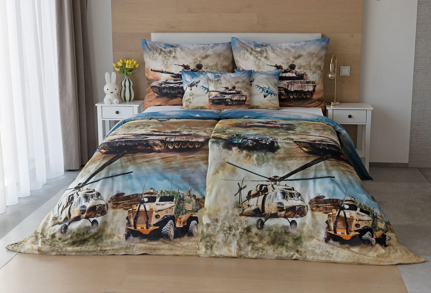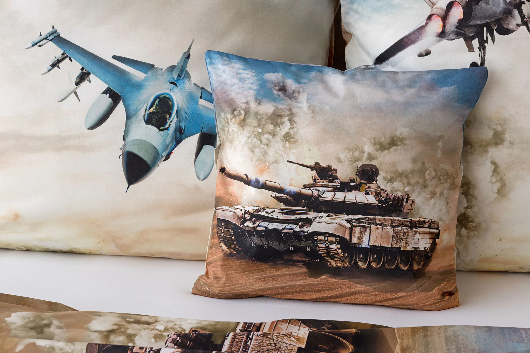 Povlak na přikrývku je z obou stran stejný. Povlak na polštář zachycuje z každé strany jiný motiv (vrchní stranu zdobí motiv stíhaček, spodní strana zachycuje motiv tanku). Na lícové straně polštáře je v pravém dolním rohu umístěno malé logo „M“. Povlečení je vyrobeno ze 100% bavlny a je opatřeno praktickým zipovým uzávěrem.