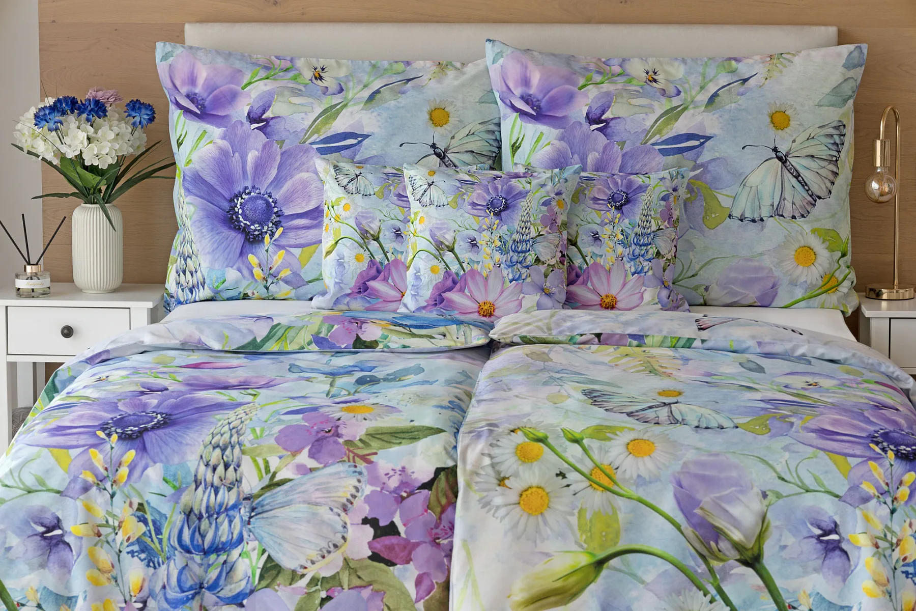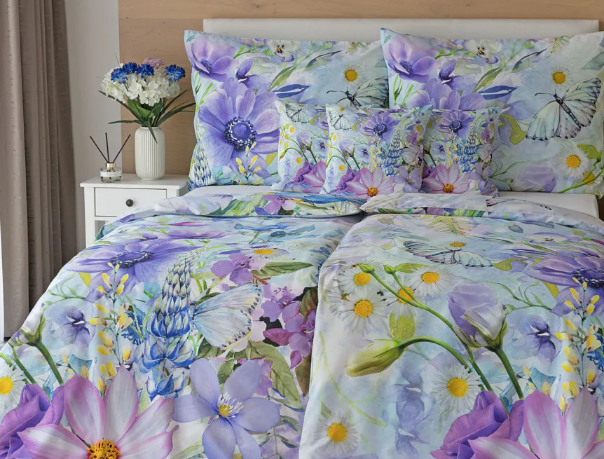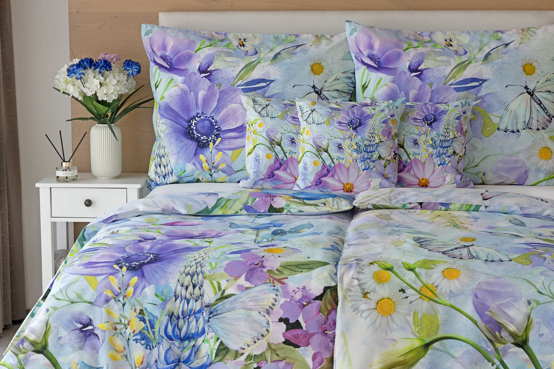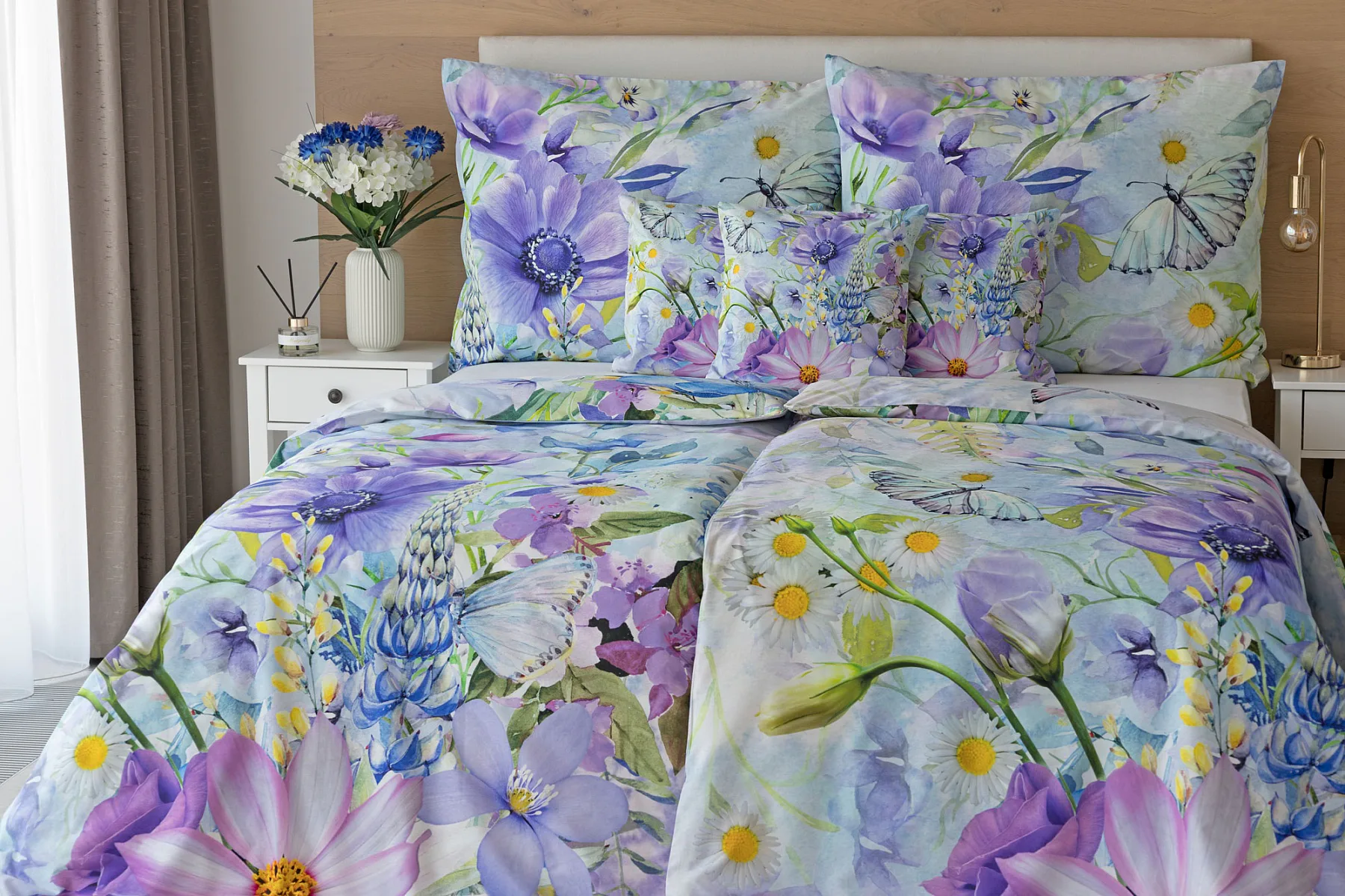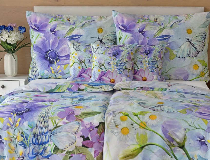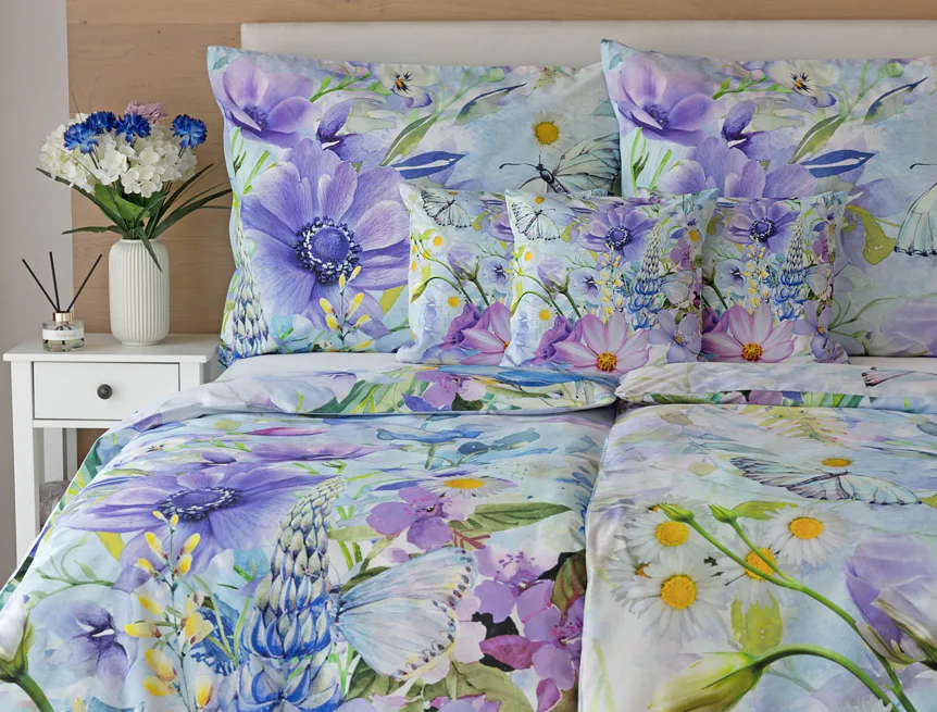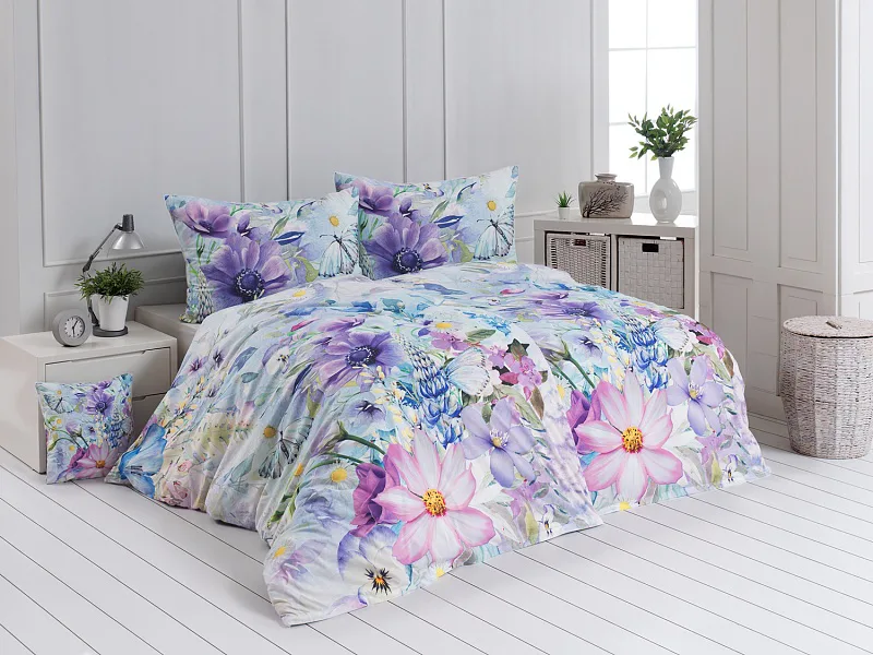 Kombinací akvarelové malby a fotoprvků vznikl poutavý květinový vzor povlečení Aurelia. Jemný bílomodrý podklad dává vyniknout květům v atraktivních fialových a růžových odstínech.