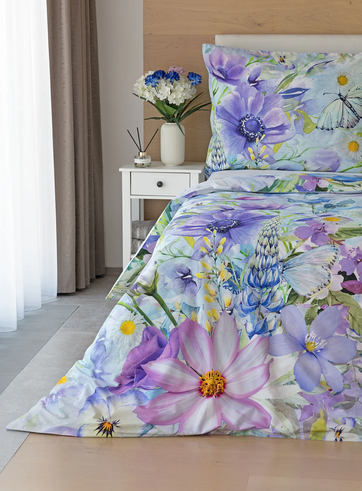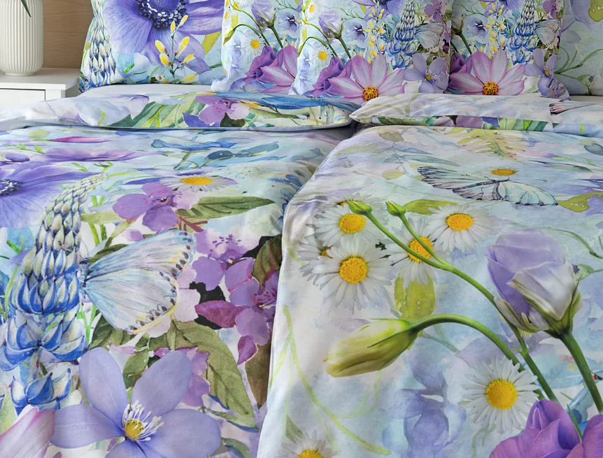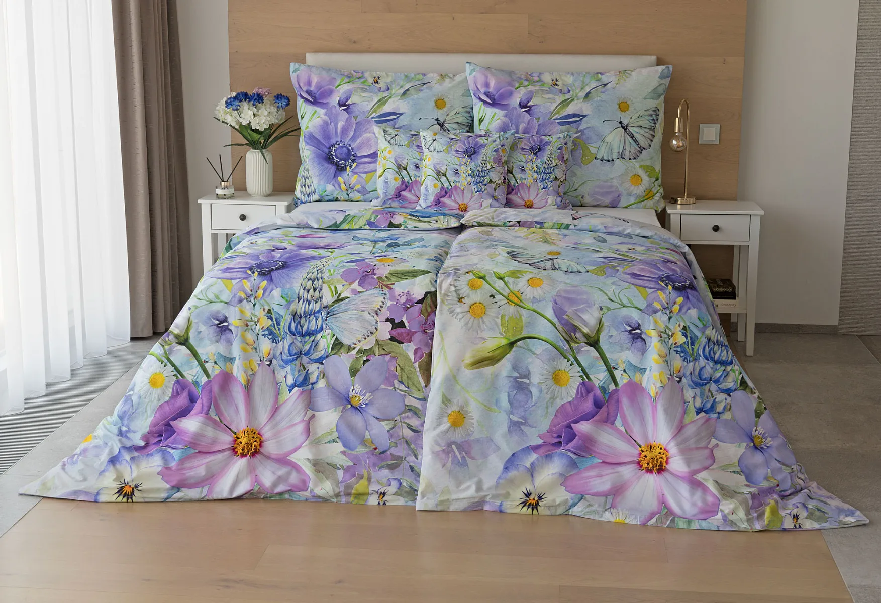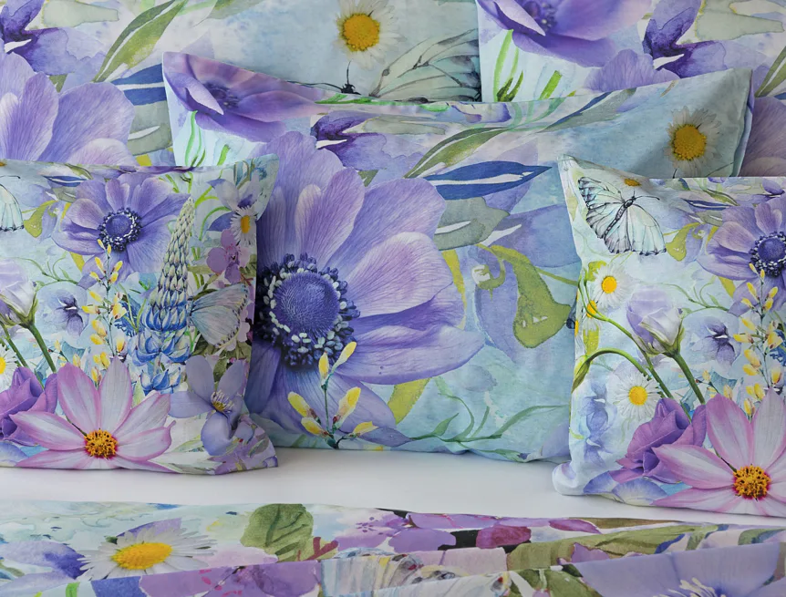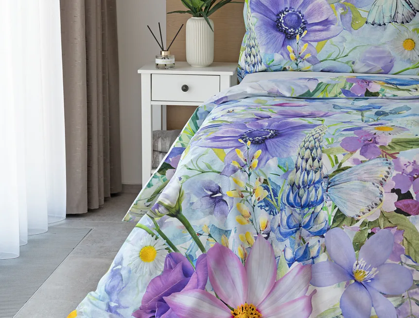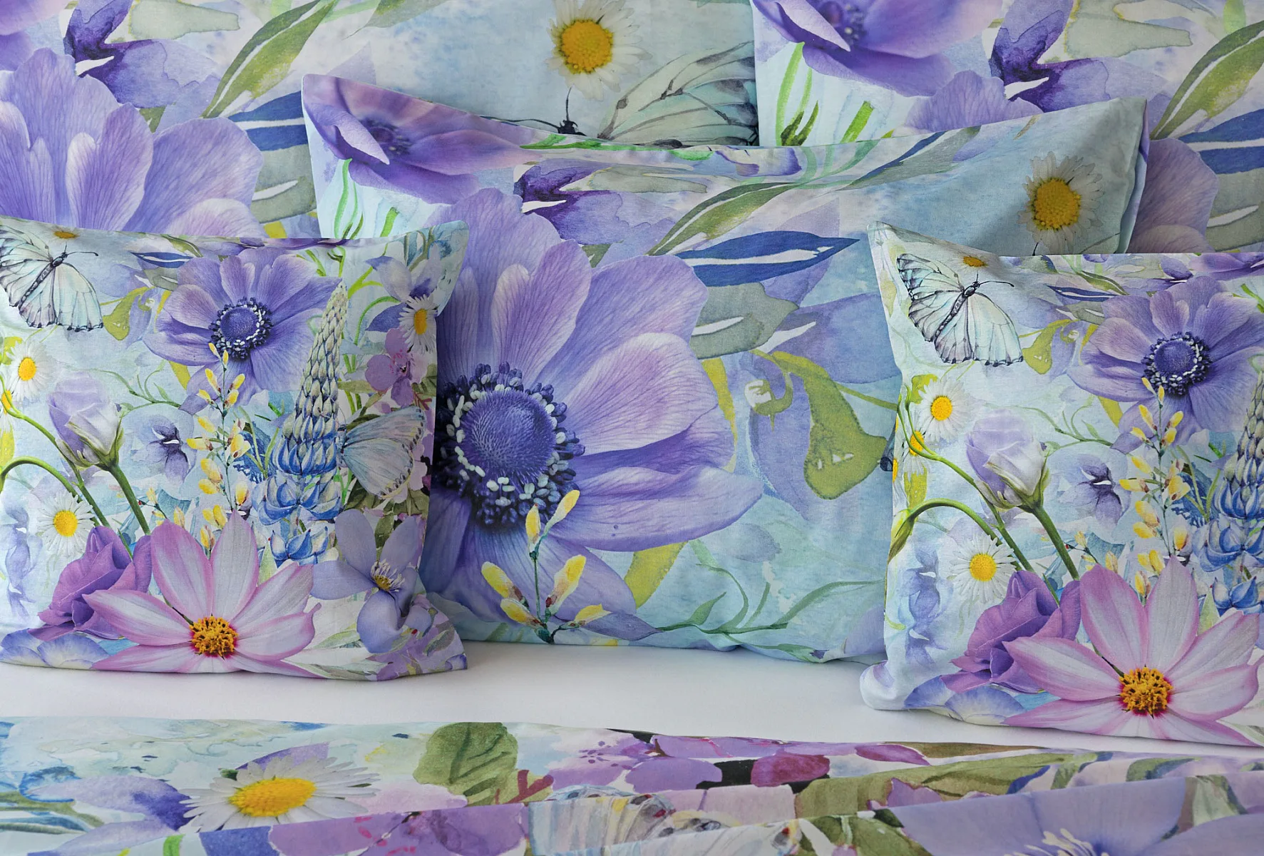 Kombinací akvarelové malby a fotoprvků vznikl poutavý květinový vzor povlečení Aurelia. Jemný bílomodrý podklad dává vyniknout květům v atraktivních fialových a růžových odstínech.