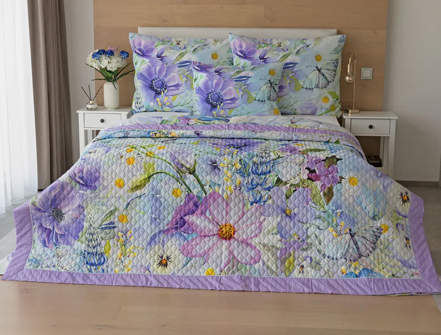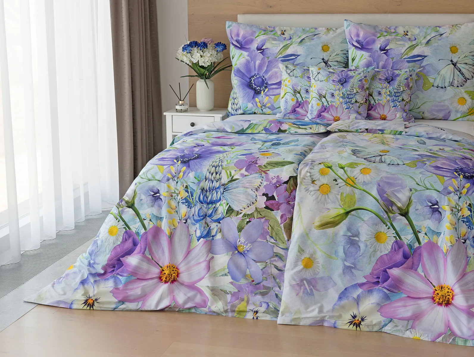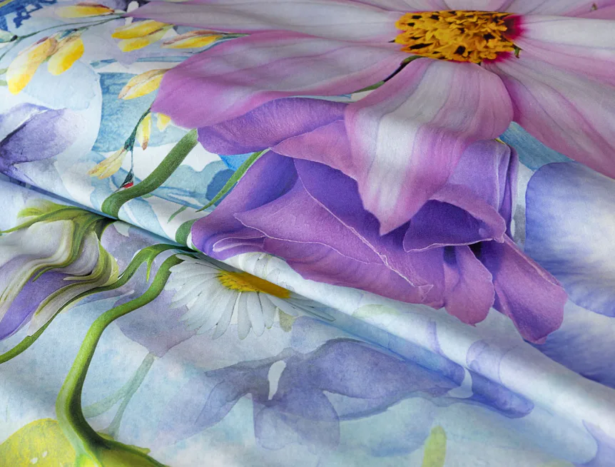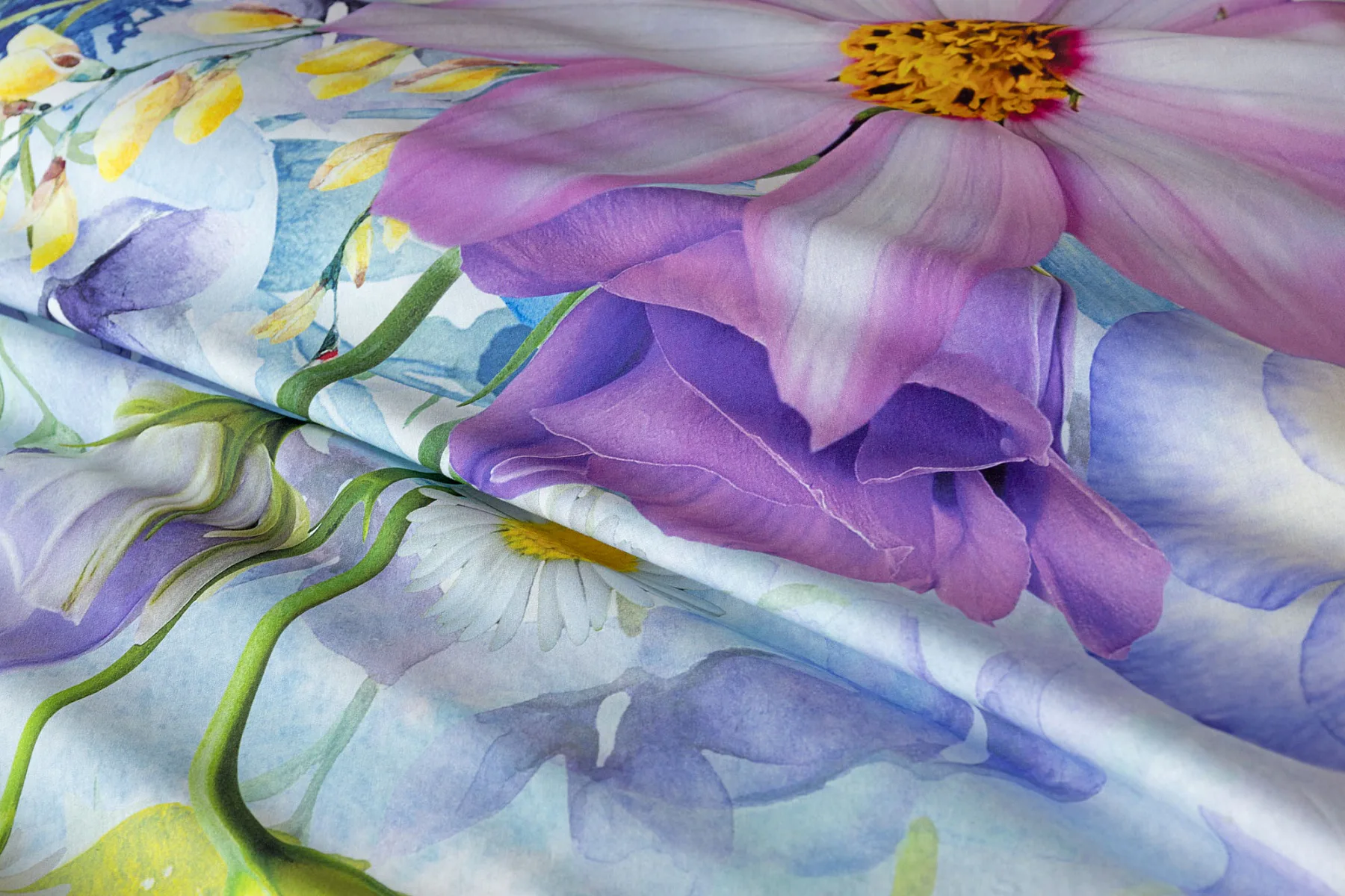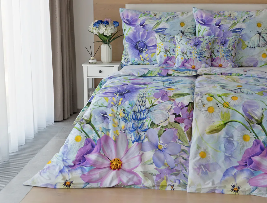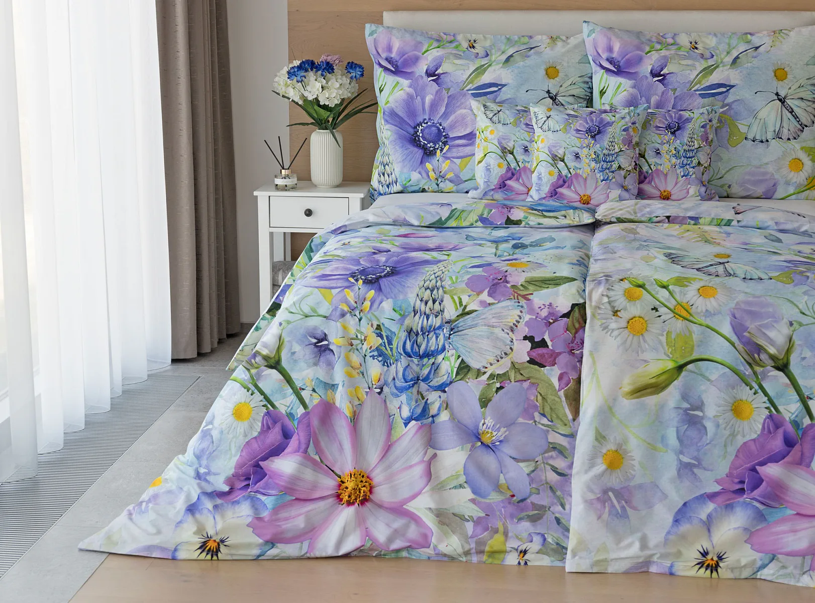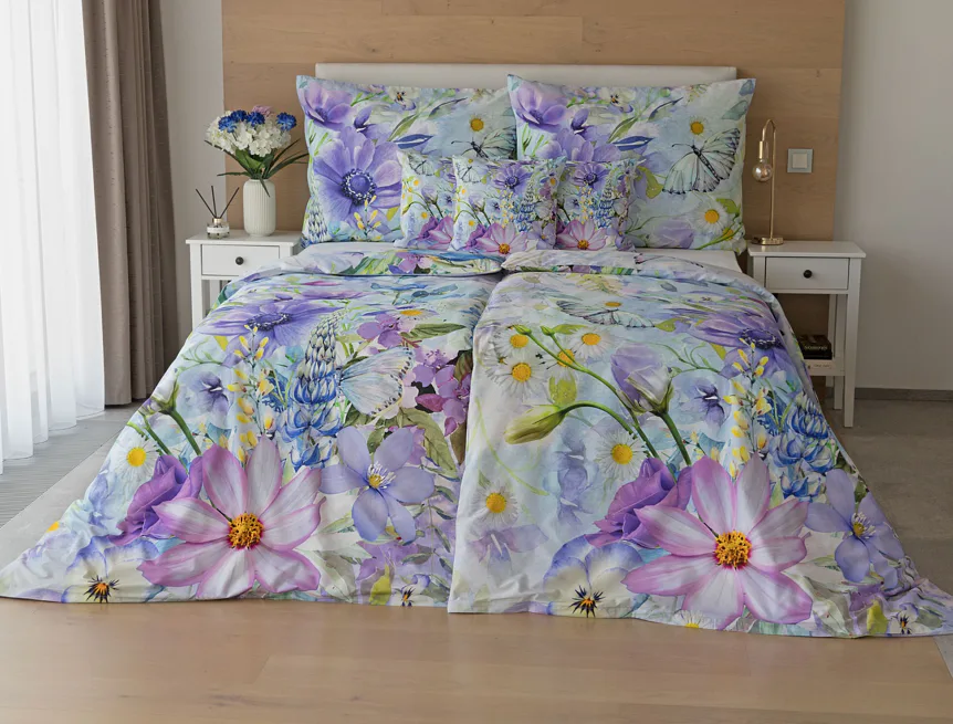 Kombinací akvarelové malby a fotoprvků vznikl poutavý květinový vzor povlečení Aurelia. Jemný bílomodrý podklad dává vyniknout květům v atraktivních fialových a růžových odstínech.