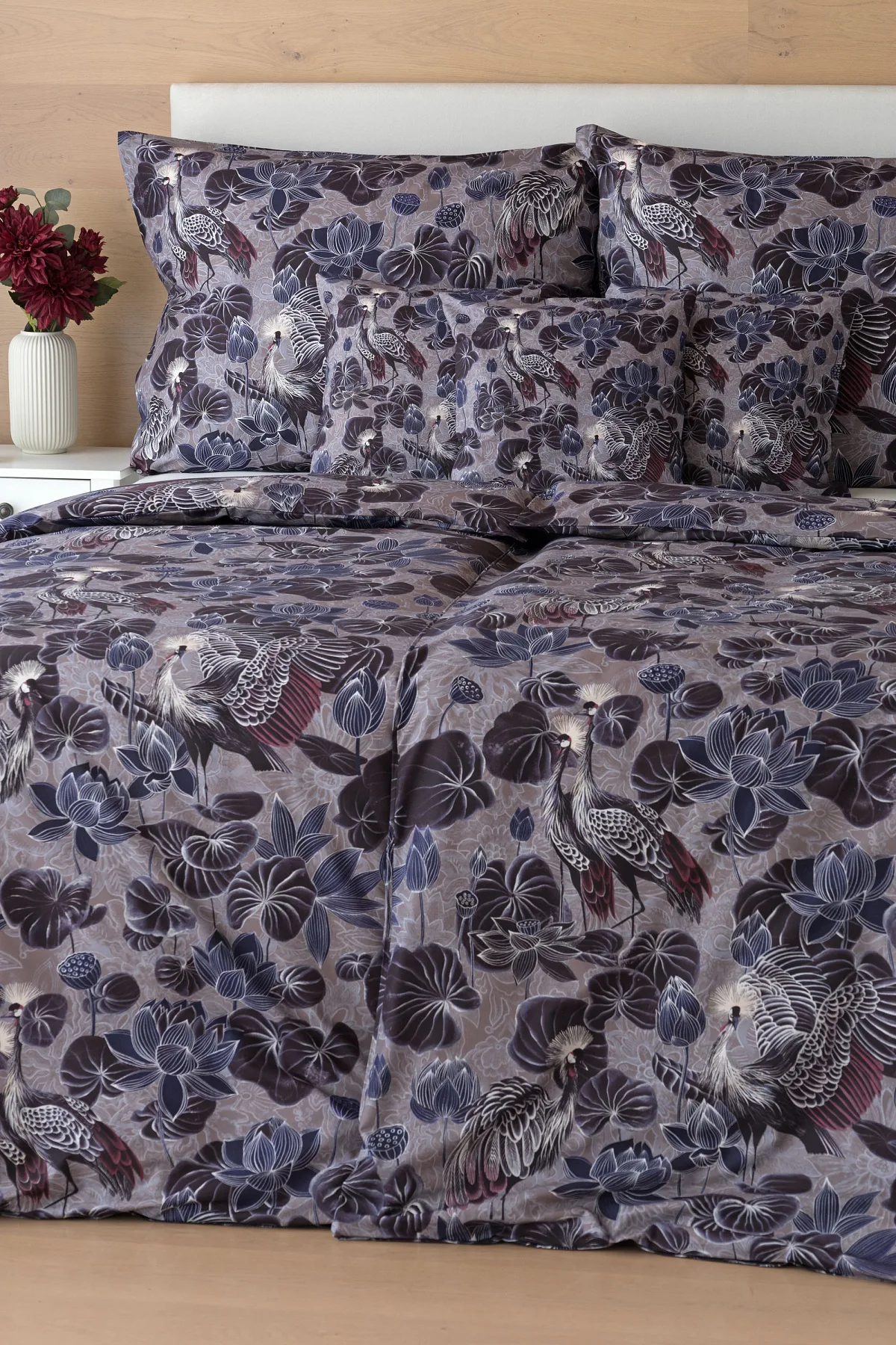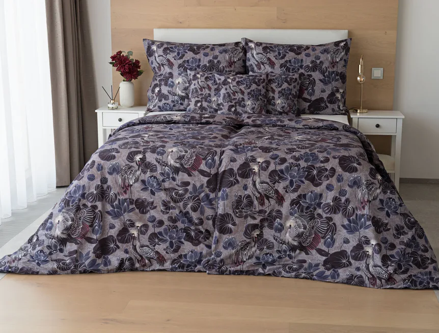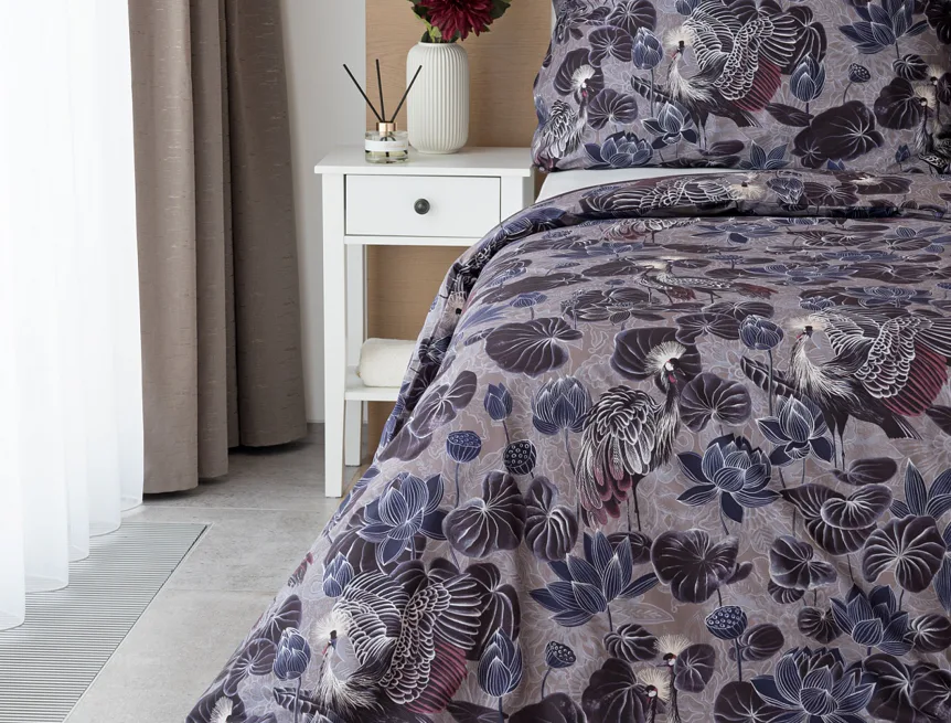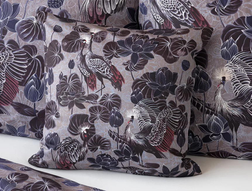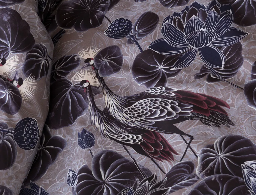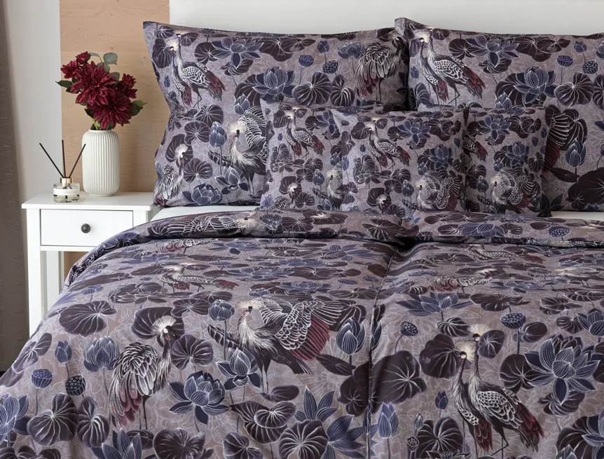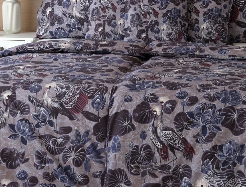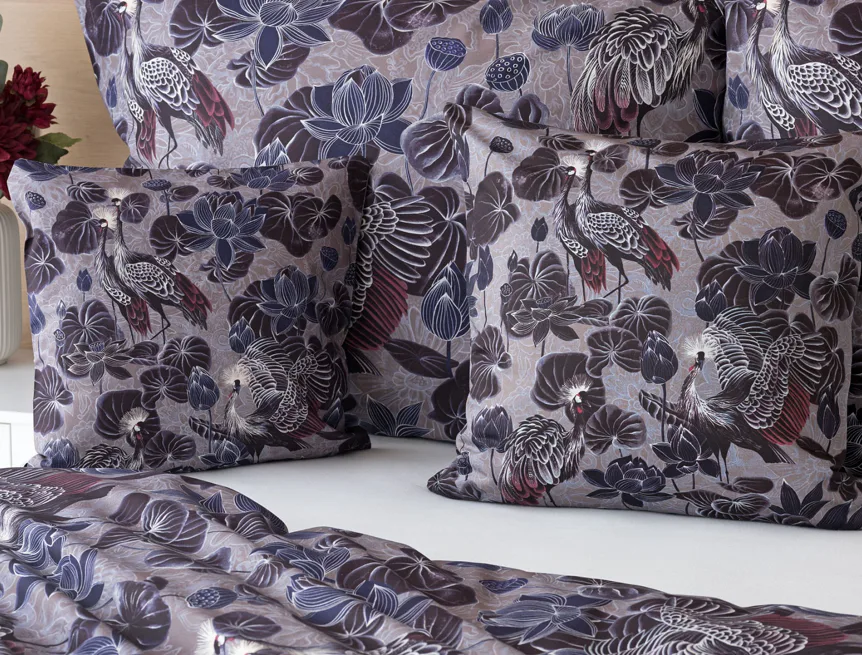 Nechte se okouzlit originálním vzhledem bavlněného povlečení Birdie. Motiv Jeřába královského je v dokonalé harmonii s florálními prvky. Magický nádech vzoru podtrhuje barevné provedení v paletě fialových, vínových a modrošedých tónů. Díky nejmodernější digitální tiskové technologii vyniká vzor v precizním detailu.
