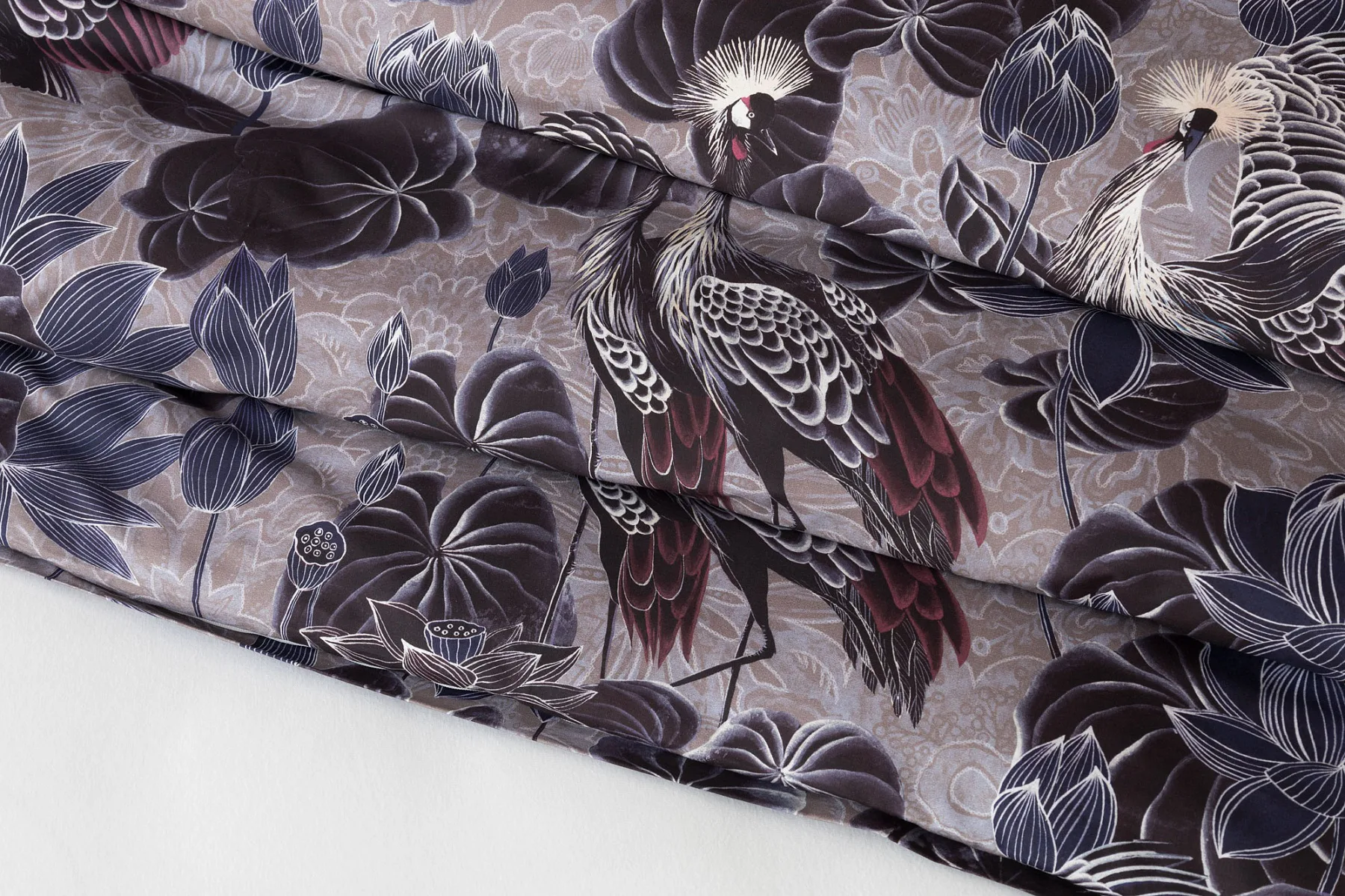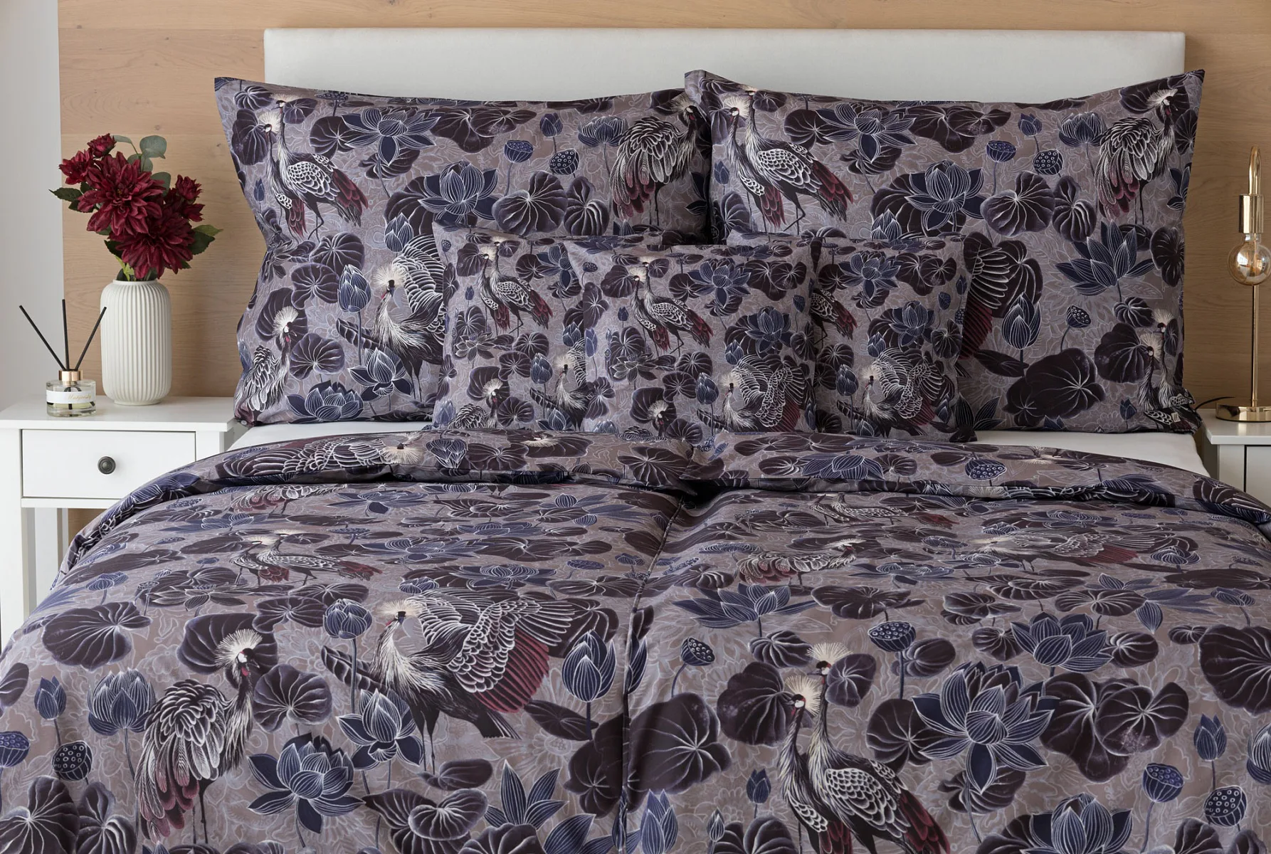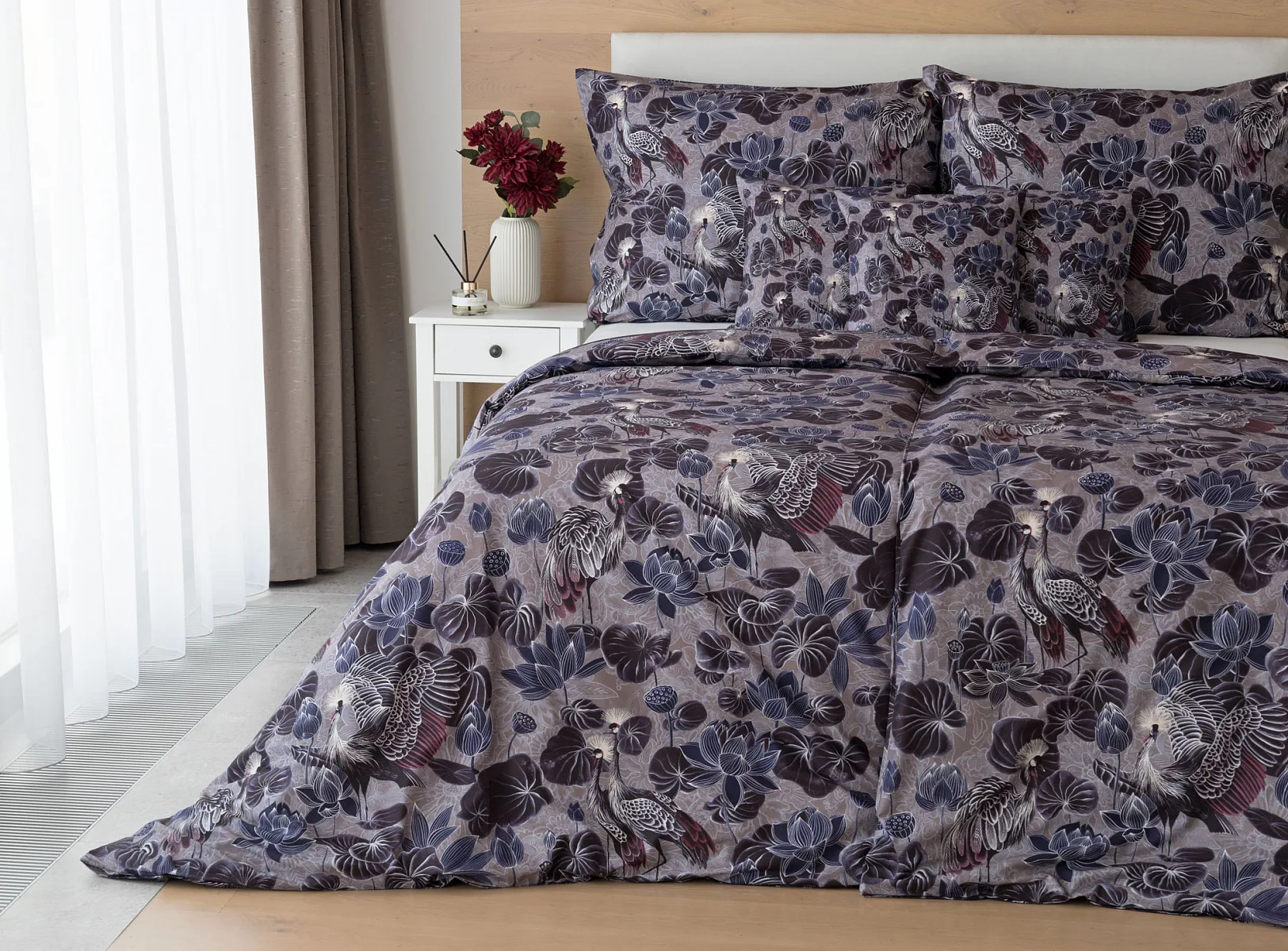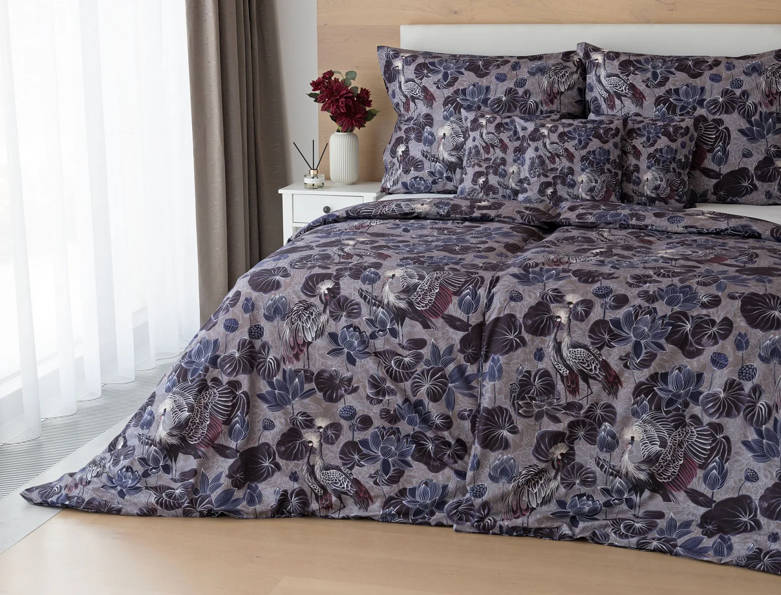 Nechte se okouzlit originálním vzhledem bavlněného povlečení Birdie. Motiv Jeřába královského je v dokonalé harmonii s florálními prvky. Magický nádech vzoru podtrhuje barevné provedení v paletě fialových, vínových a modrošedých tónů. Díky nejmodernější digitální tiskové technologii vyniká vzor v precizním detailu.