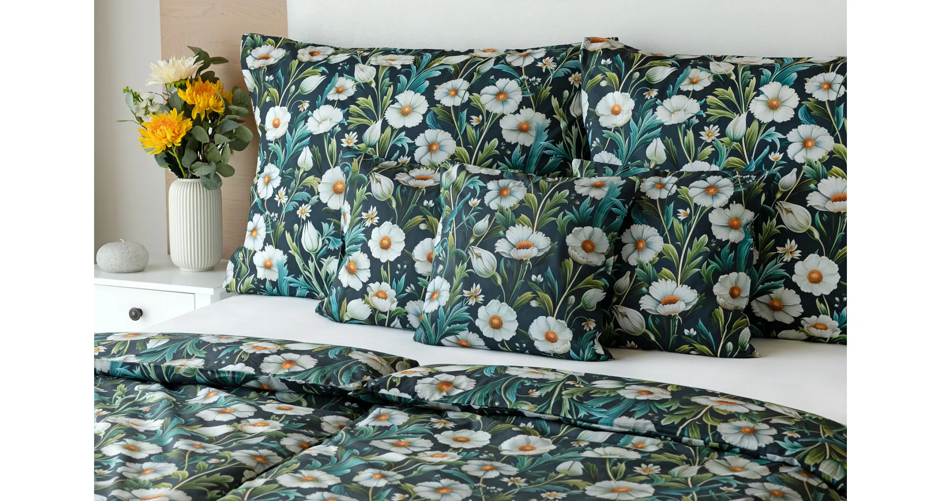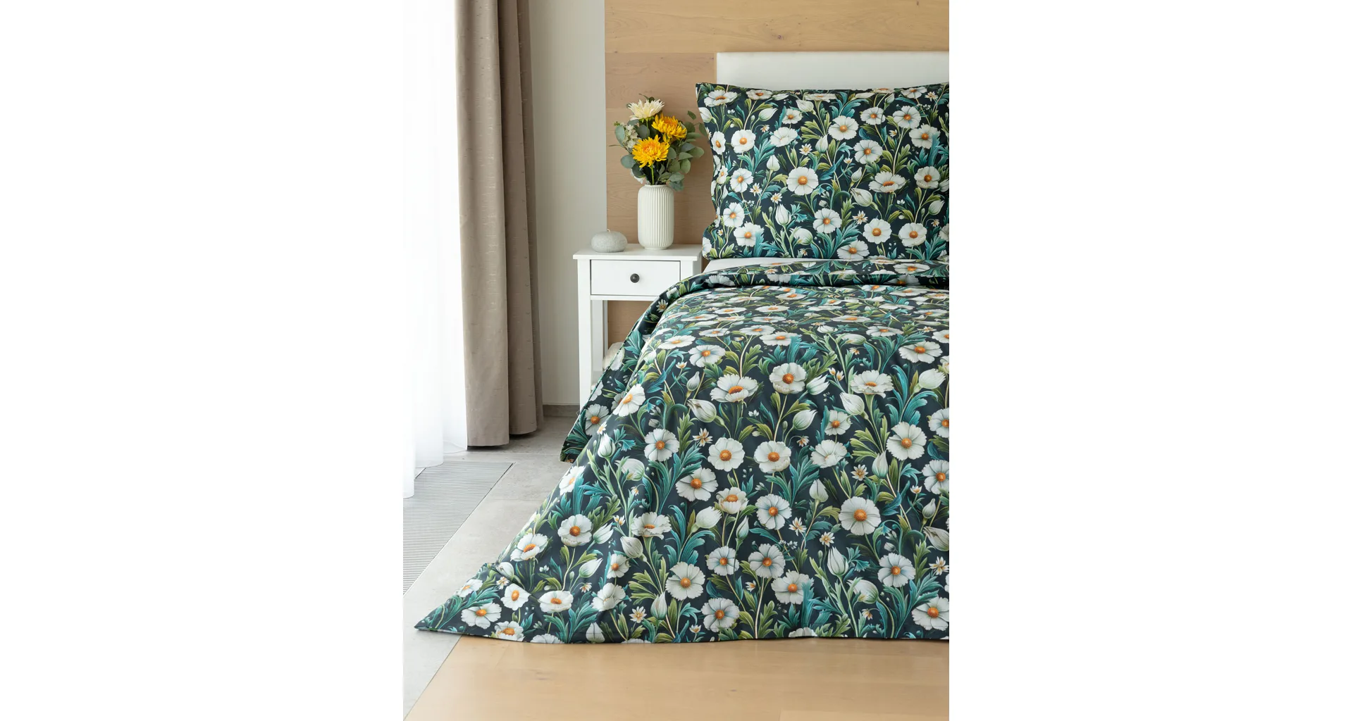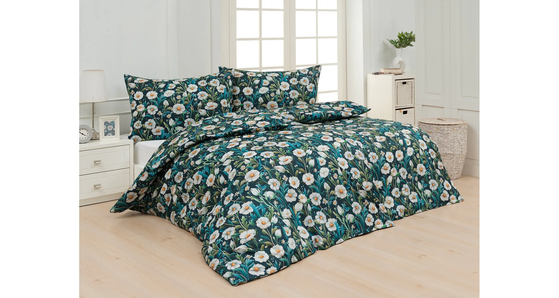 Vychutnejte si uklidňující harmonii ložního povlečení Bonnie. V okouzlujícím květinovém vzoru se snoubí pestrá paleta zelených tónů, které vynikají mezi drobnými kvítky na temně modrozeleném podkladu. Díky nejmodernější digitální tiskové technologii se povlečení pyšní precizním detailem potisku.