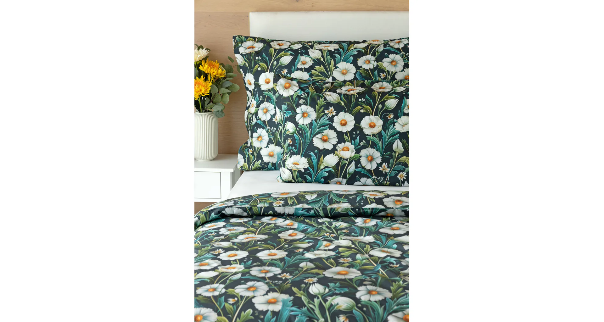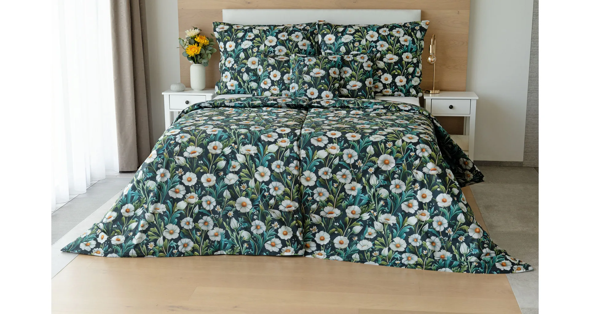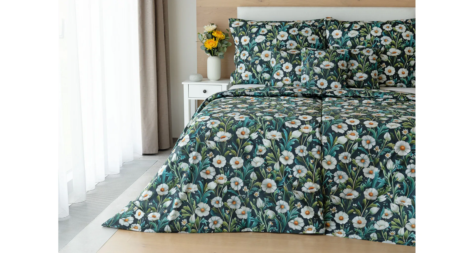 Vychutnejte si uklidňující harmonii ložního povlečení Bonnie. V okouzlujícím květinovém vzoru se snoubí pestrá paleta zelených tónů, které vynikají mezi drobnými kvítky na temně modrozeleném podkladu. Díky nejmodernější digitální tiskové technologii se povlečení pyšní precizním detailem potisku.