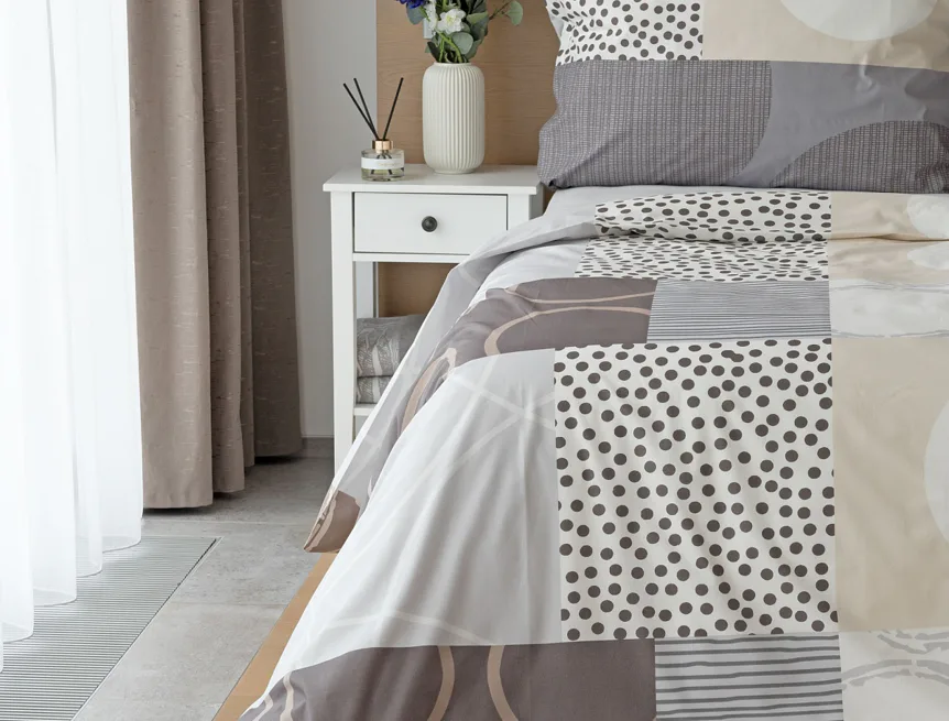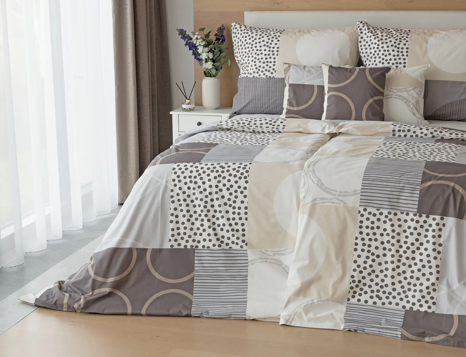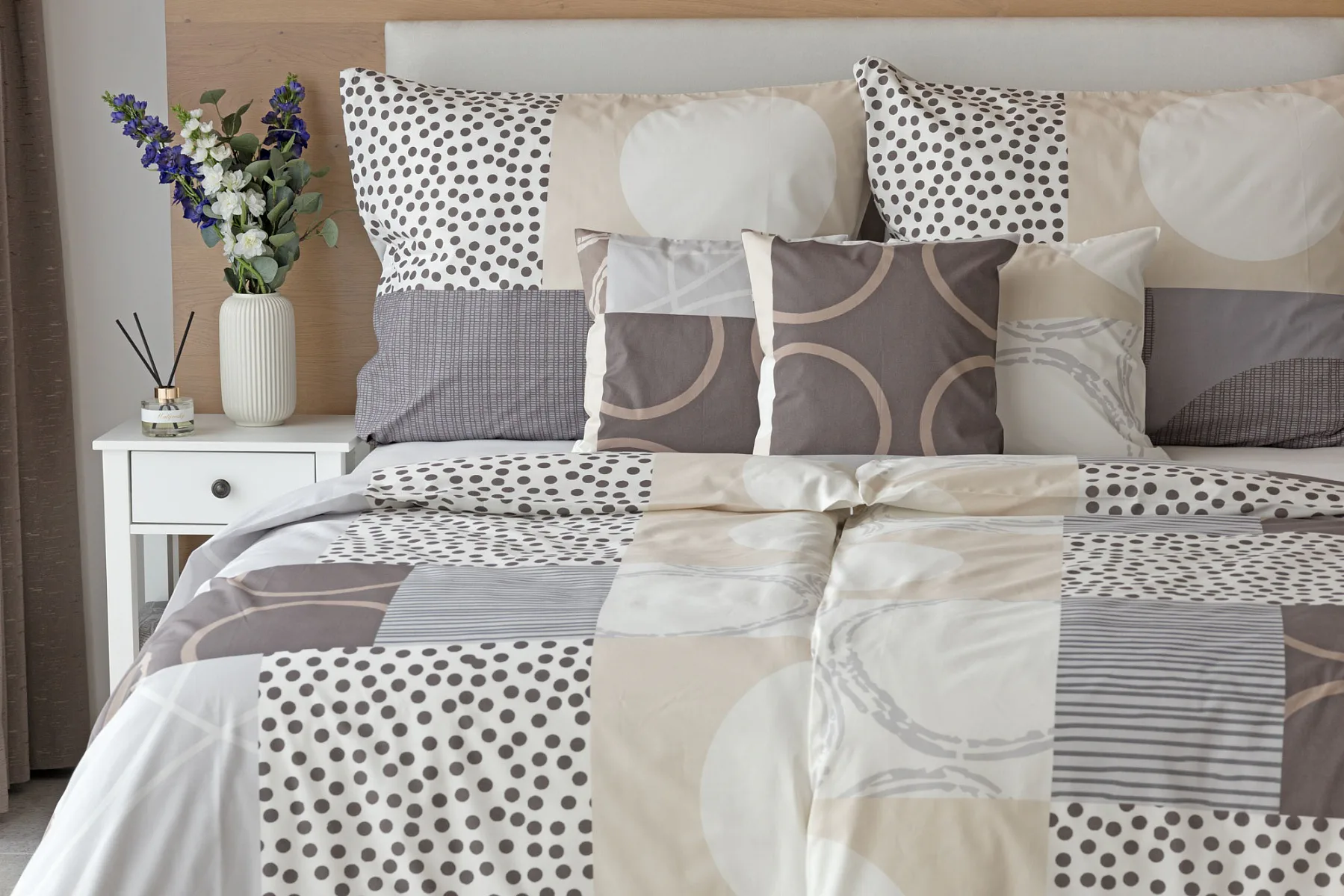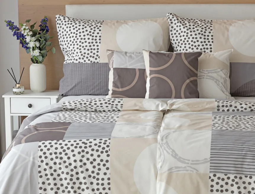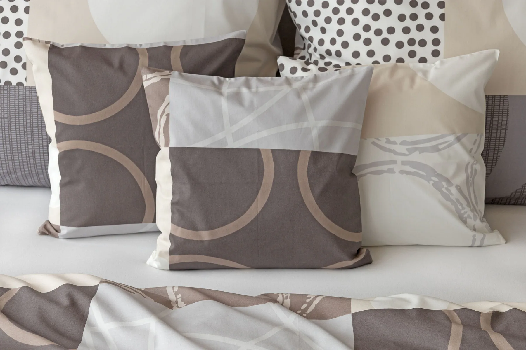 Moderní geometrický vzor povlečení Brenton kombinuje jemné odstíny hnědé, béžové a šedé na krémově bílém podkladu.