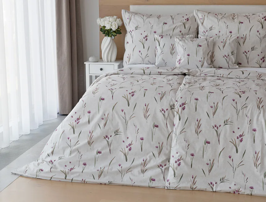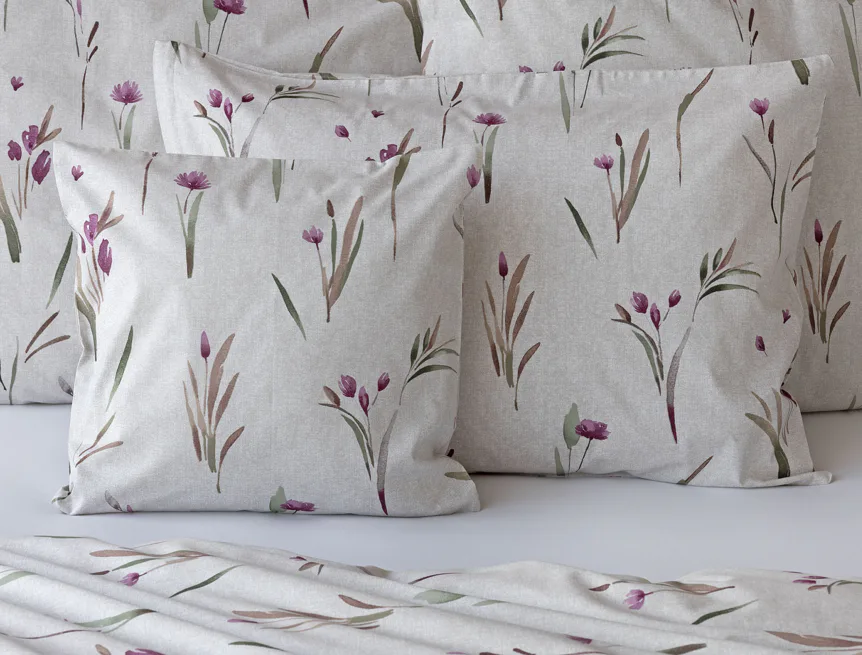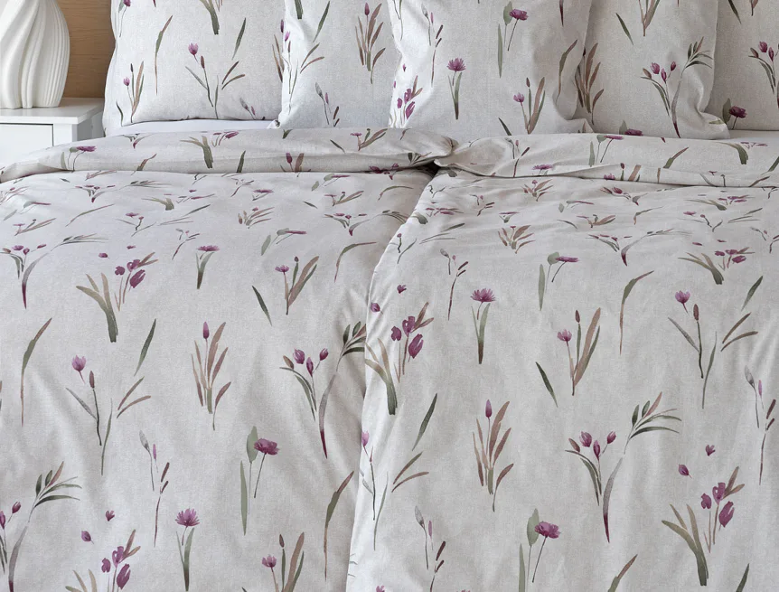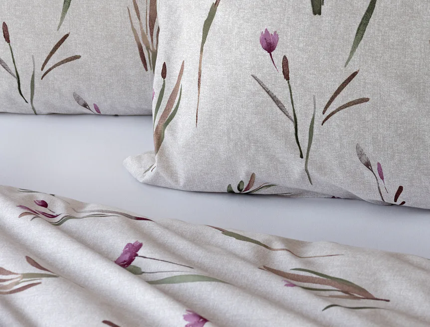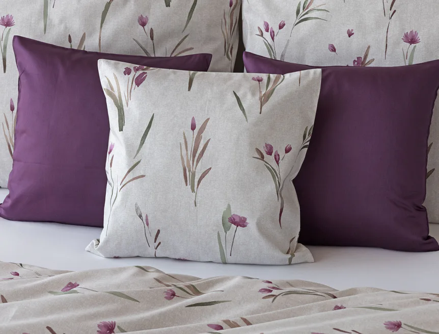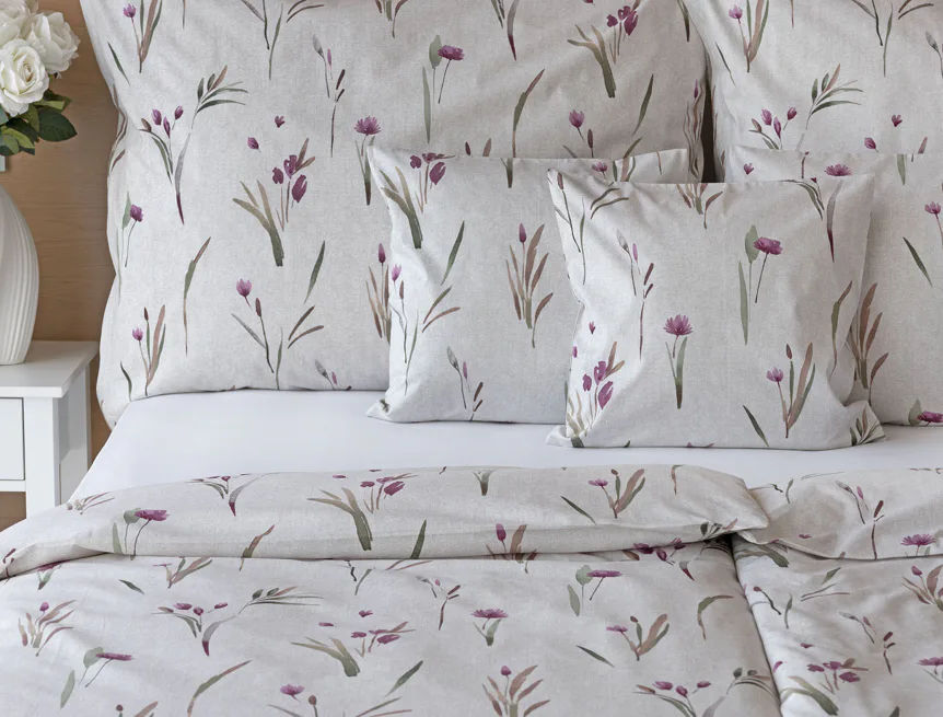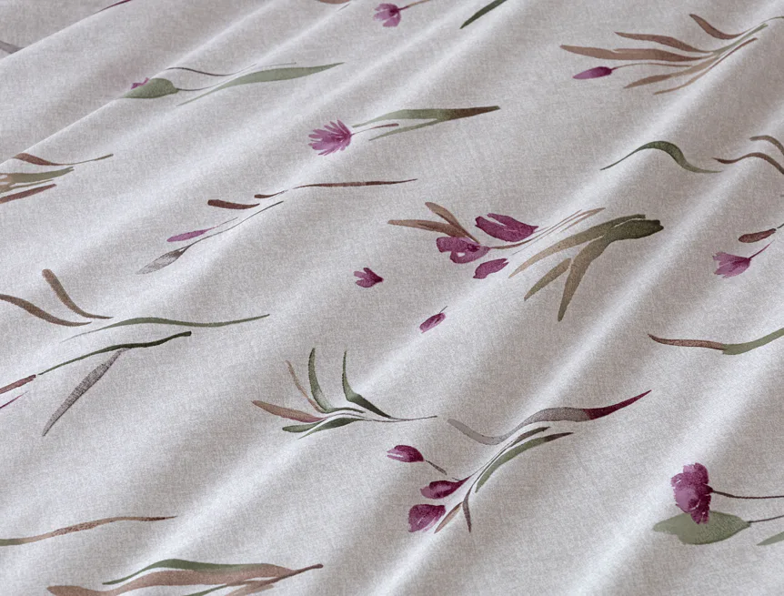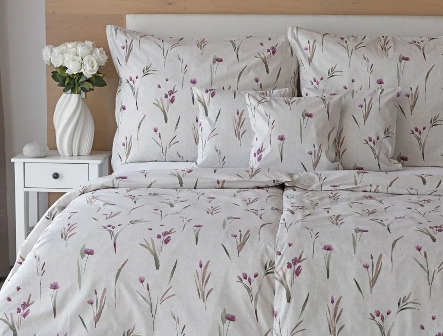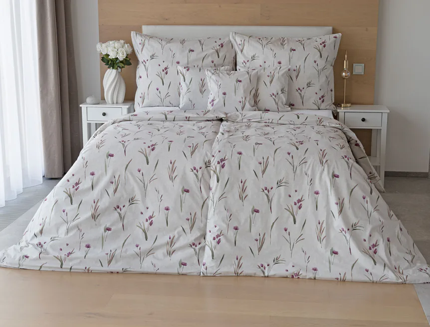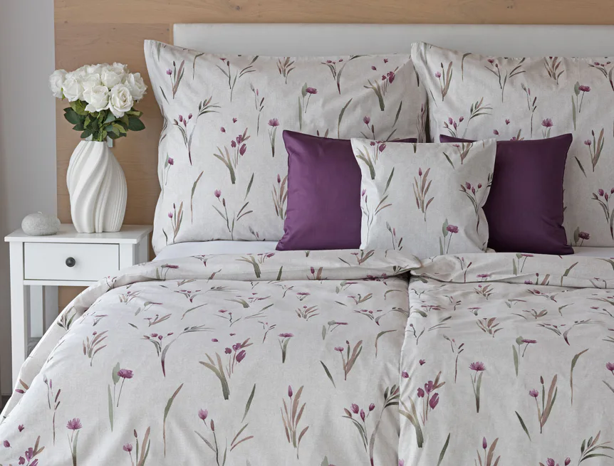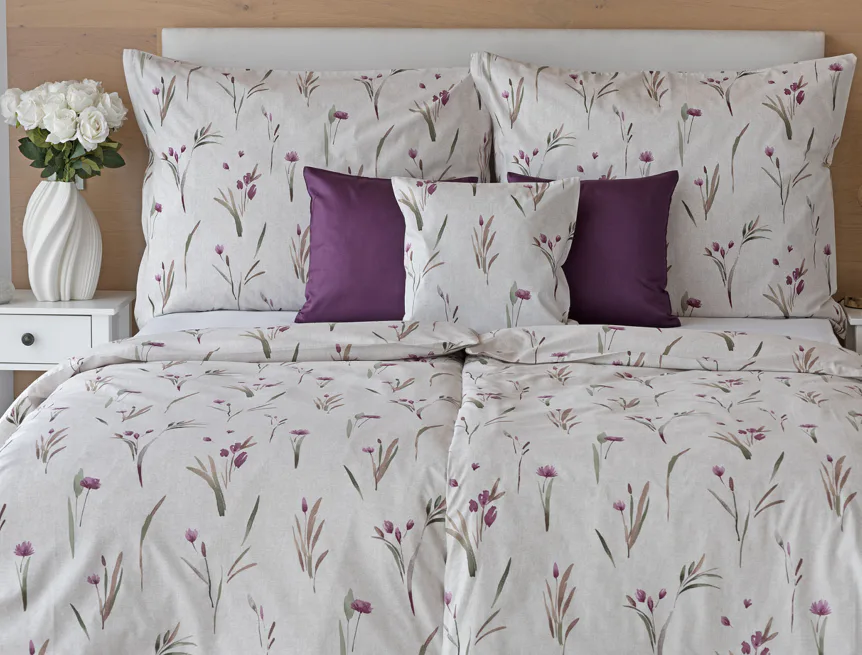 Decentní květinové povlečení Danae vdechne vaší ložnici elegantní nádech v každé roční době. Minimalistický akvarelový motiv květů a poupat v tlumených fialových a zelených tónech vyniká na šedobéžovém podkladu se strukturou jemného melíru.