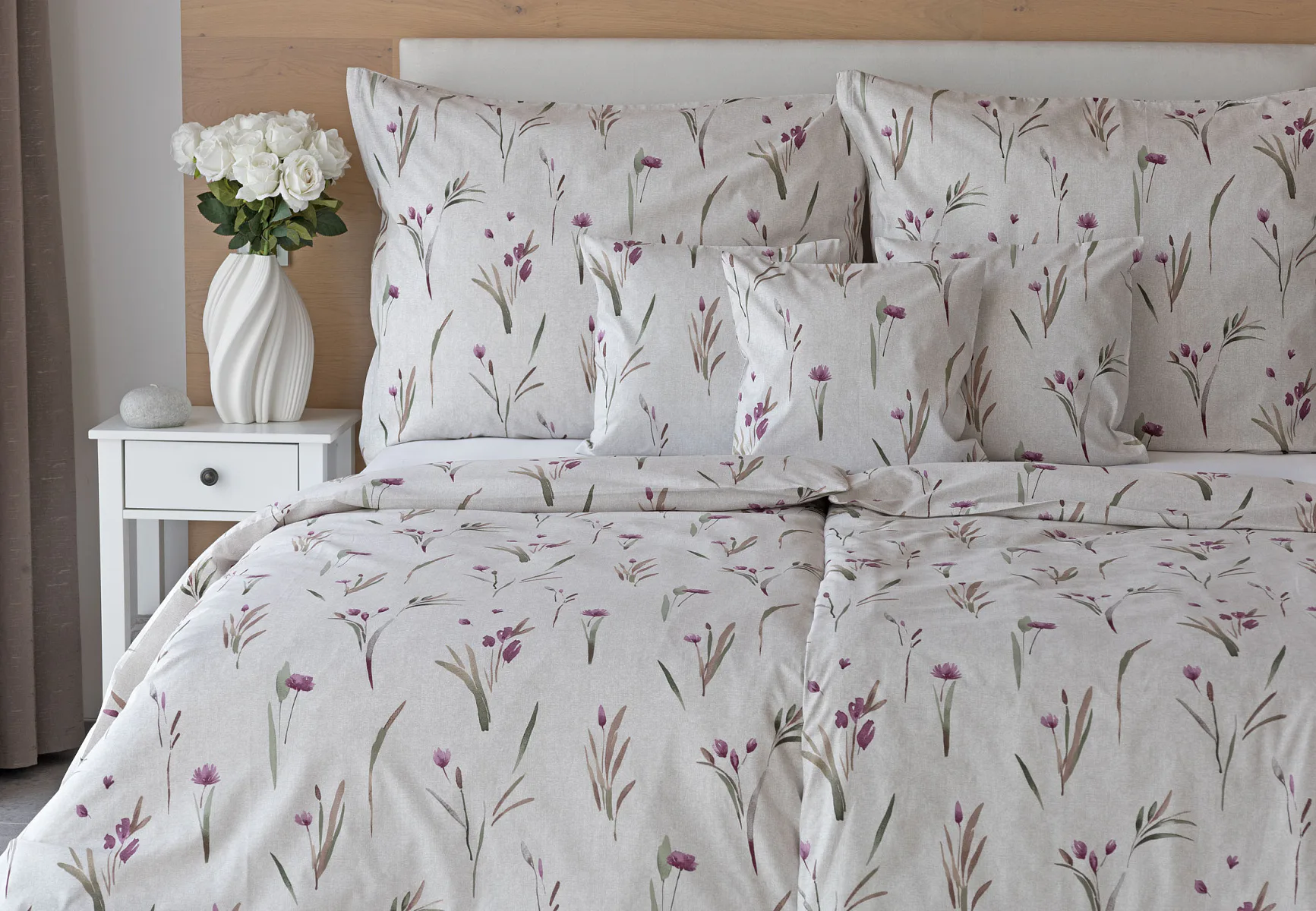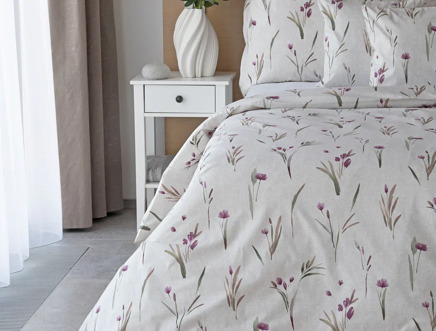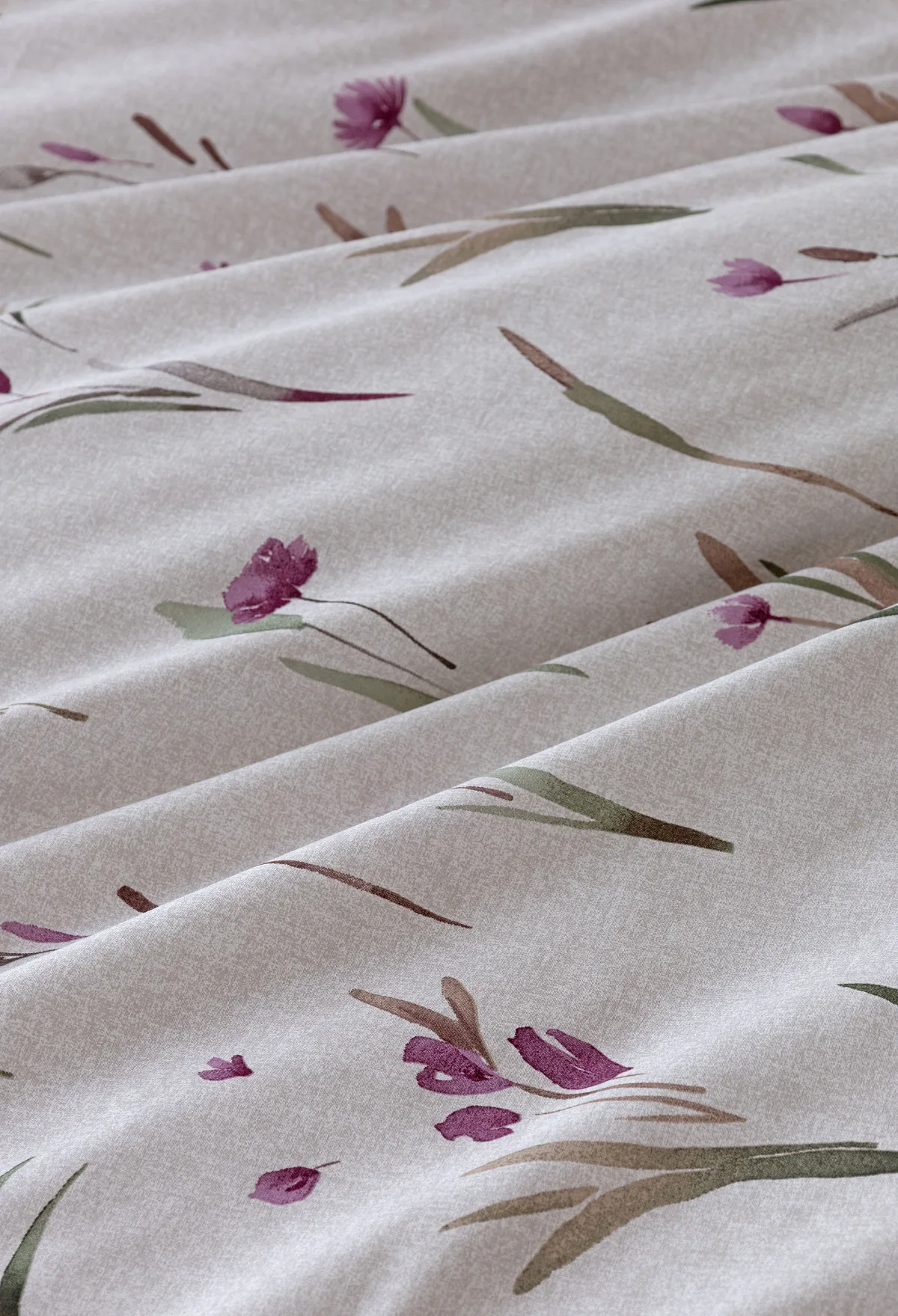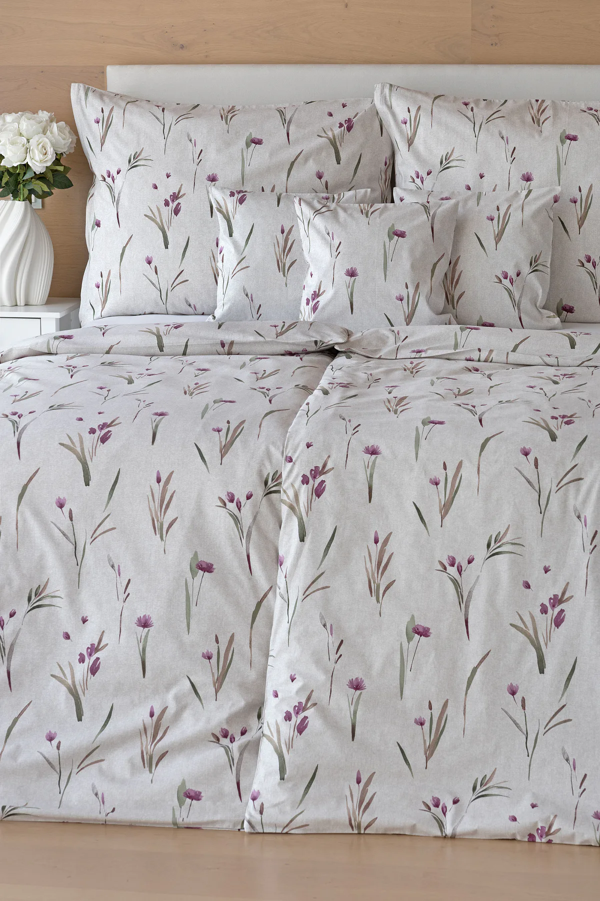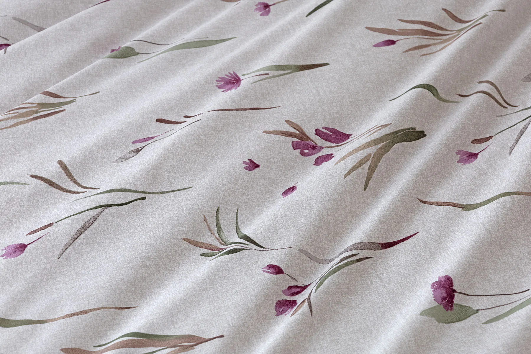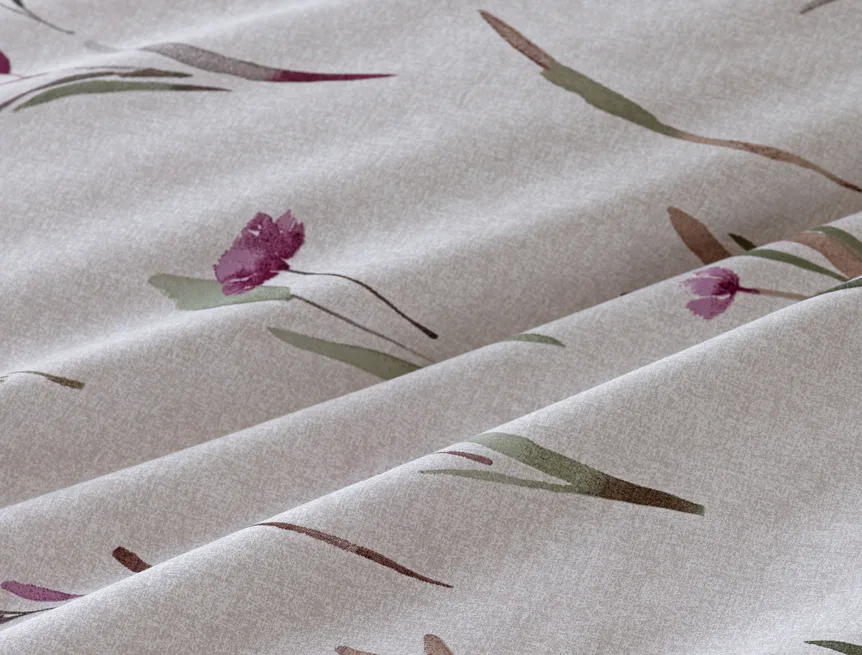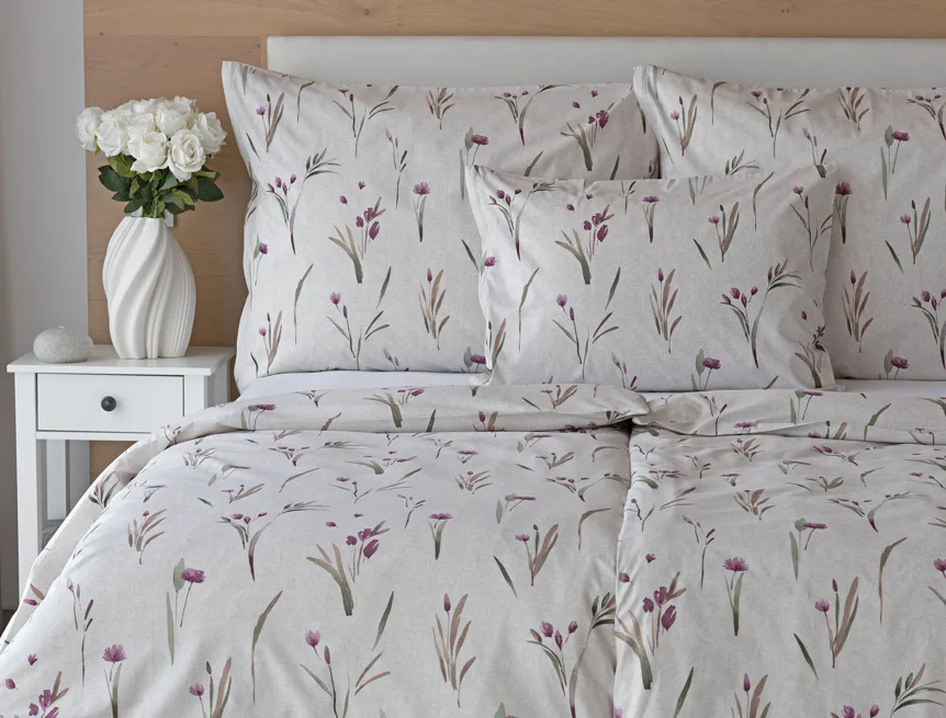Decentní květinové povlečení Danae vdechne vaší ložnici elegantní nádech v každé roční době. Minimalistický akvarelový motiv květů a poupat v tlumených fialových a zelených tónech vyniká na šedobéžovém podkladu se strukturou jemného melíru.