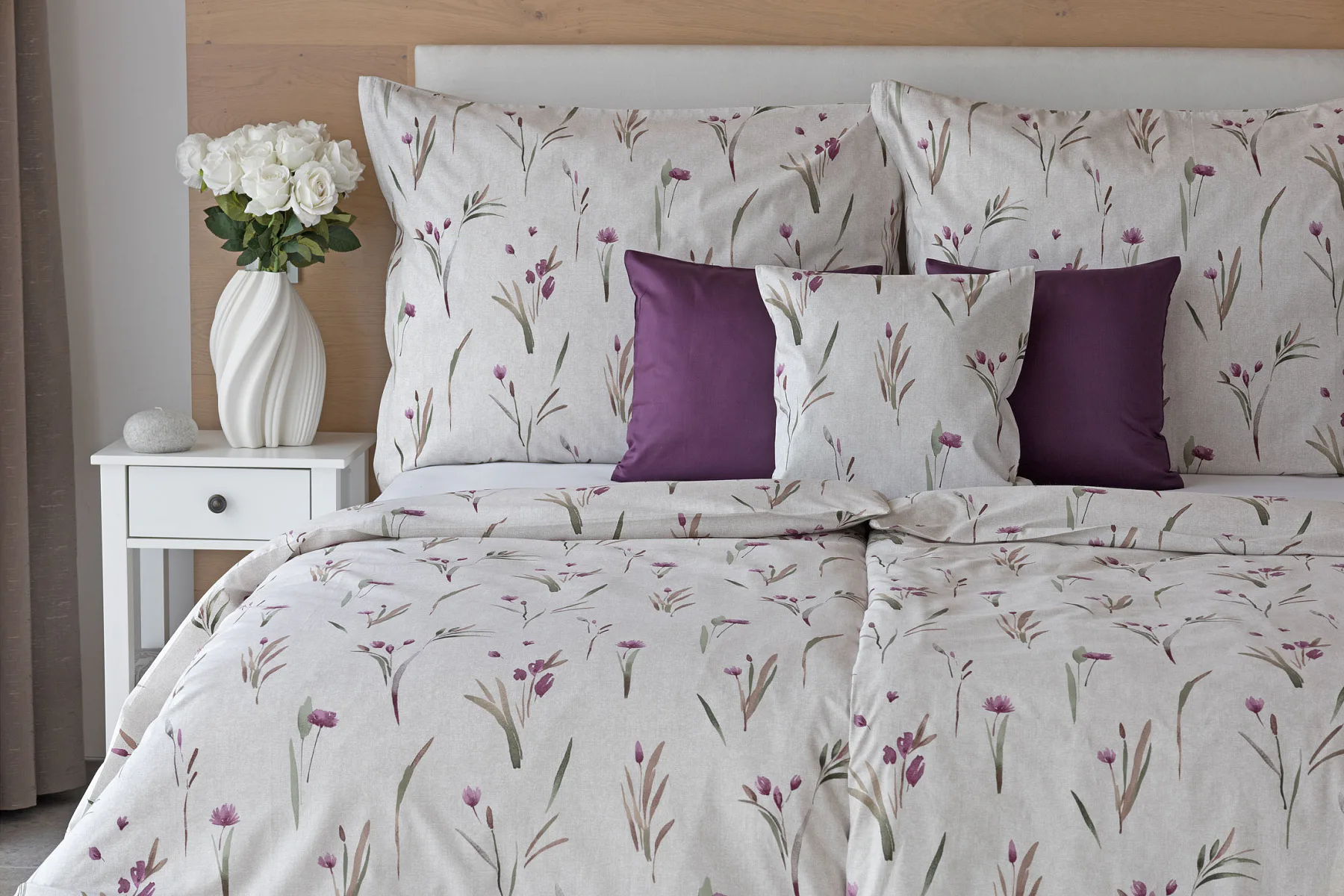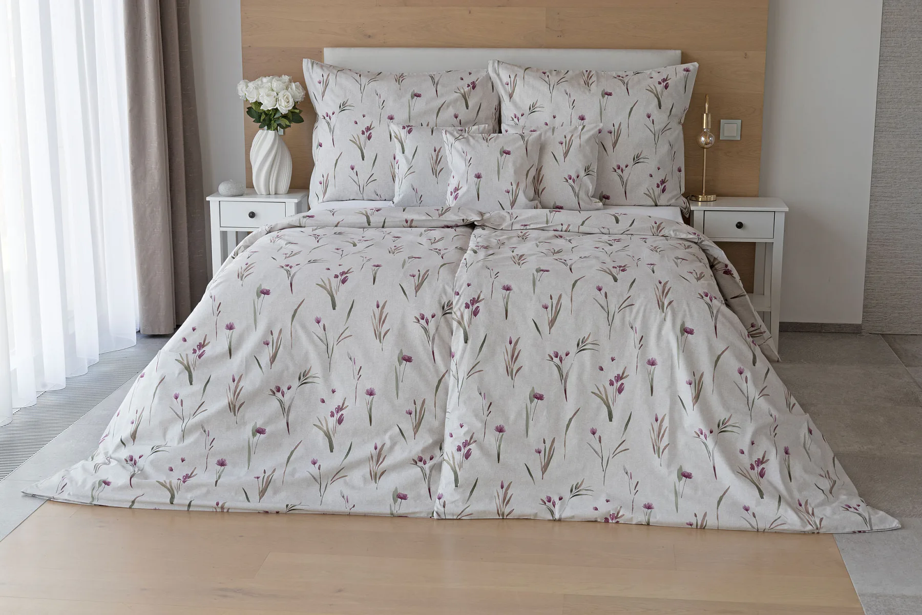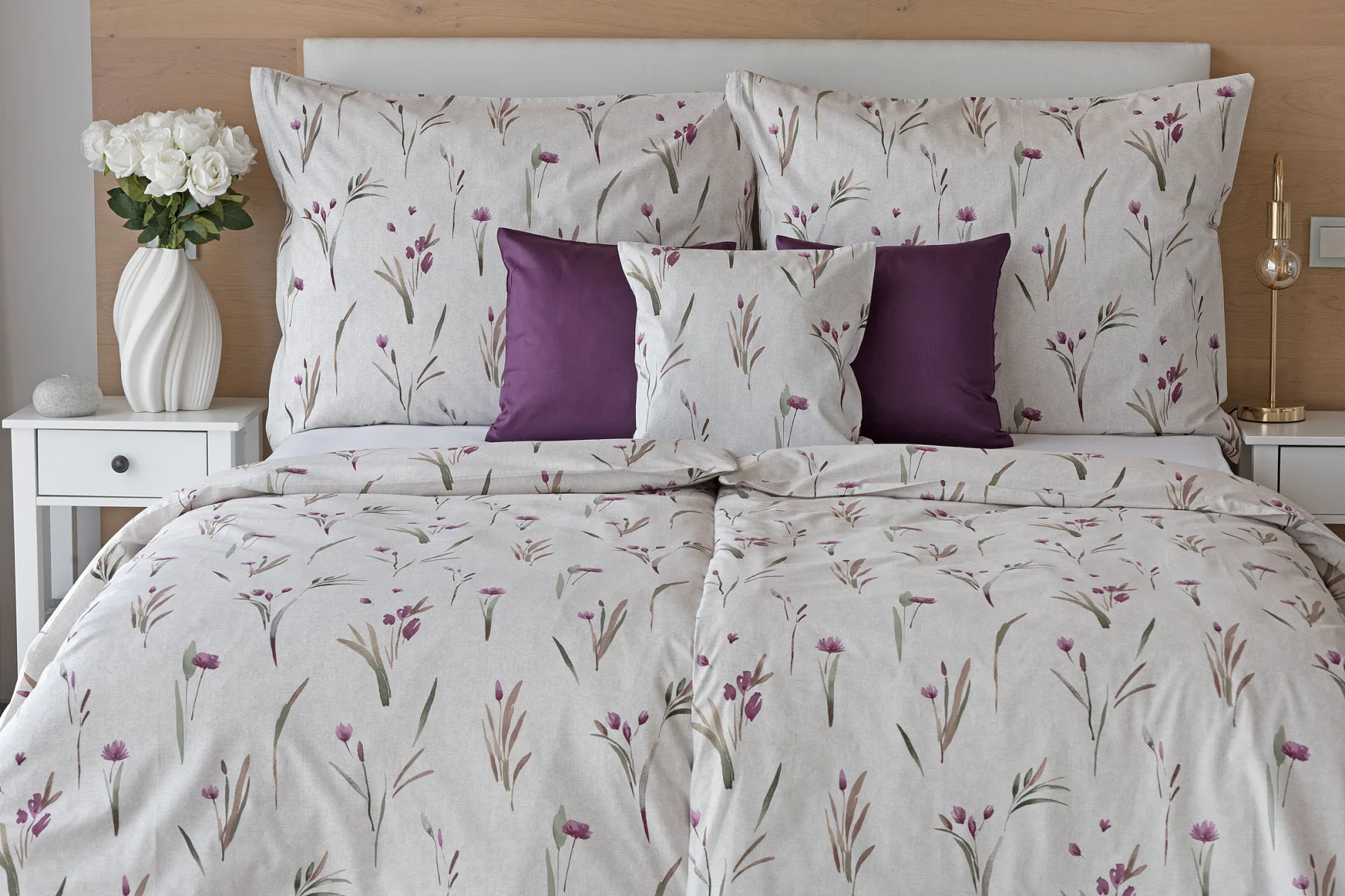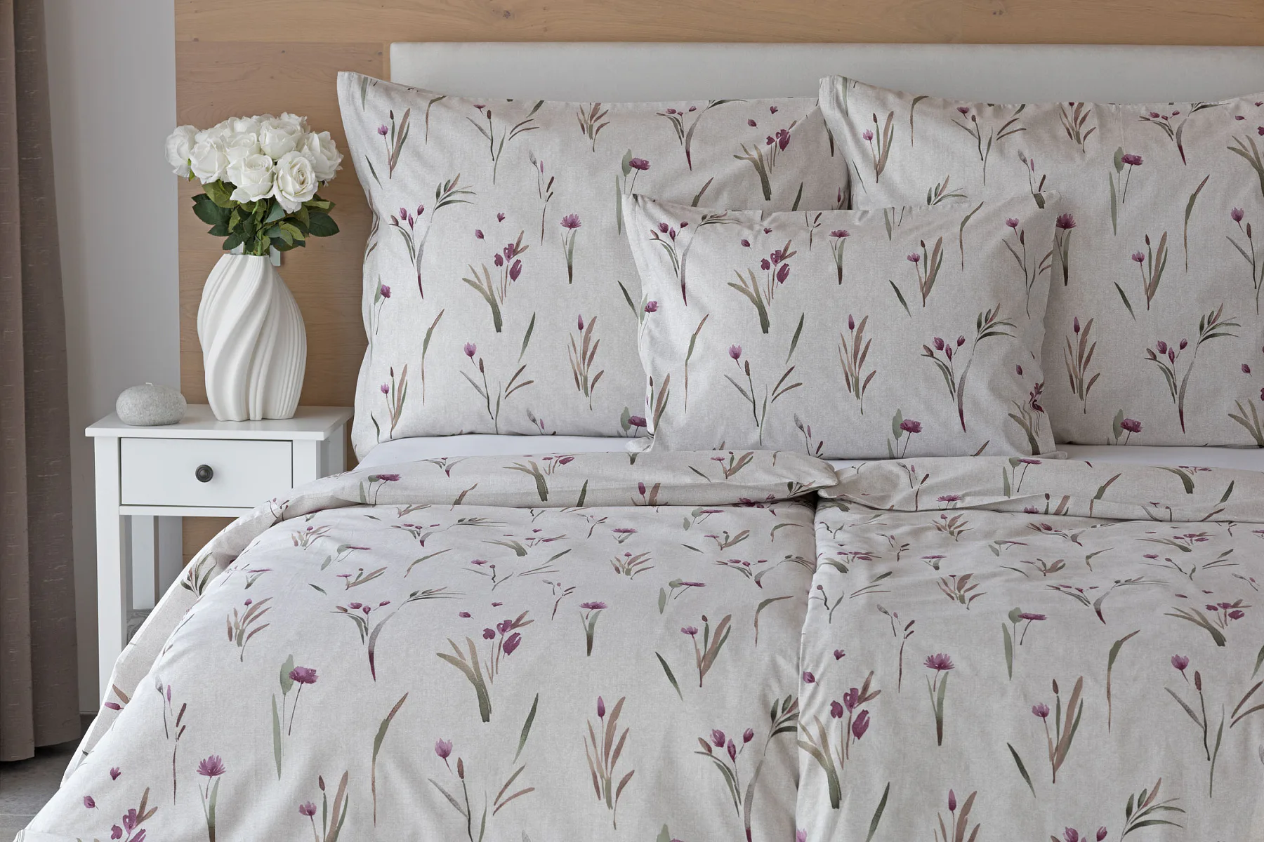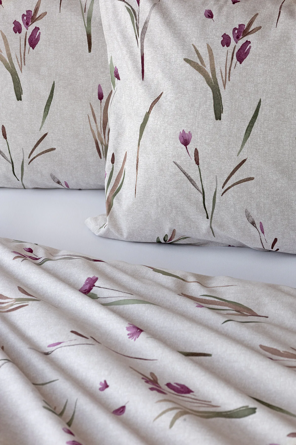 Decentní květinové povlečení Danae vdechne vaší ložnici elegantní nádech v každé roční době. Minimalistický akvarelový motiv květů a poupat v tlumených fialových a zelených tónech vyniká na šedobéžovém podkladu se strukturou jemného melíru.