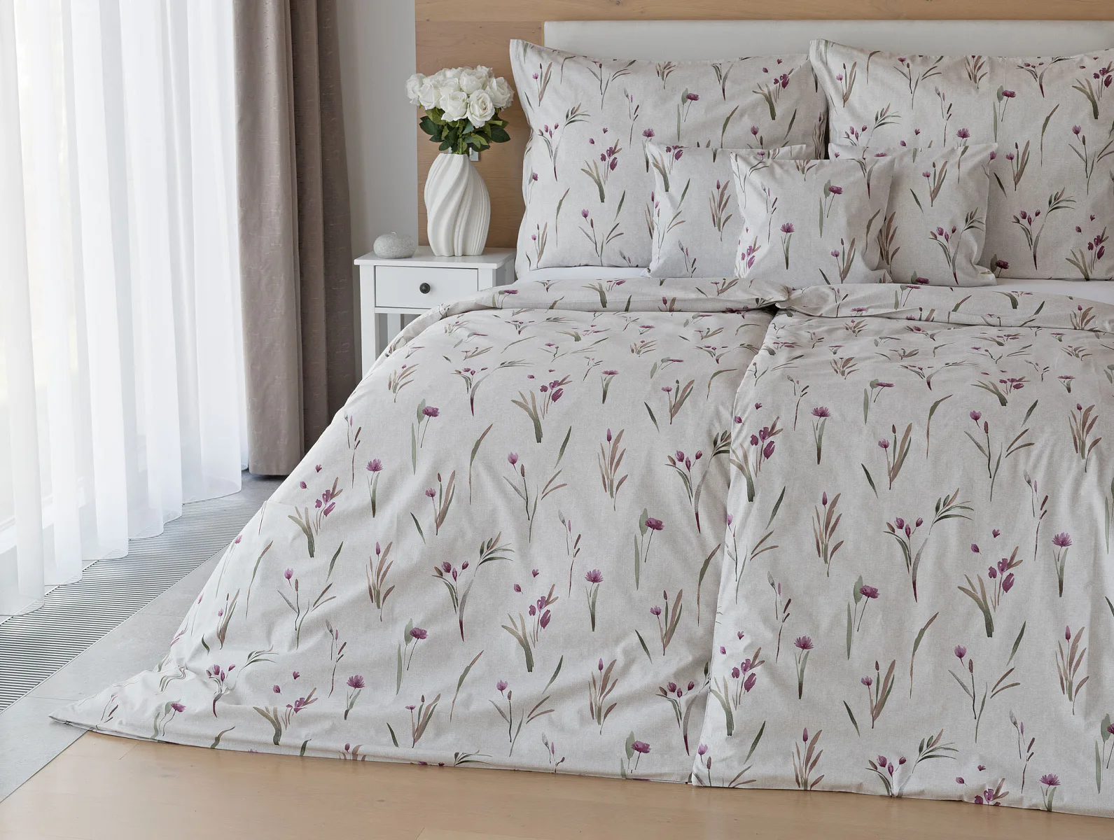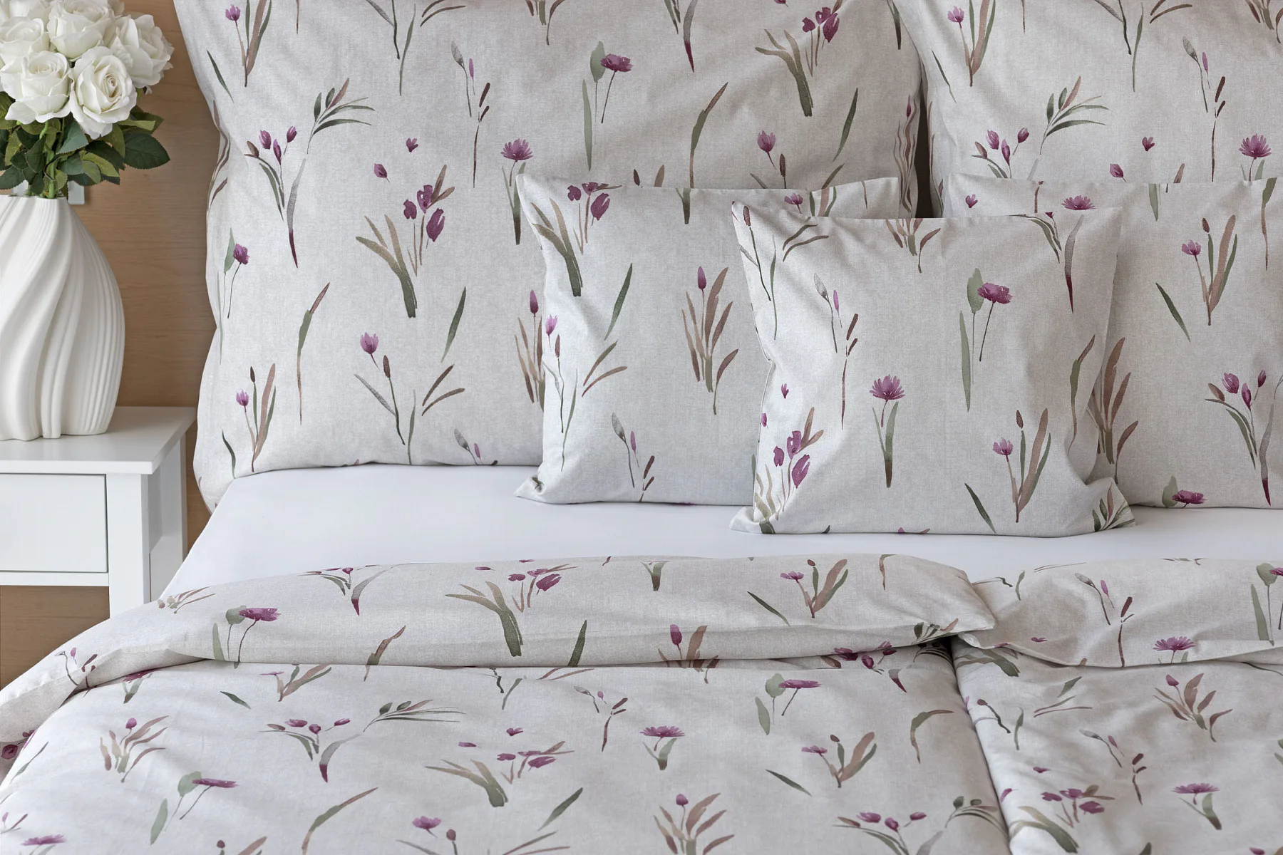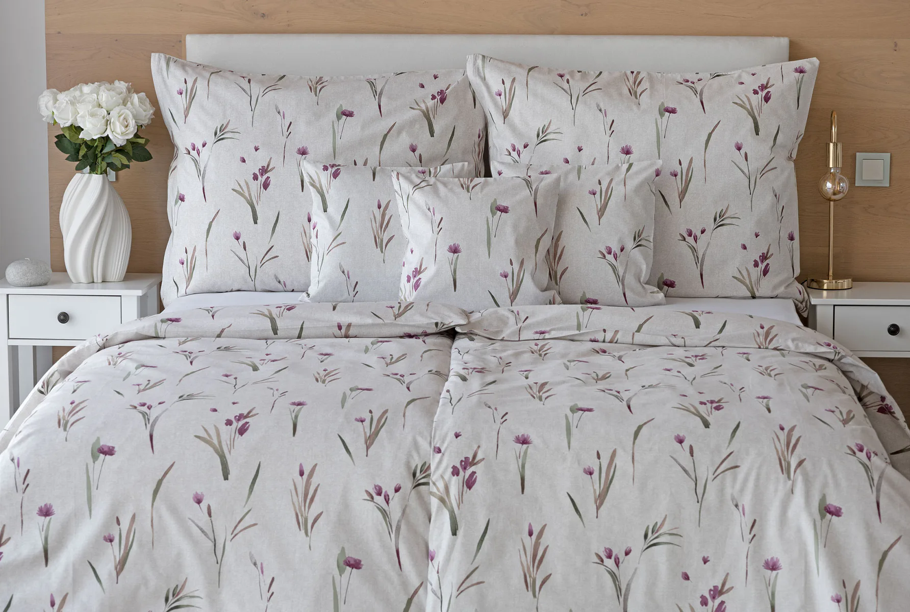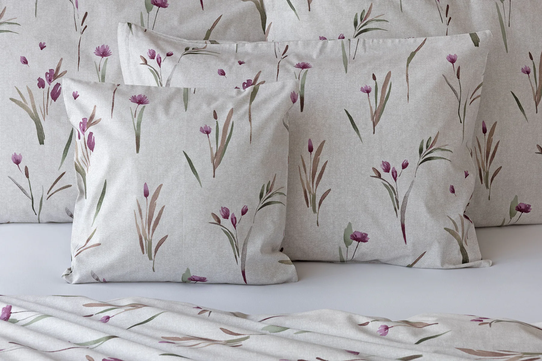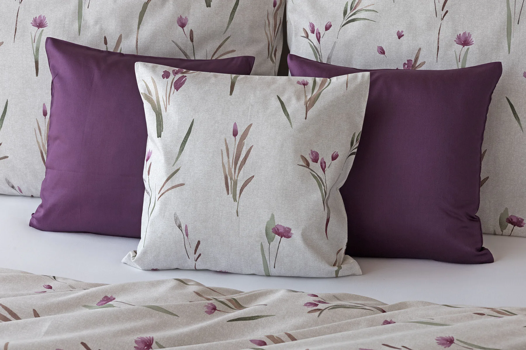 Decentní květinové povlečení Danae vdechne vaší ložnici elegantní nádech v každé roční době. Minimalistický akvarelový motiv květů a poupat v tlumených fialových a zelených tónech vyniká na šedobéžovém podkladu se strukturou jemného melíru.