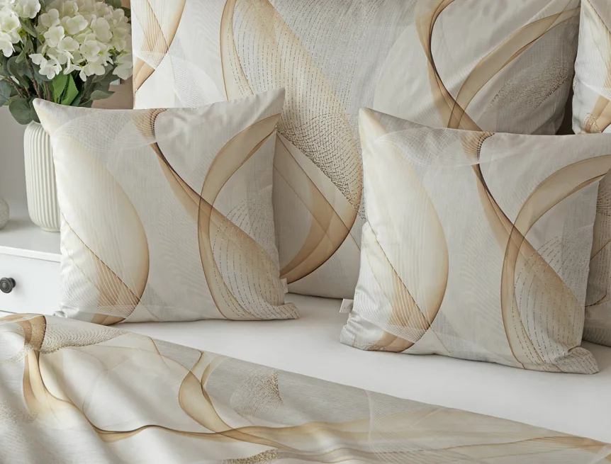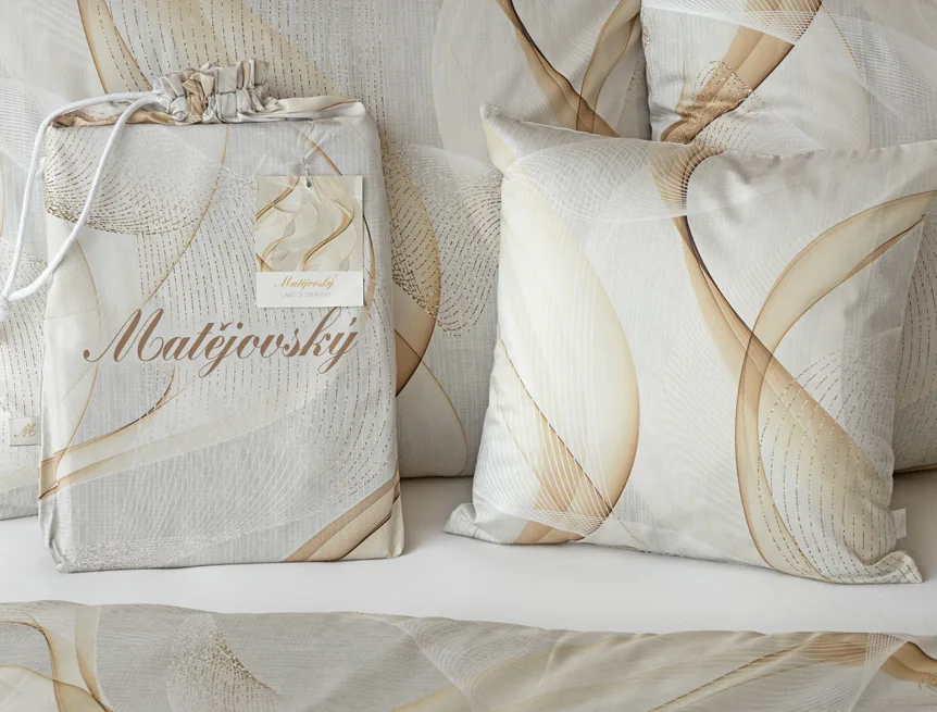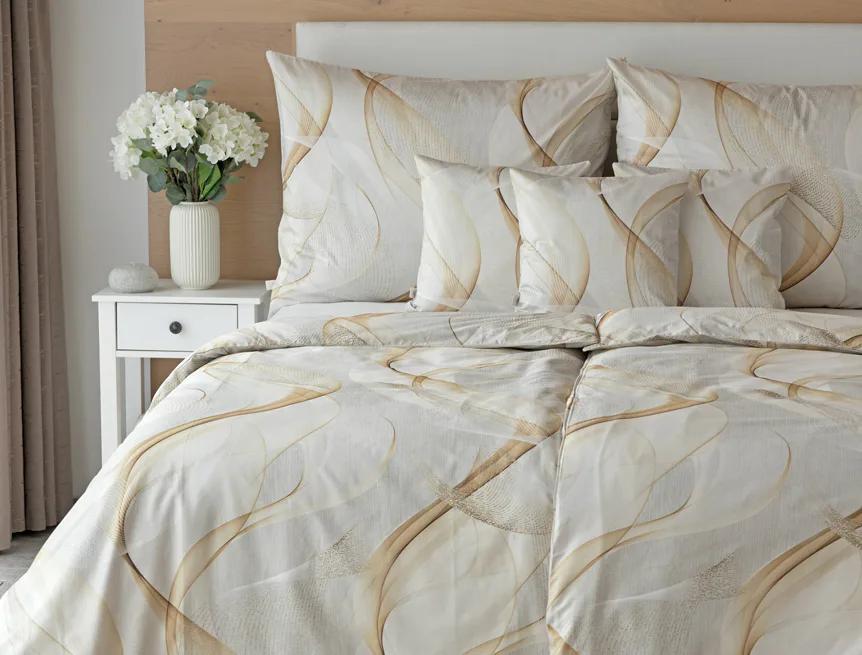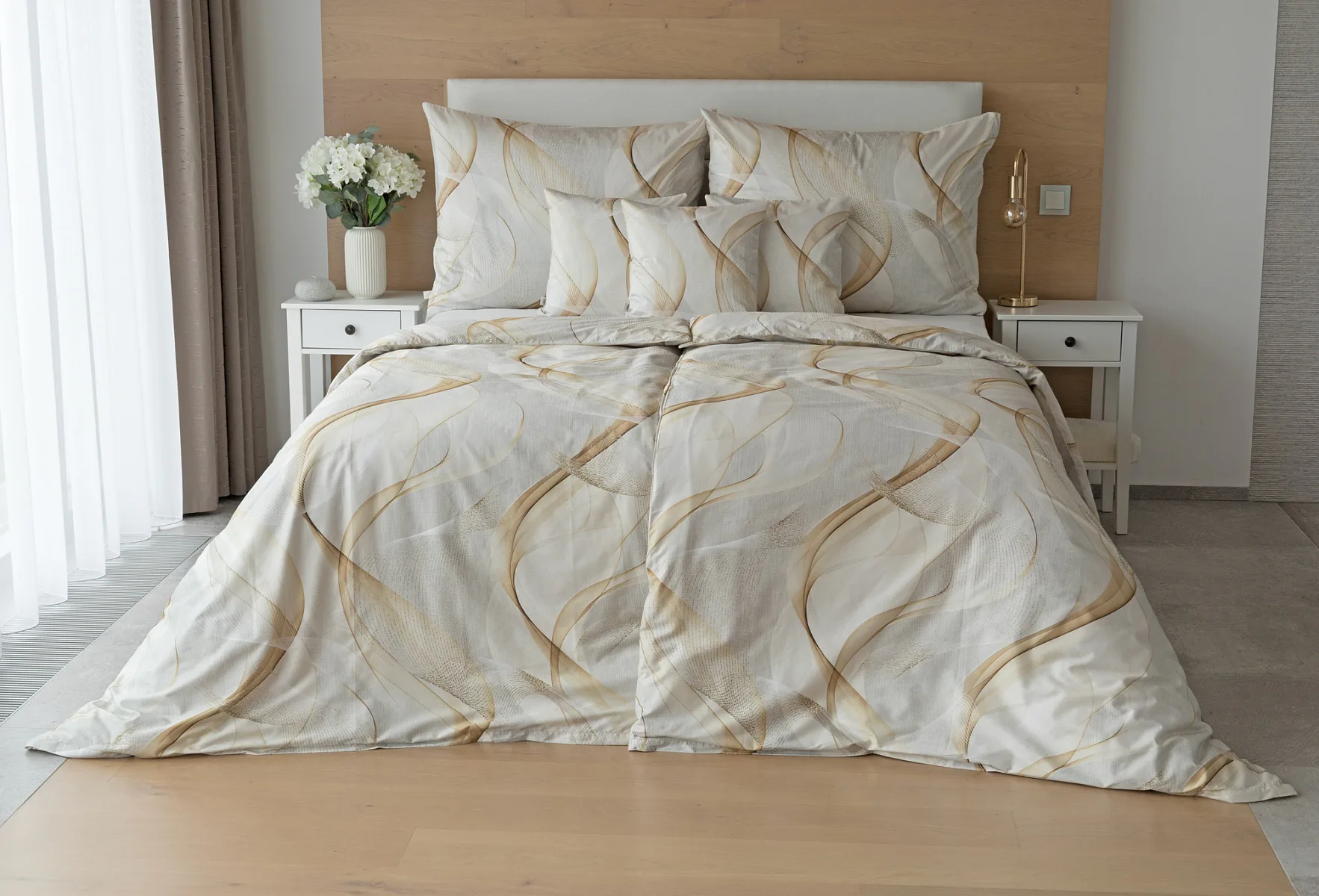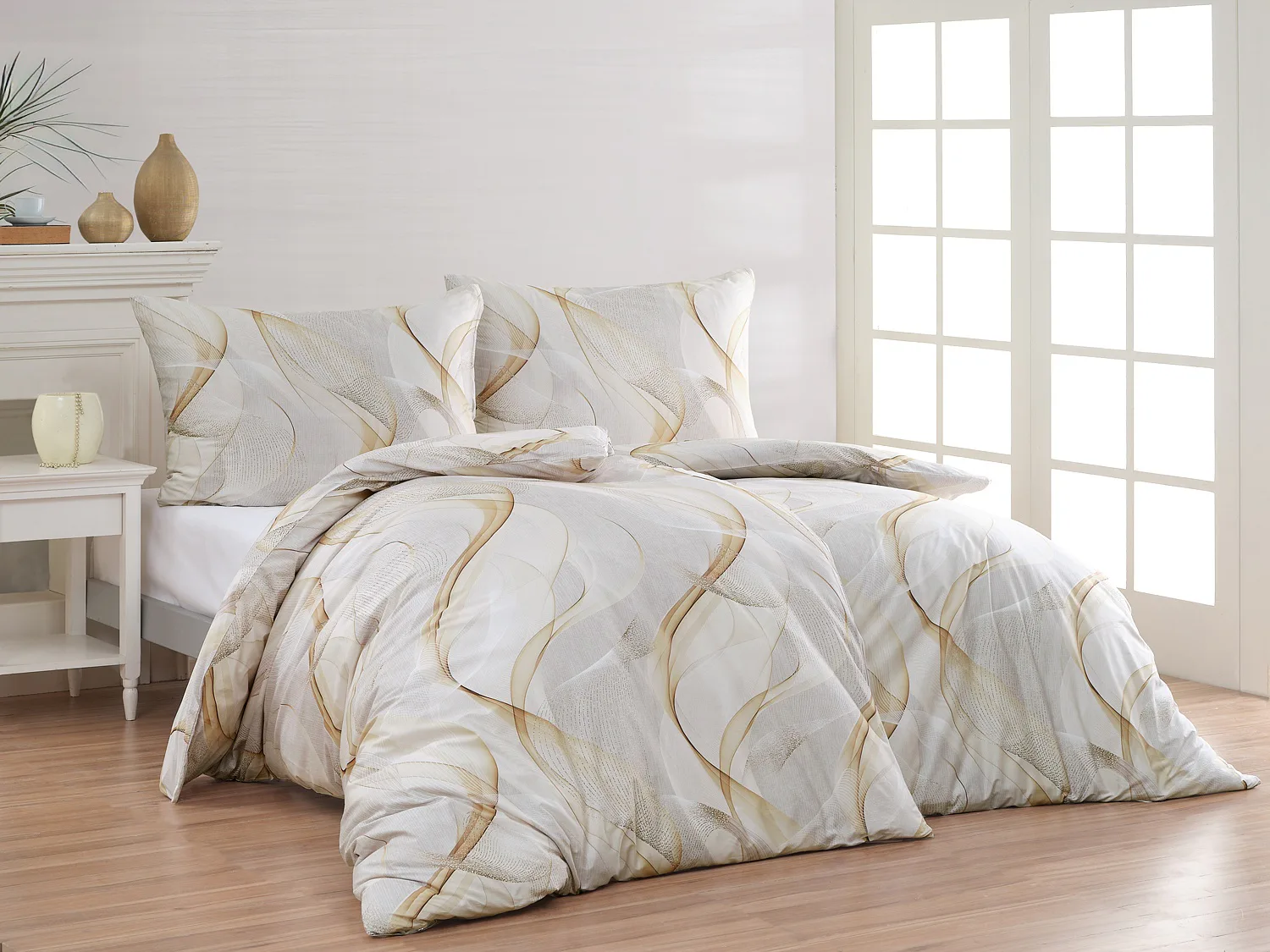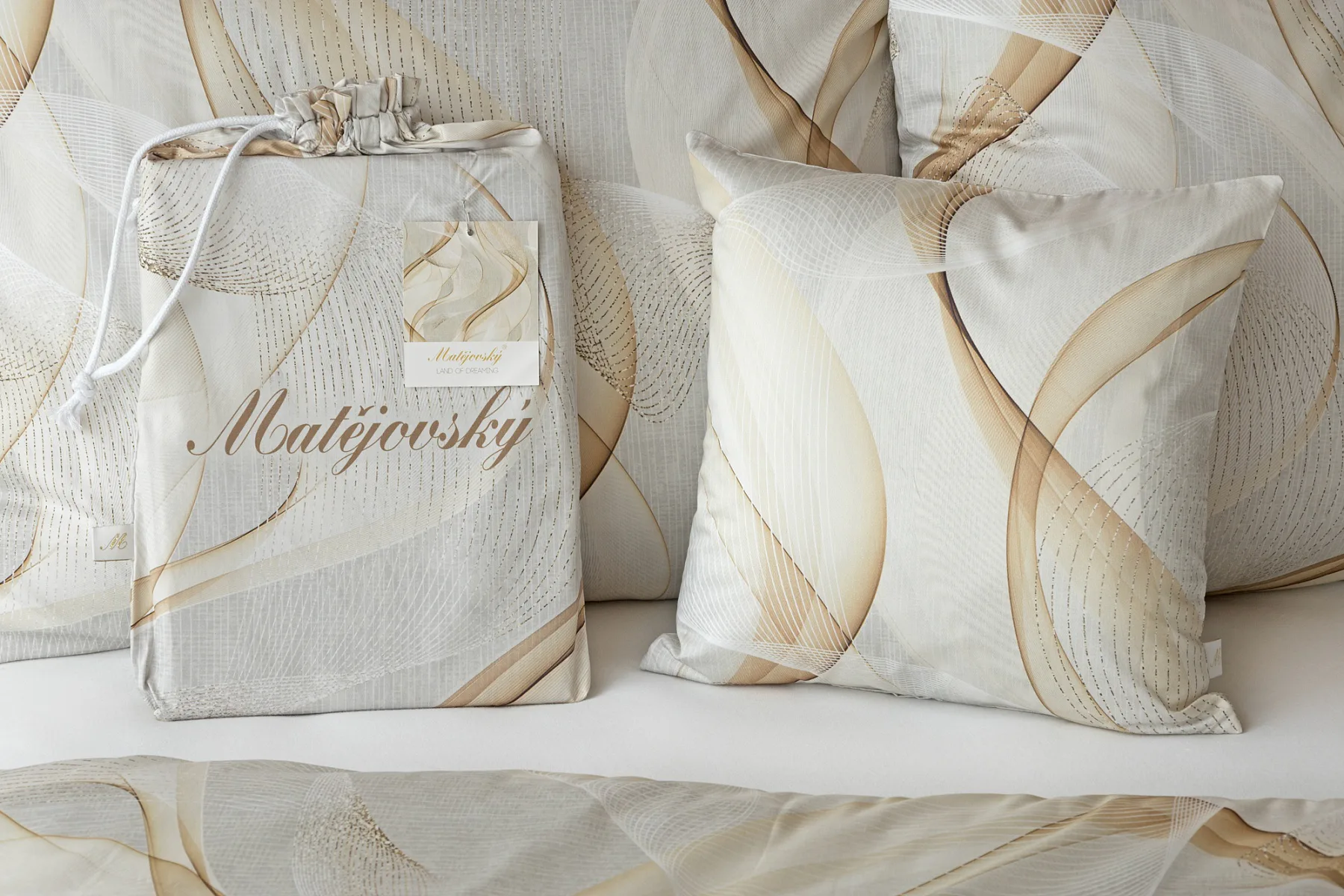 Povlečení Delight zdobí jemný geometrický vzor v podobě bílých a zlatavých nepravidelných vlnek na světle šedém podkladu. Povlak na polštář i na přikrývku je z obou stran stejný, povlečení je opatřeno komfortním zipovým uzávěrem.