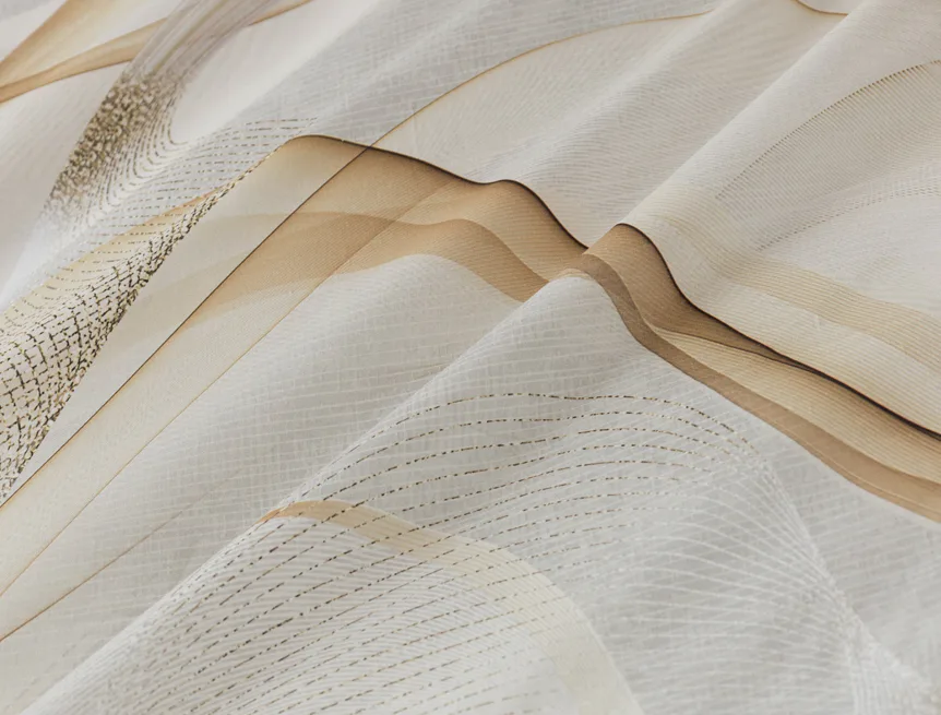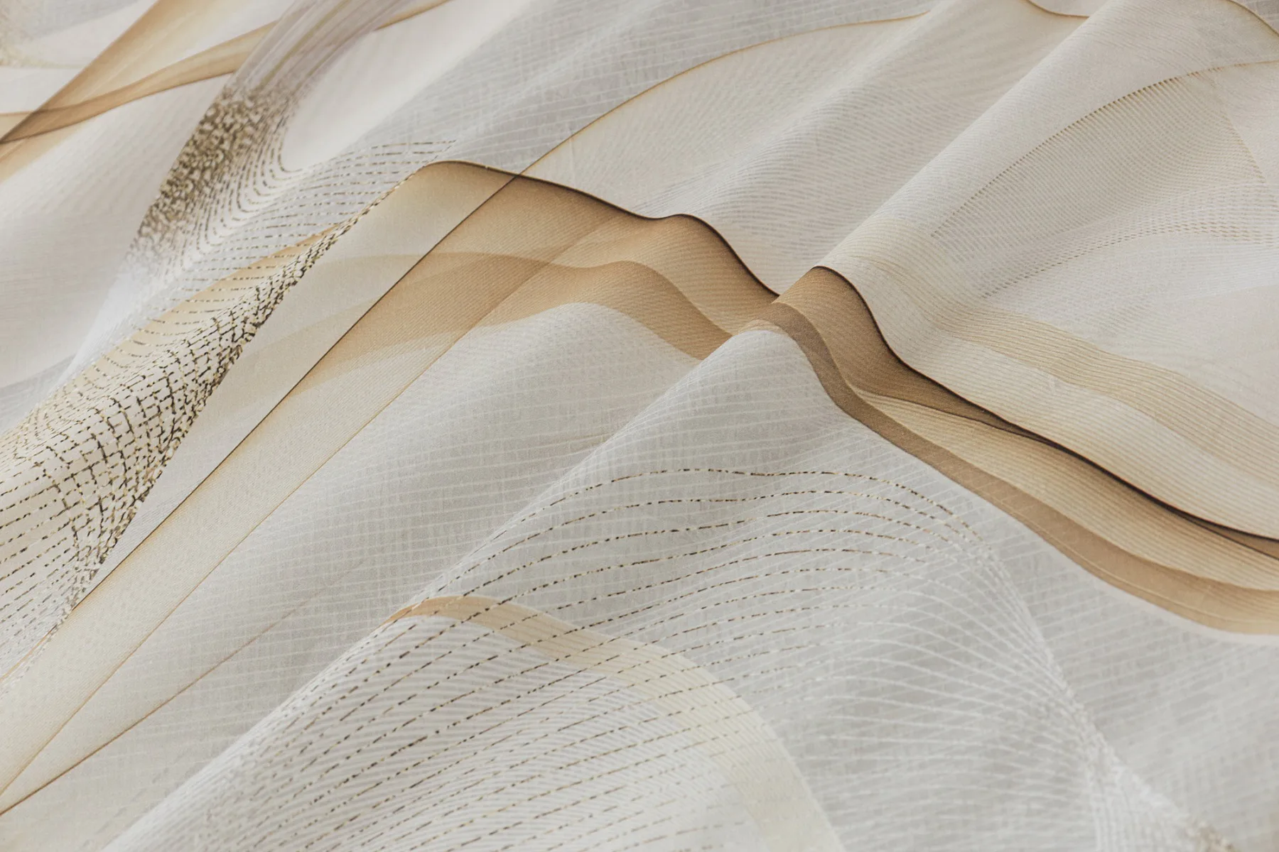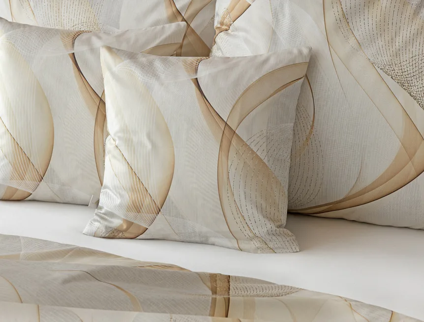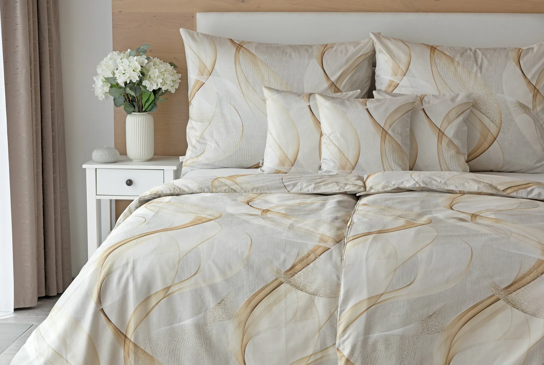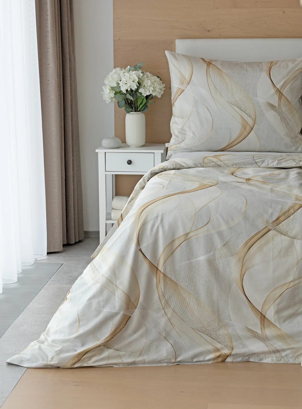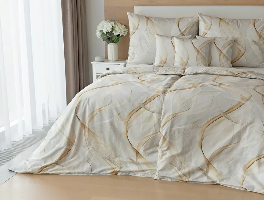 Povlečení Delight zdobí jemný geometrický vzor v podobě bílých a zlatavých nepravidelných vlnek na světle šedém podkladu. Povlak na polštář i na přikrývku je z obou stran stejný, povlečení je opatřeno komfortním zipovým uzávěrem.