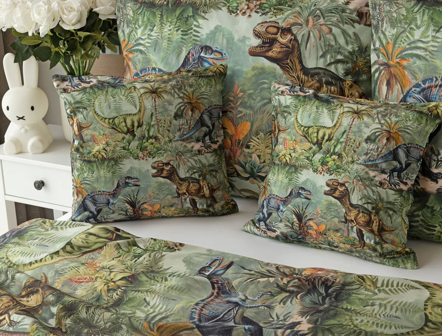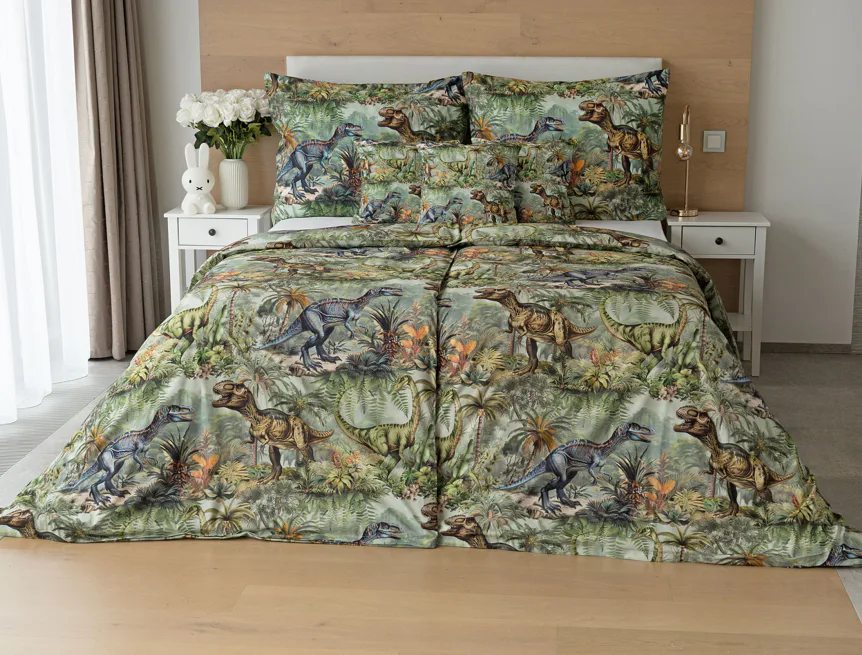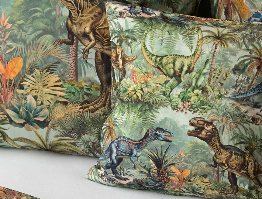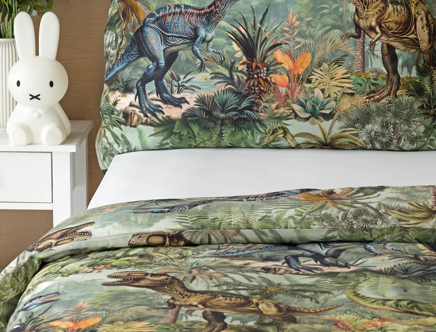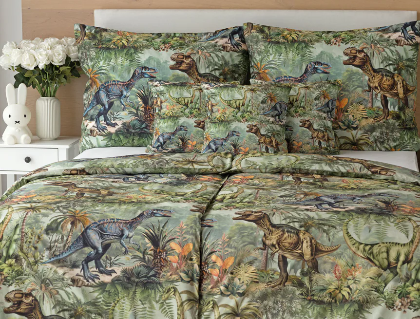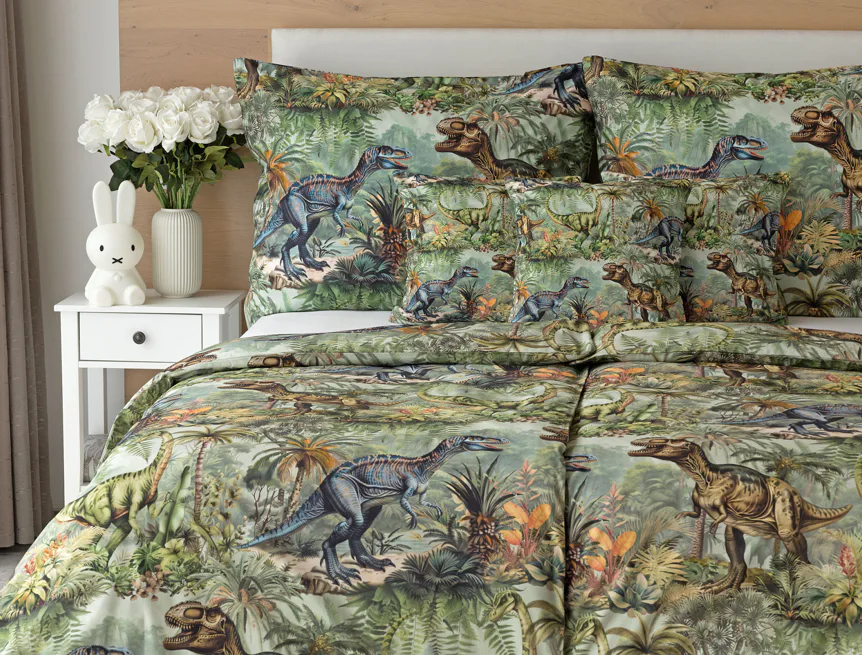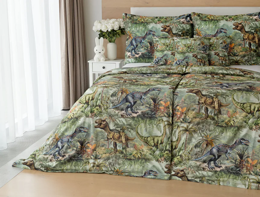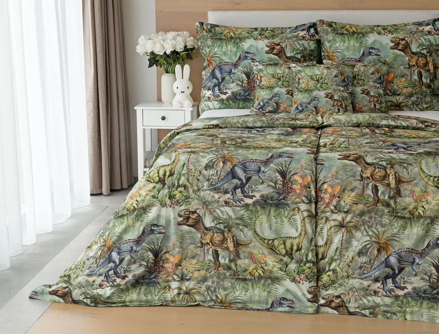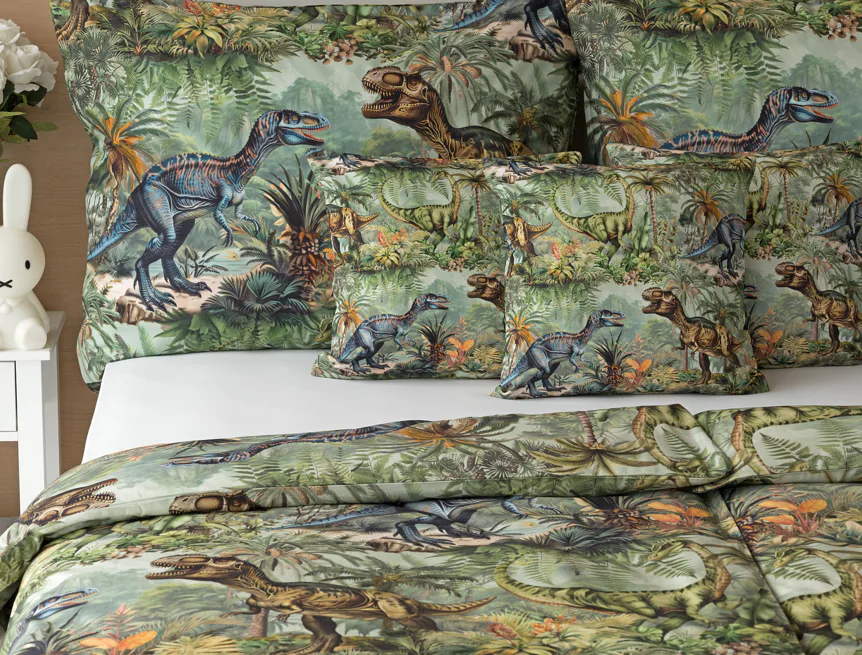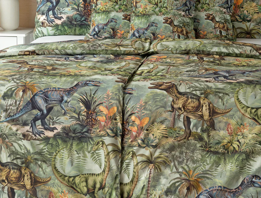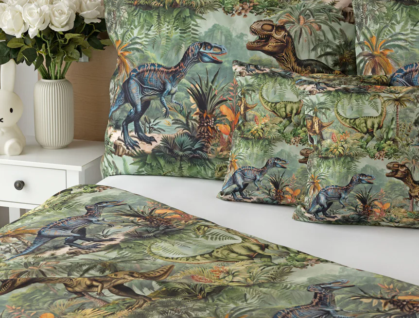 Bavlněné povlečení Dino potěší všechny malé i větší milovníky jurského období. Propracované barevné ilustrace oblíbených prehistorických tvorů promění každou postel v dobrodružnou džungli, kde čekají obří dinosauři, tyranosauři a brontosauři. Prvotřídní bavlna zajistí klidný spánek dětí a díky nejmodernější digitální technologii tisku si barvy zachovají svou sytost i po mnoha praních.