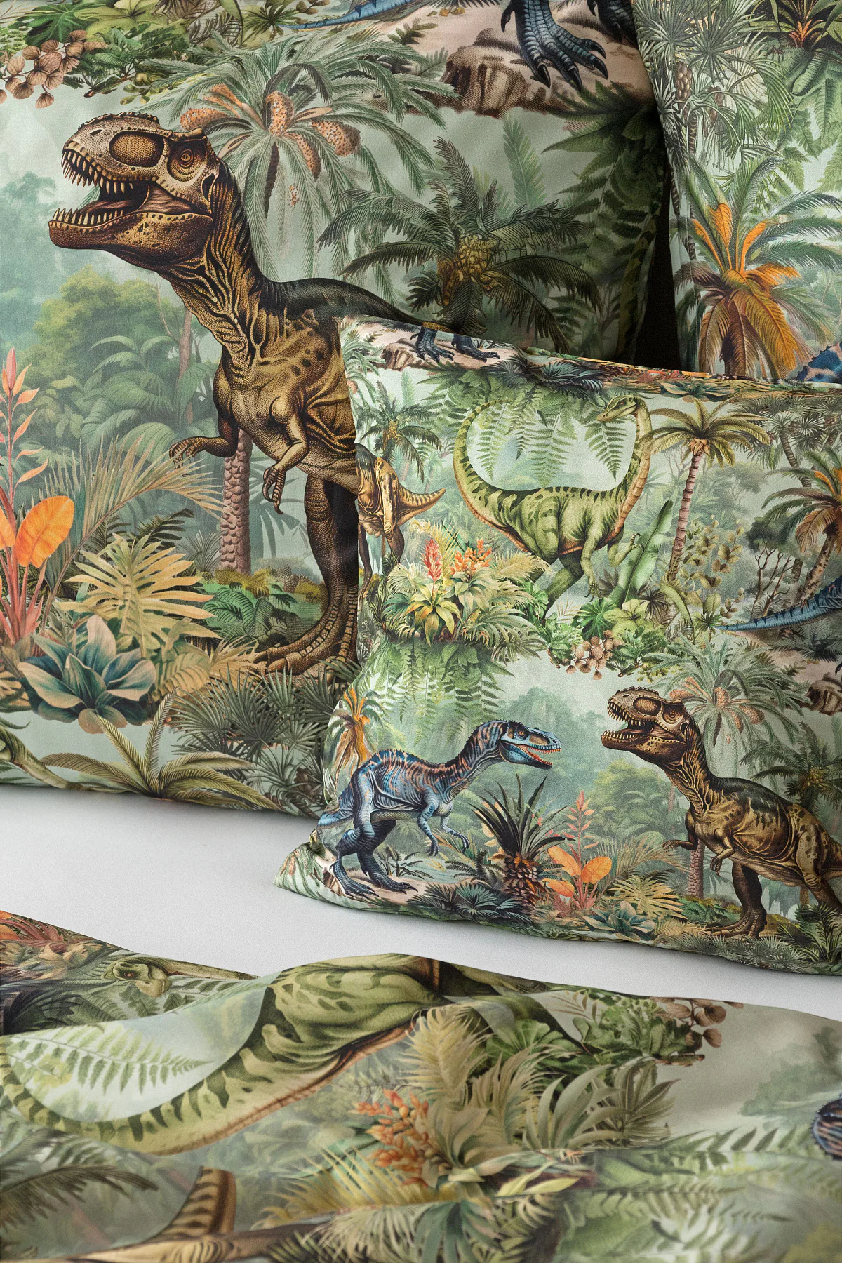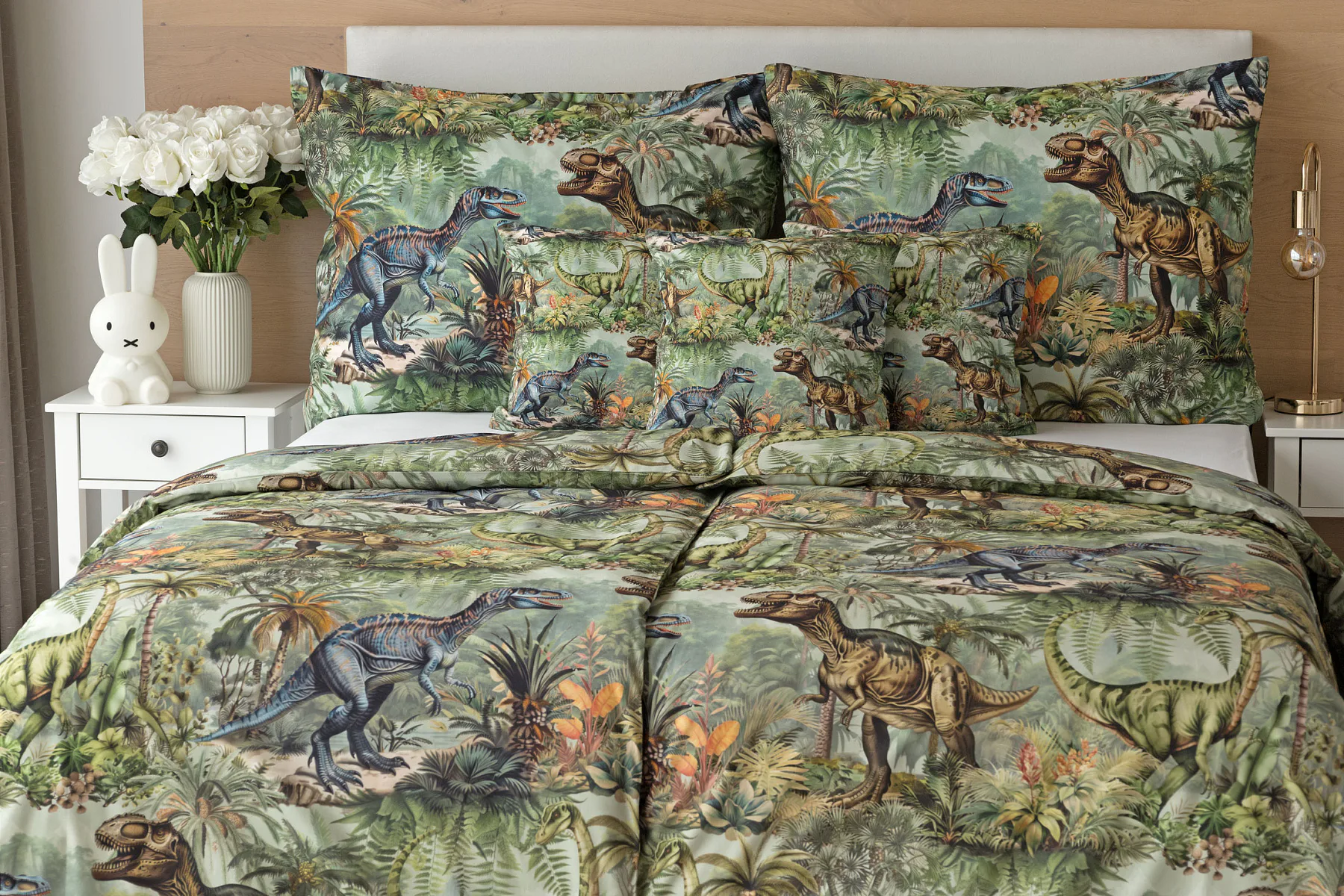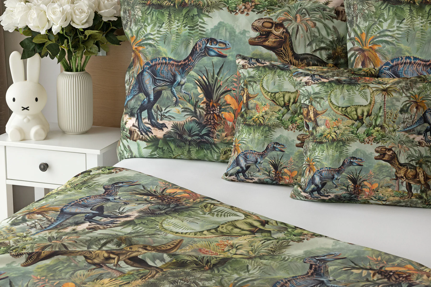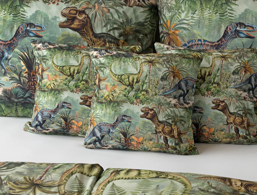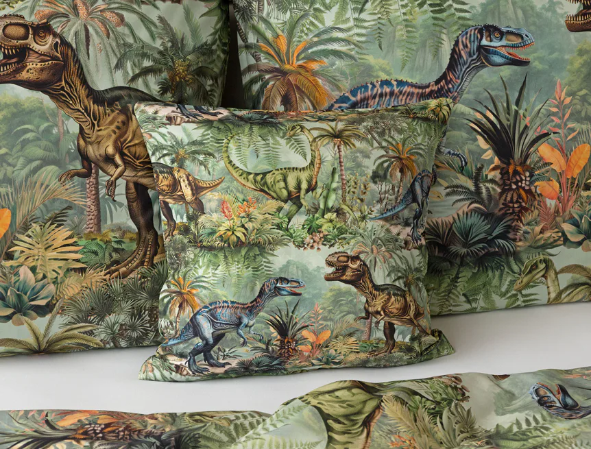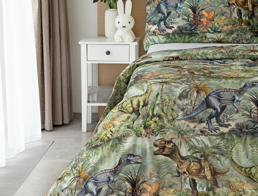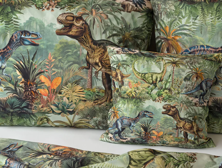 Bavlněné povlečení Dino potěší všechny malé i větší milovníky jurského období. Propracované barevné ilustrace oblíbených prehistorických tvorů promění každou postel v dobrodružnou džungli, kde čekají obří dinosauři, tyranosauři a brontosauři. Prvotřídní bavlna zajistí klidný spánek dětí a díky nejmodernější digitální technologii tisku si barvy zachovají svou sytost i po mnoha praních.