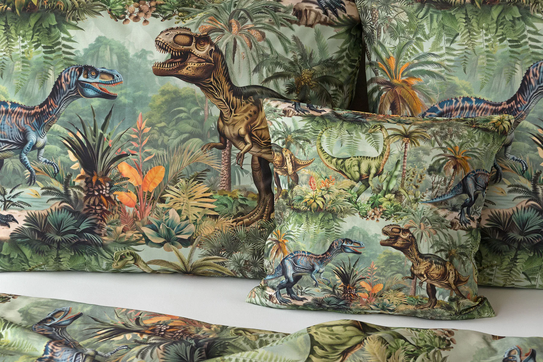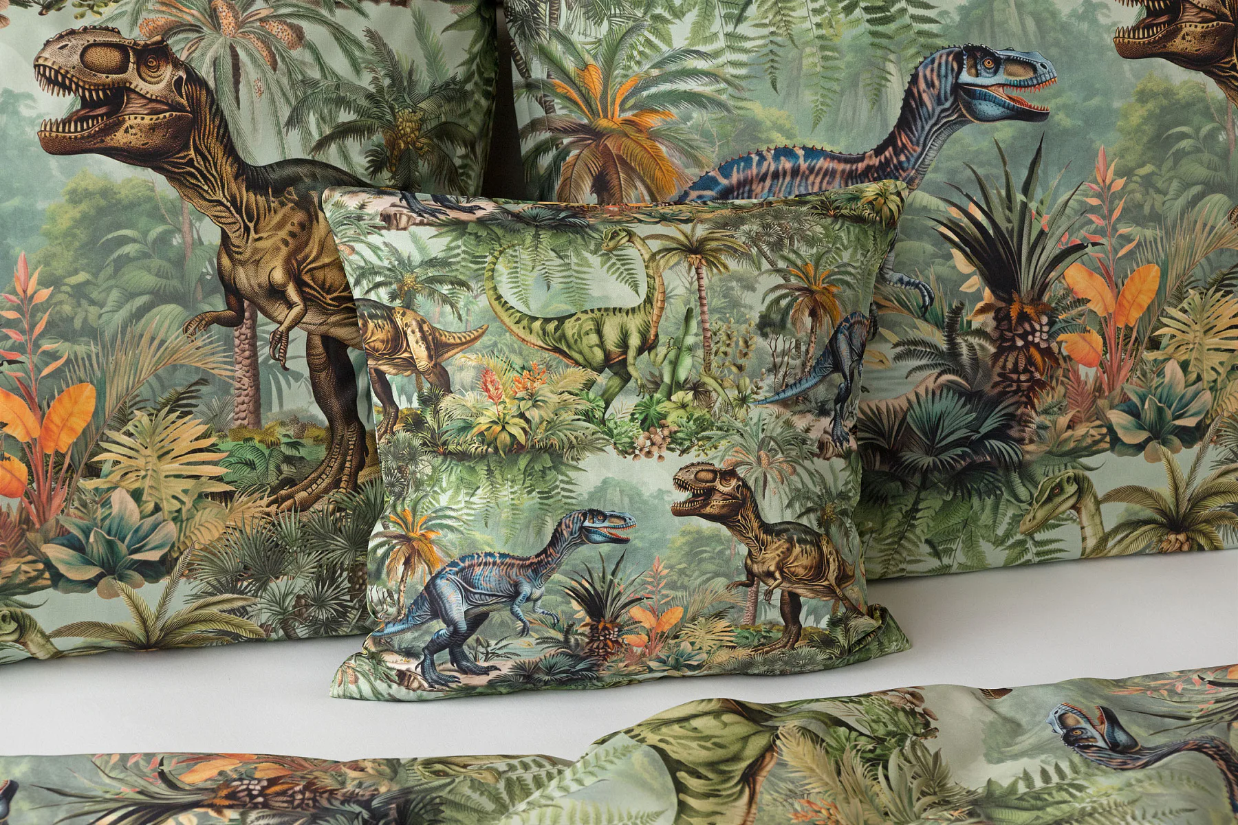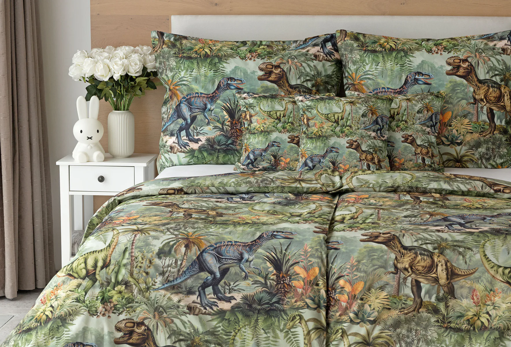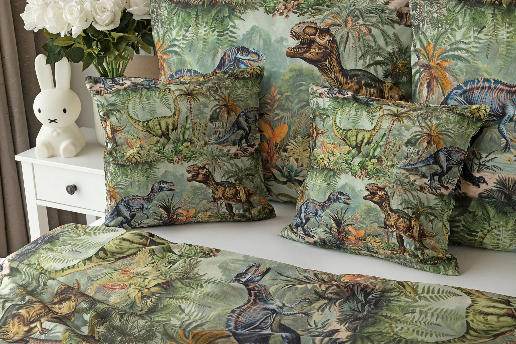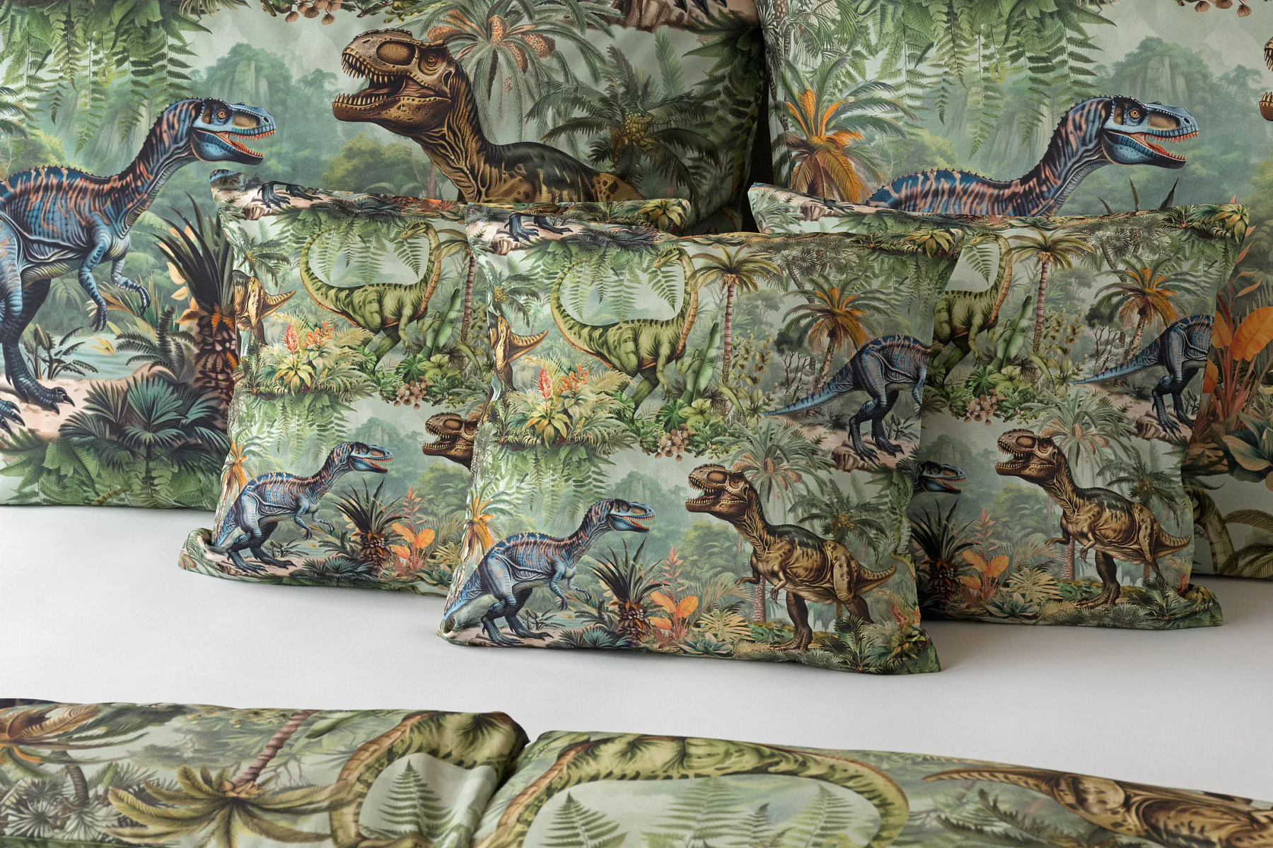 Bavlněné povlečení Dino potěší všechny malé i větší milovníky jurského období. Propracované barevné ilustrace oblíbených prehistorických tvorů promění každou postel v dobrodružnou džungli, kde čekají obří dinosauři, tyranosauři a brontosauři. Prvotřídní bavlna zajistí klidný spánek dětí a díky nejmodernější digitální technologii tisku si barvy zachovají svou sytost i po mnoha praních.