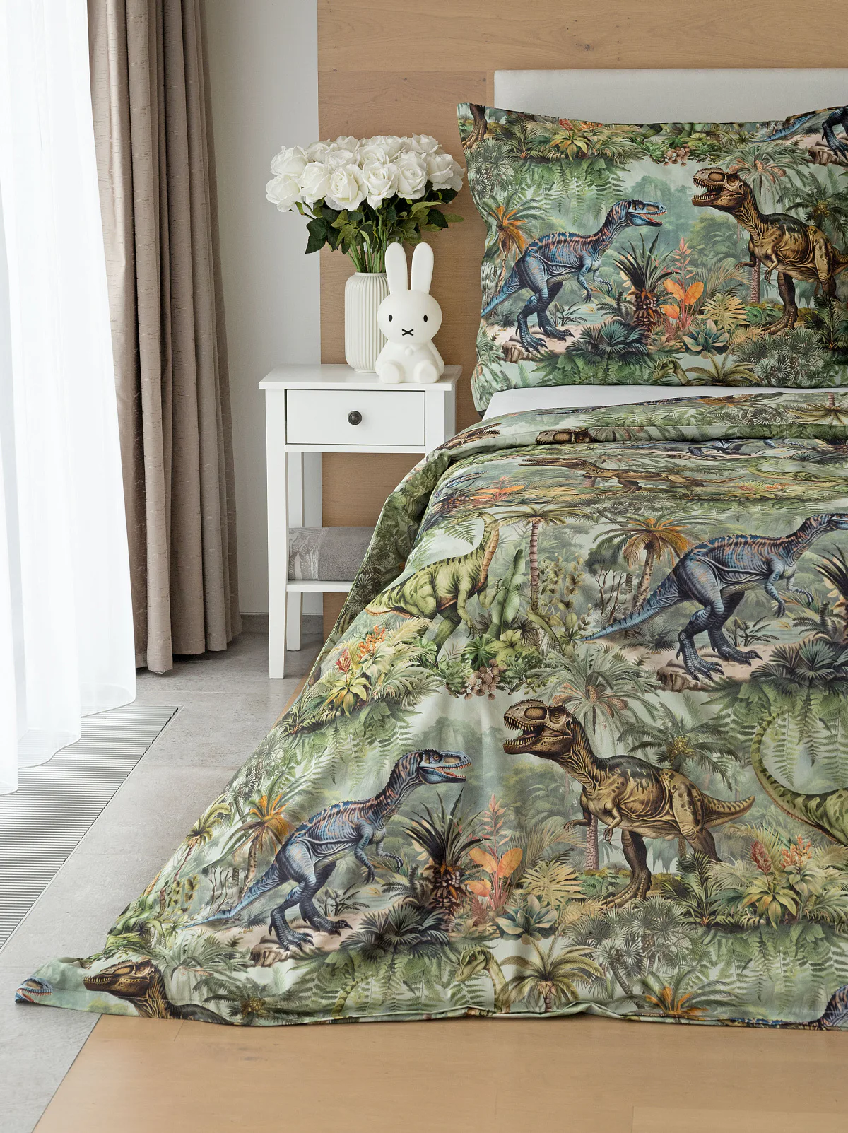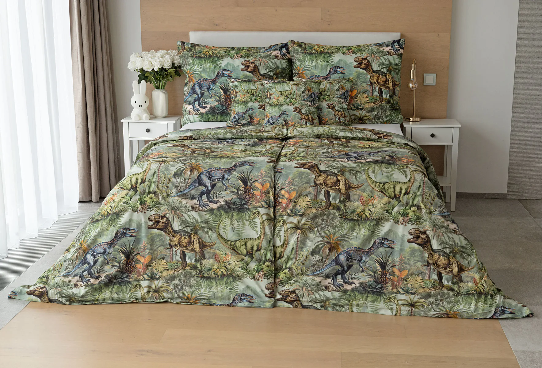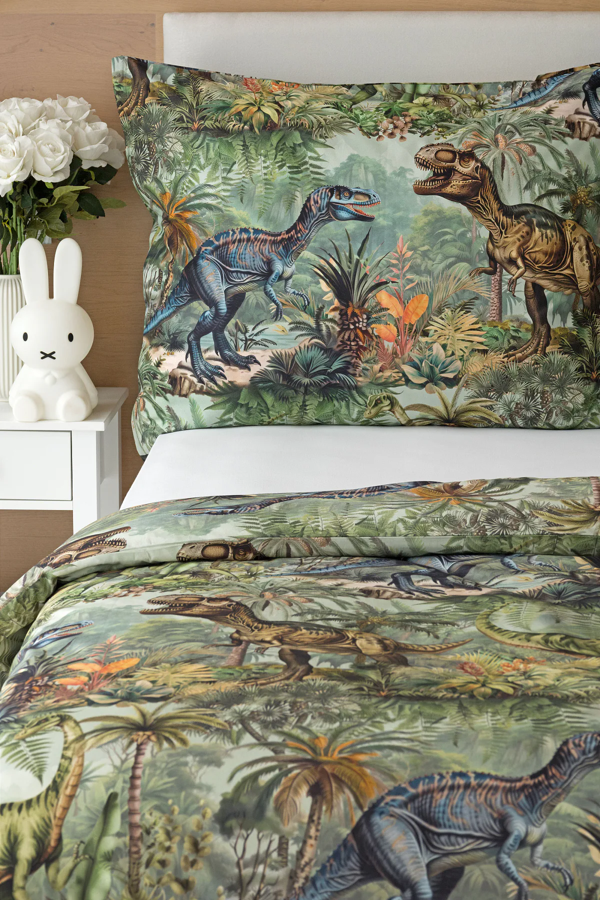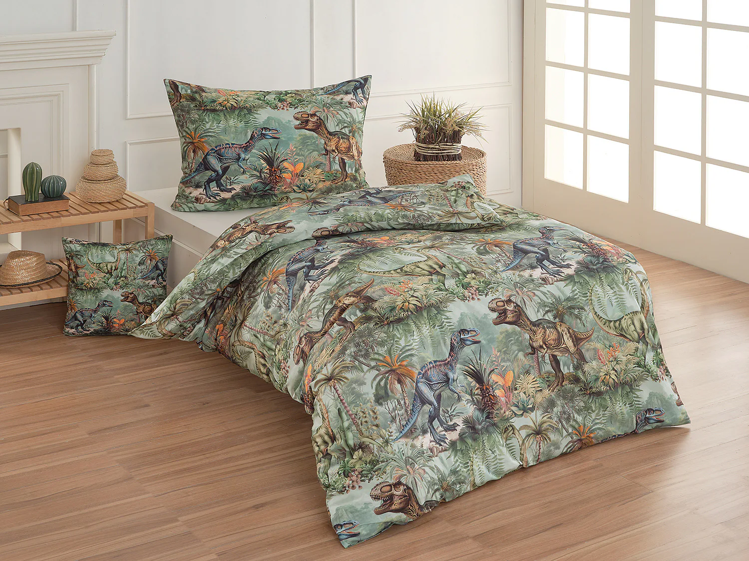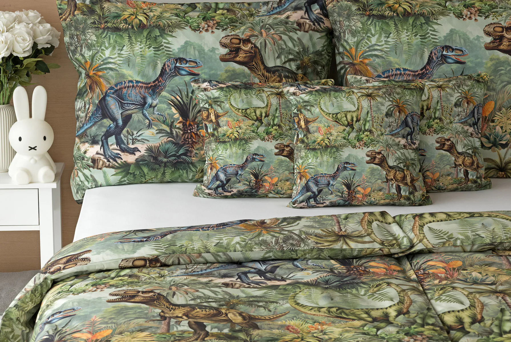 Bavlněné povlečení Dino potěší všechny malé i větší milovníky jurského období. Propracované barevné ilustrace oblíbených prehistorických tvorů promění každou postel v dobrodružnou džungli, kde čekají obří dinosauři, tyranosauři a brontosauři. Prvotřídní bavlna zajistí klidný spánek dětí a díky nejmodernější digitální technologii tisku si barvy zachovají svou sytost i po mnoha praních.