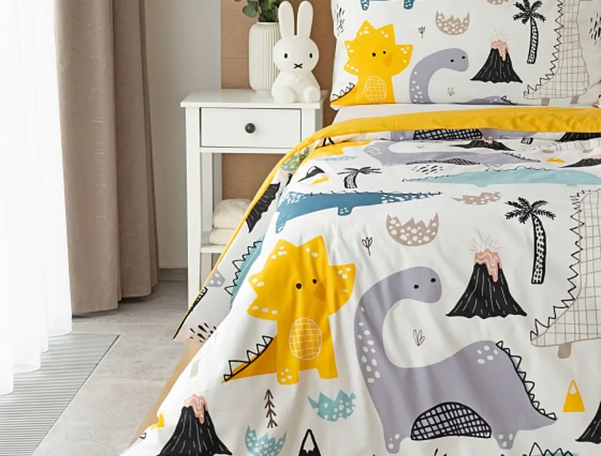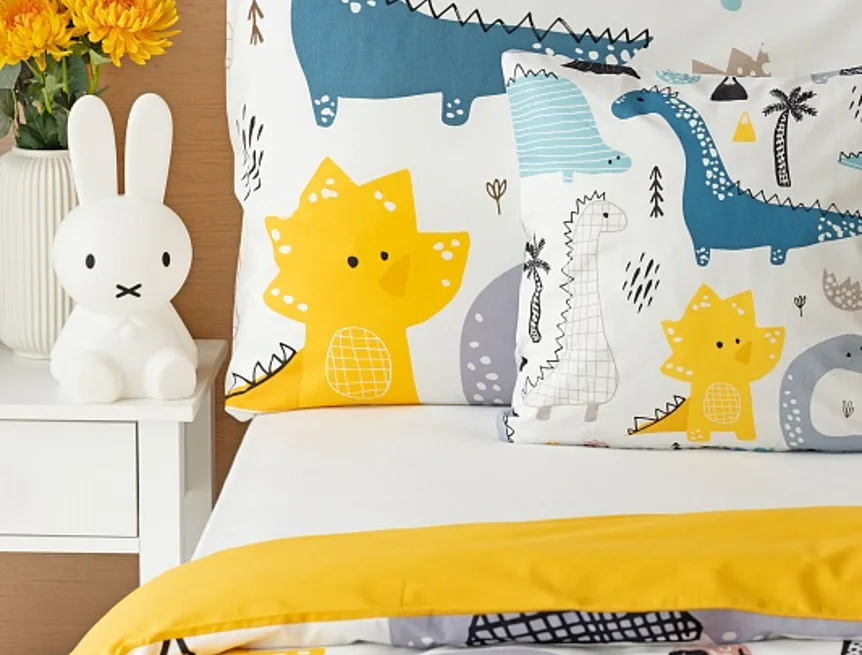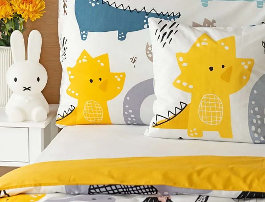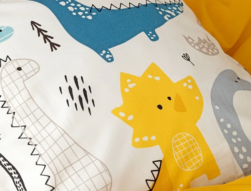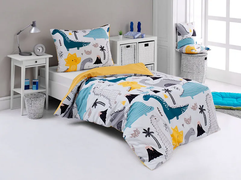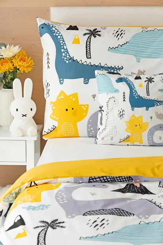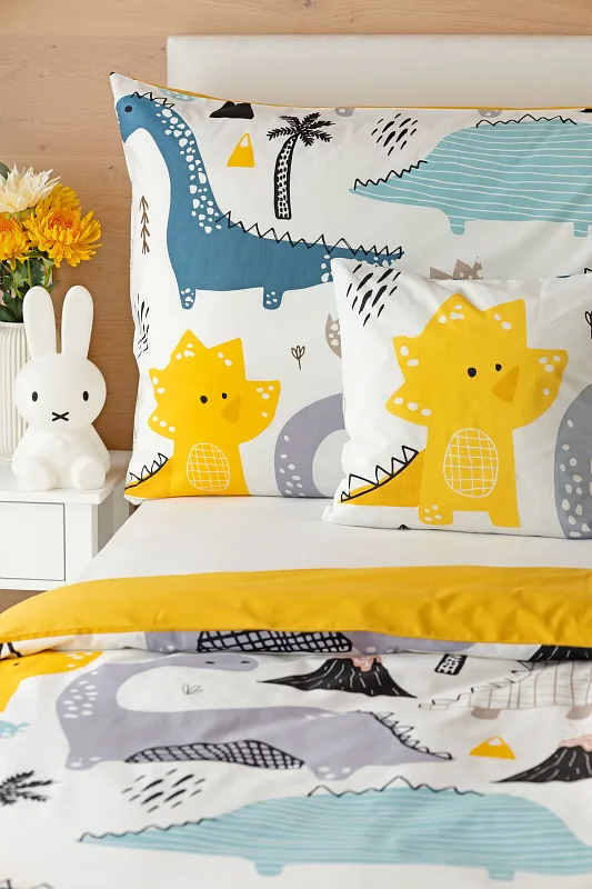 Hravý dětský vzor povlečení Dinosauři probudí fantazii každého malého dobrodruha. Nápaditá kombinace barev se hodí do chlapeckého i dívčího pokojíčku. Rodiče ocení vysoce kvalitní materiál ze 100% bavlny.