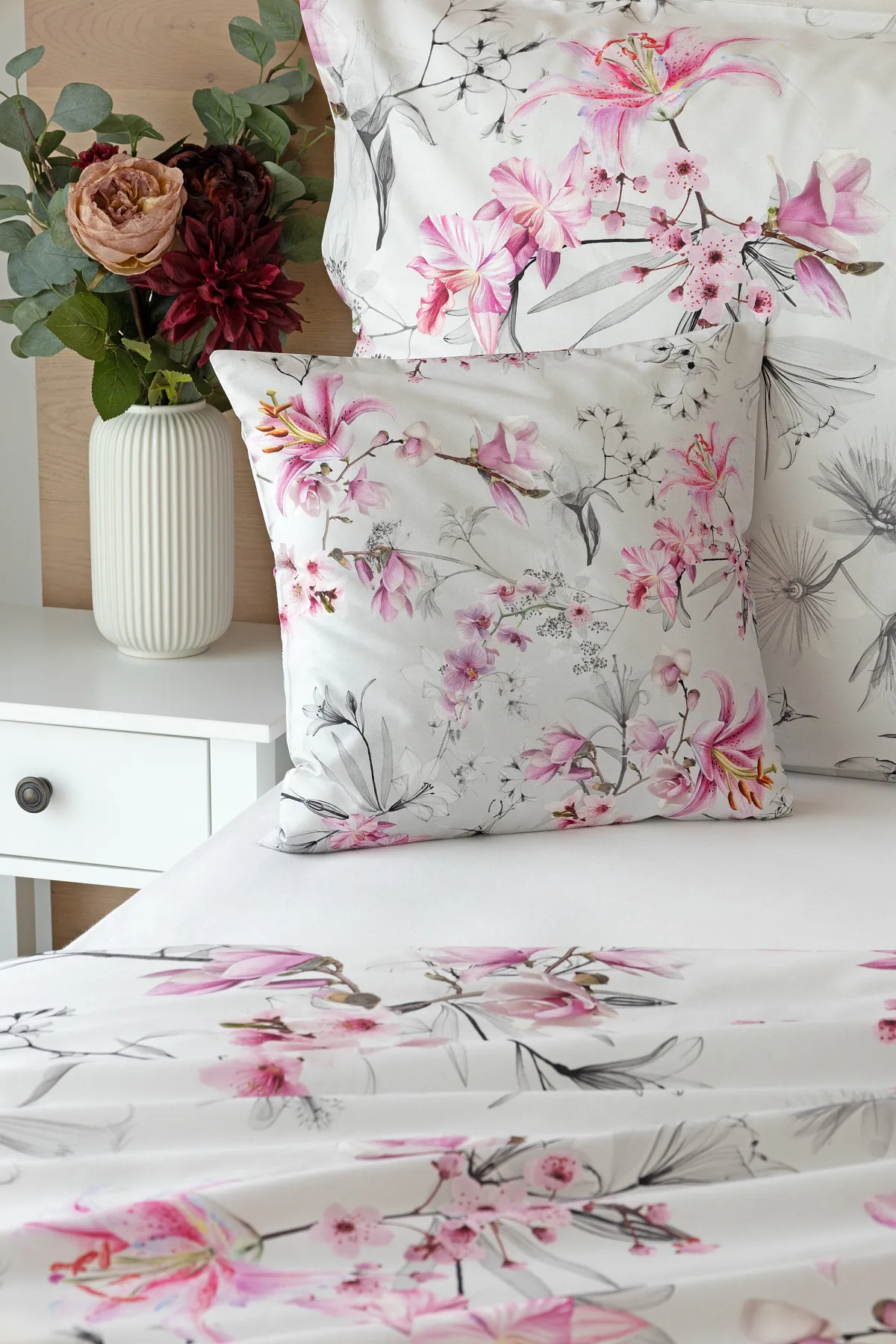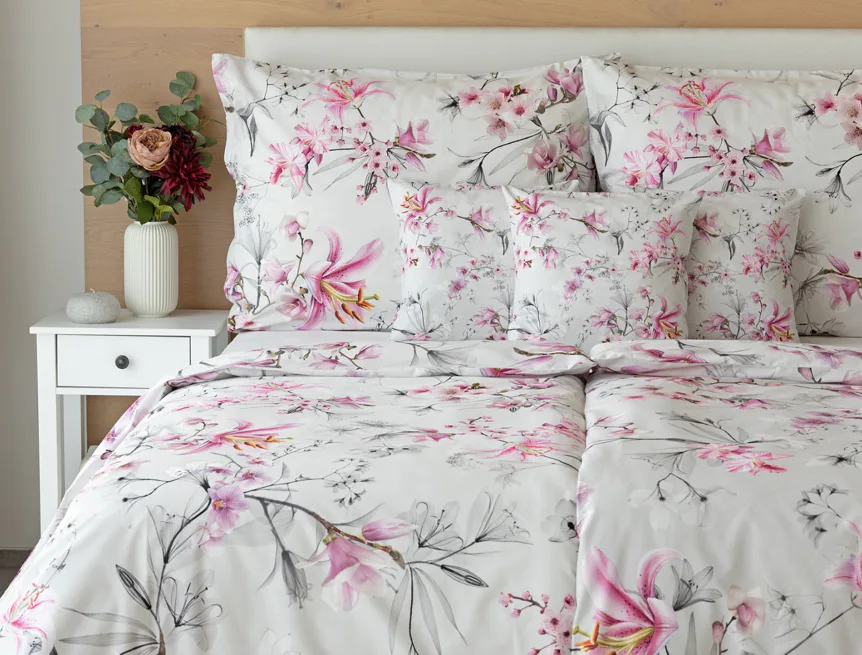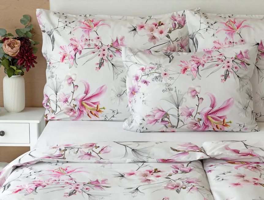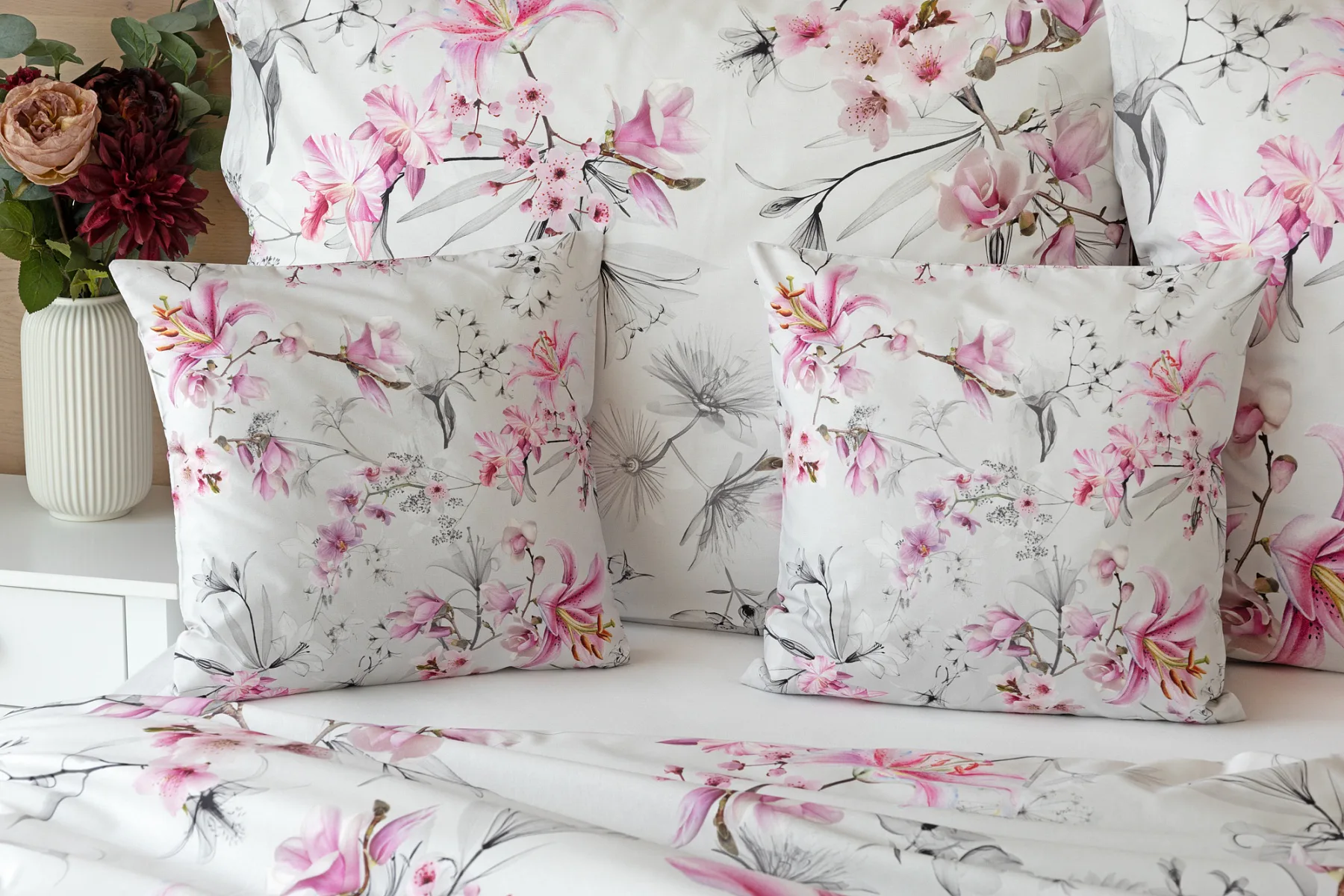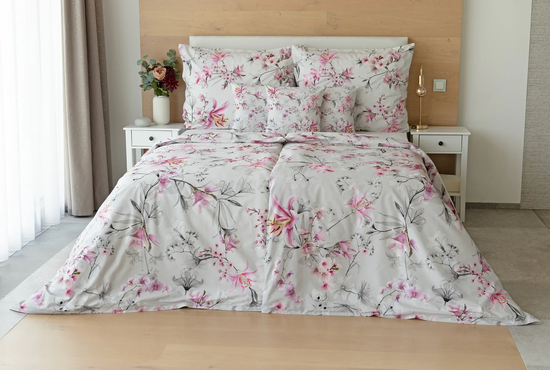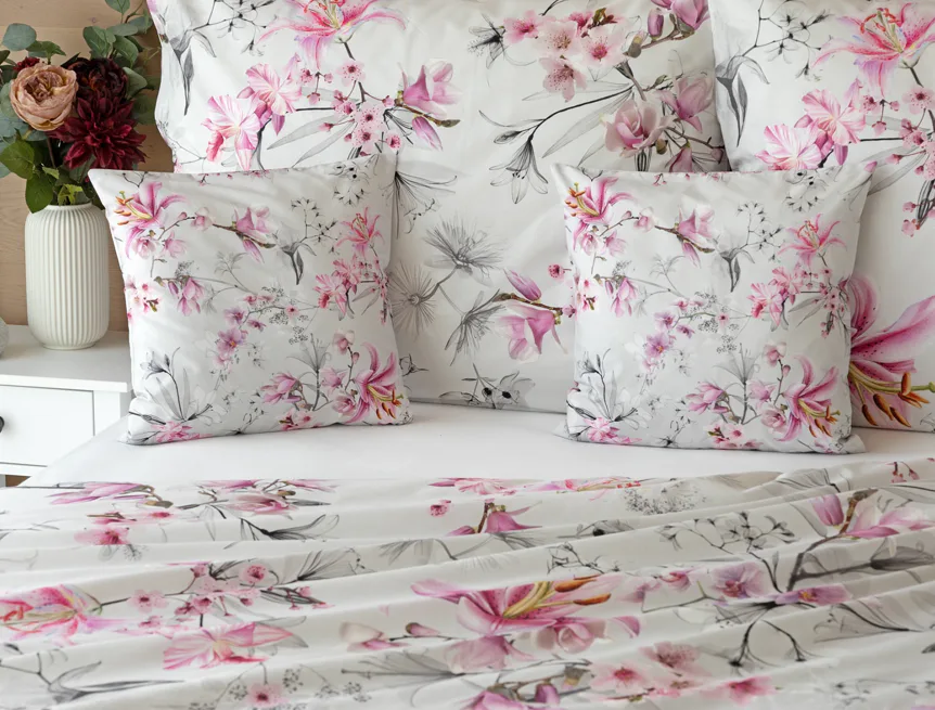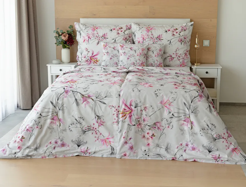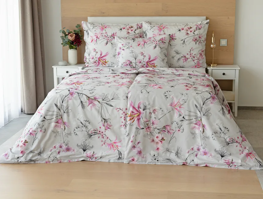 Obklopte se jemností a elegancí s bavlněným povlečením Elisse. Okouzlující vzor kombinuje květy exotických orchidejí a něžných lilií v růžovofialových tónech na světle šedém podkladu. Povlečení je vyrobeno ze 100% prvotřídní bavlny a přináší nejen estetickou hodnotu, ale i výjimečný komfort.