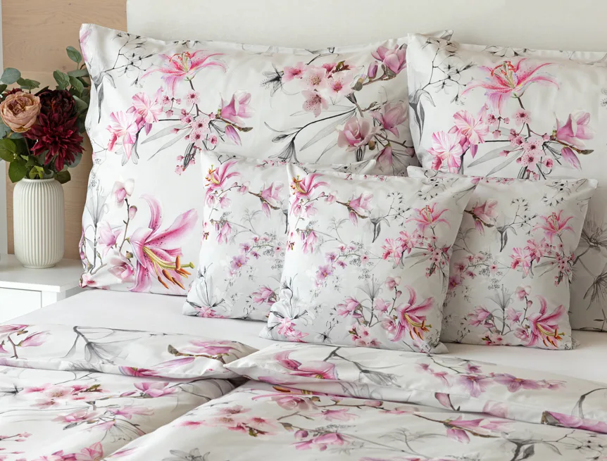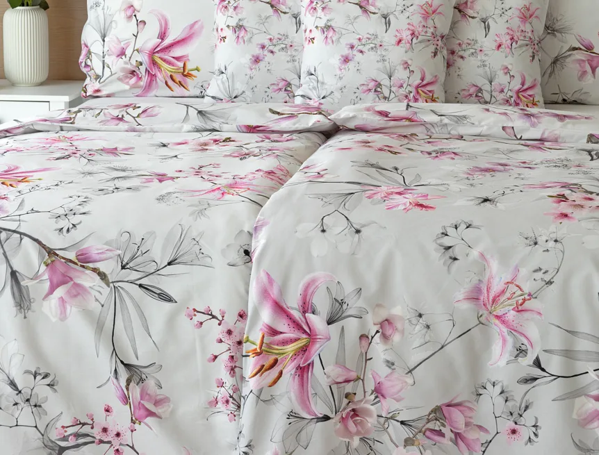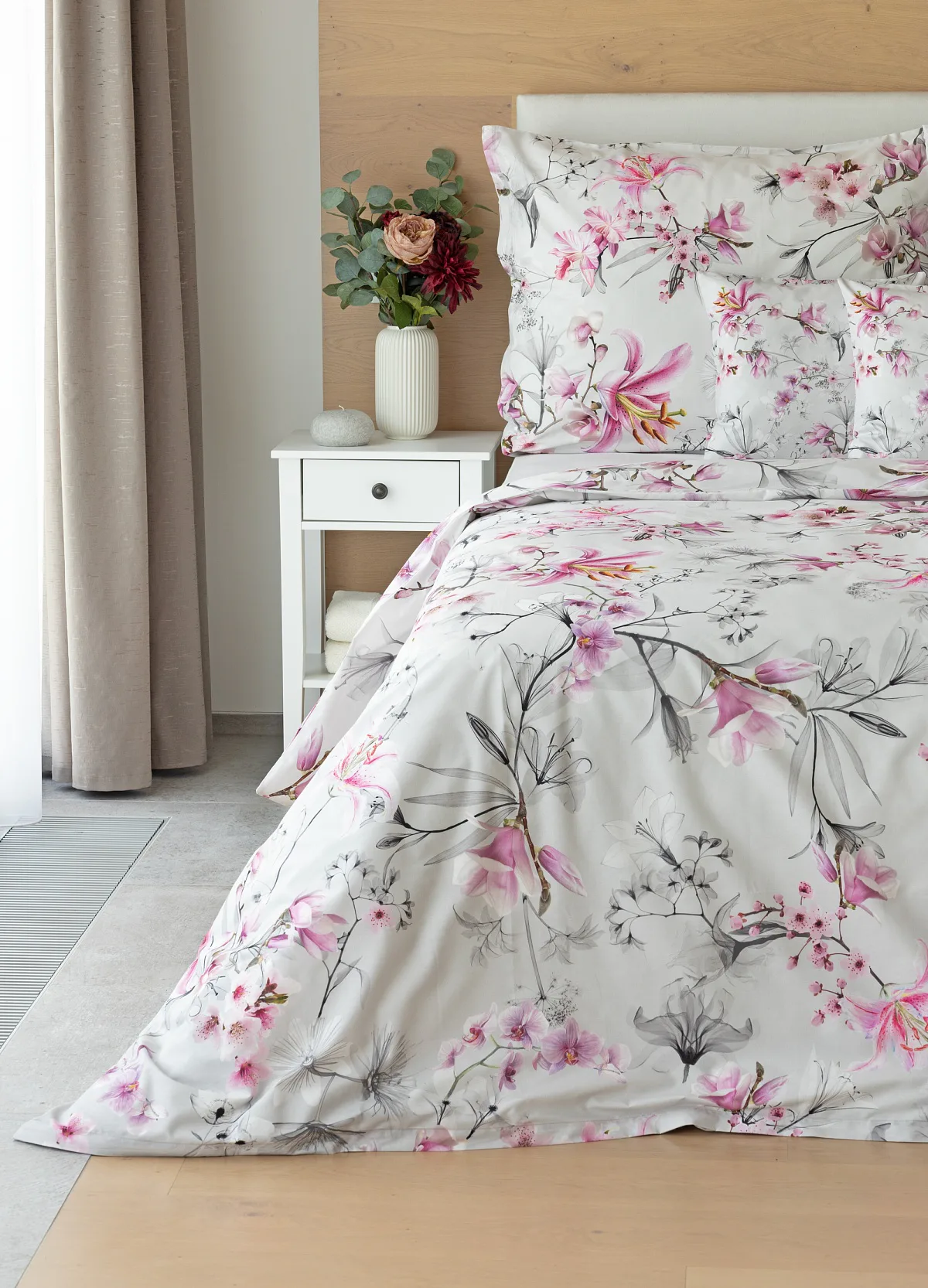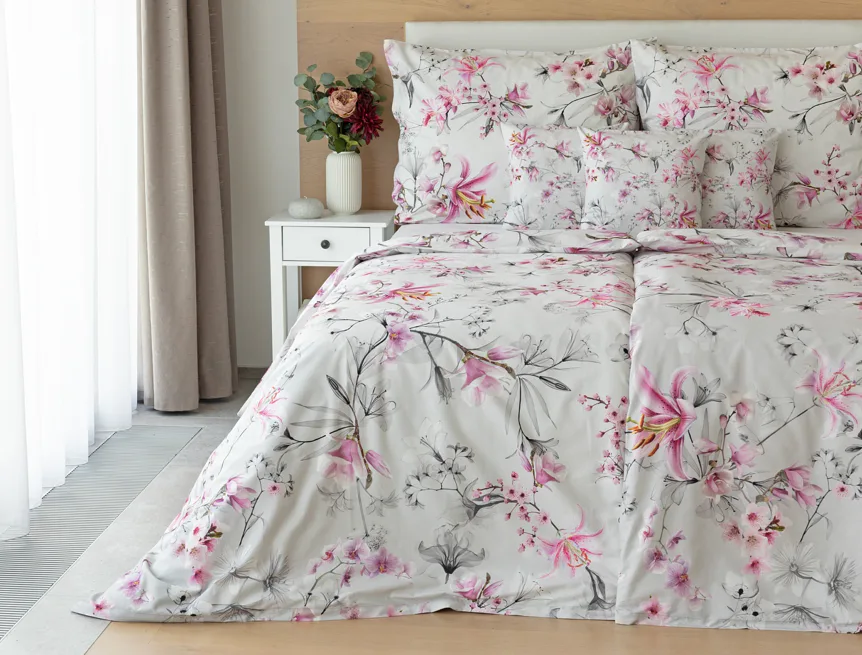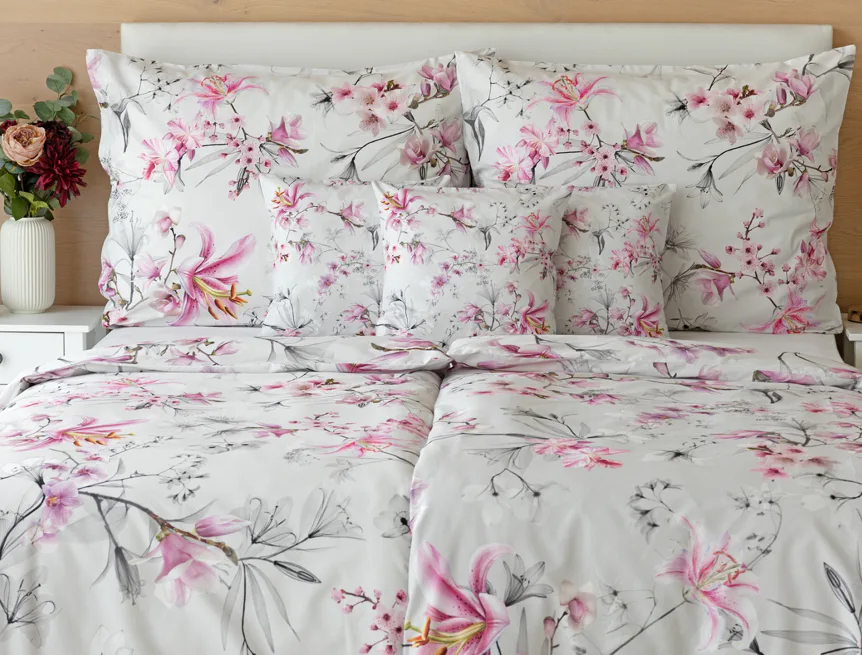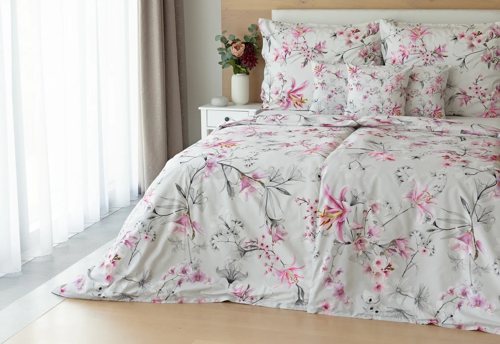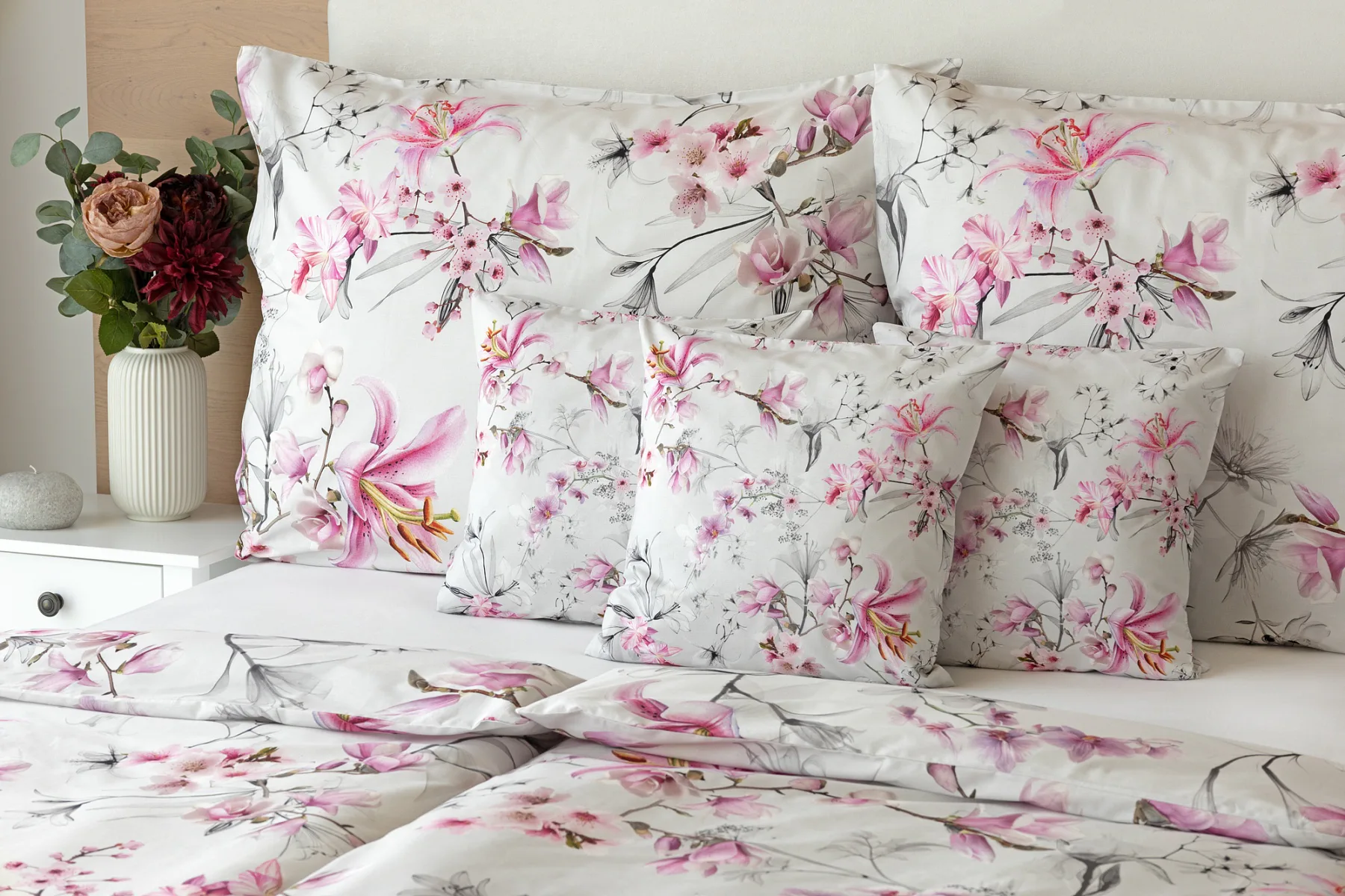 Obklopte se jemností a elegancí s bavlněným povlečením Elisse. Okouzlující vzor kombinuje květy exotických orchidejí a něžných lilií v růžovofialových tónech na světle šedém podkladu. Povlečení je vyrobeno ze 100% prvotřídní bavlny a přináší nejen estetickou hodnotu, ale i výjimečný komfort.