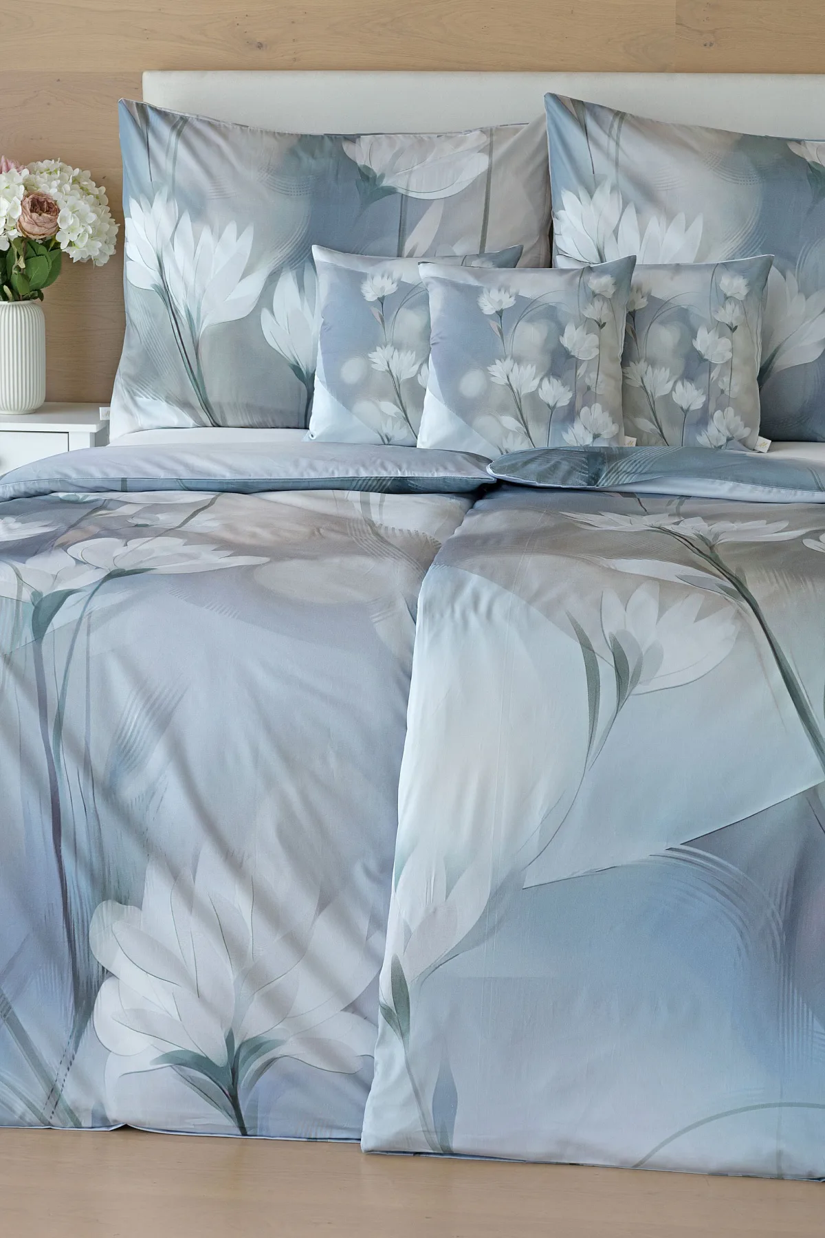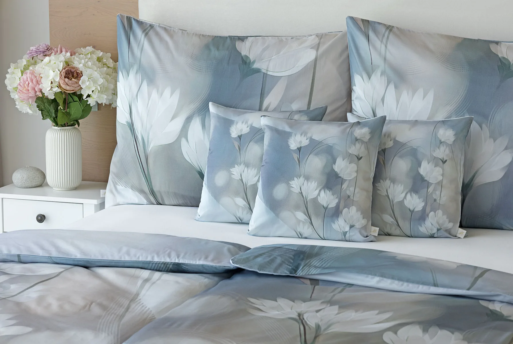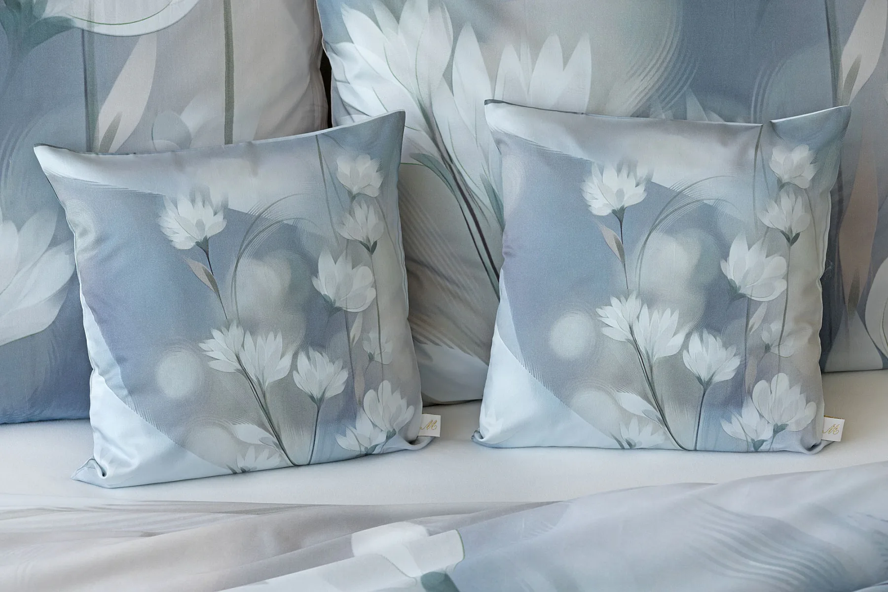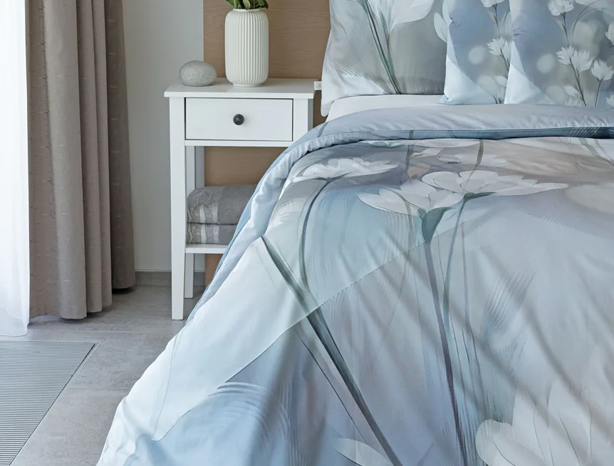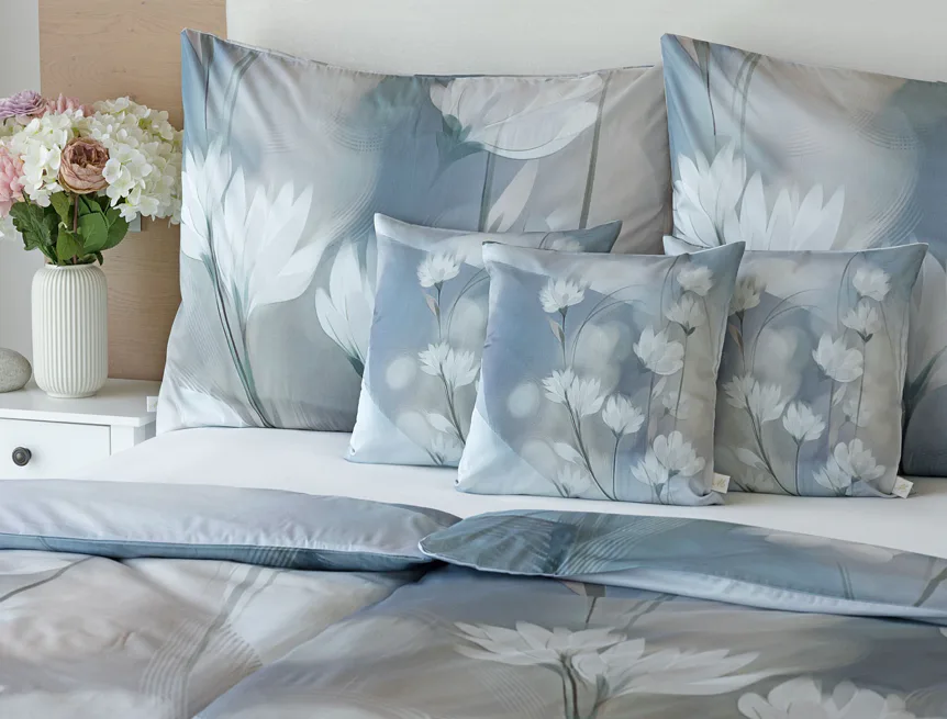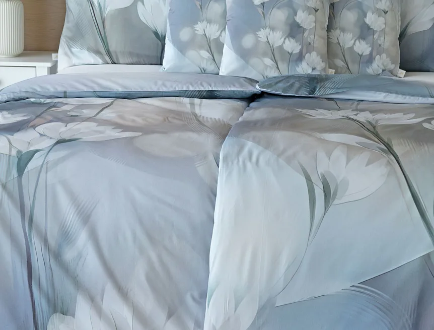 Vzoru Eloise dominuje atraktivní florální motiv v paletě modrých a tlumených pudrových tónů. Povlak na polštář i na přikrývku je z obou stran stejný, vrchní stranu povlaku na polštář zdobí malé logo "M" v pravém dolním rohu. Povlečení je opatřeno komfortním zipovým uzávěrem.