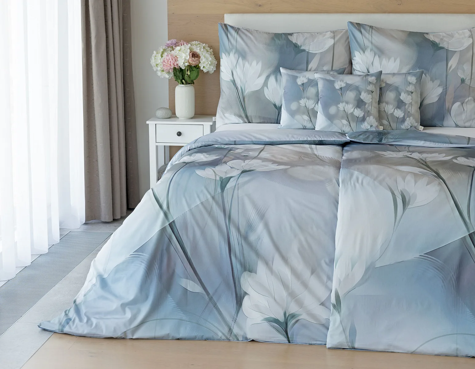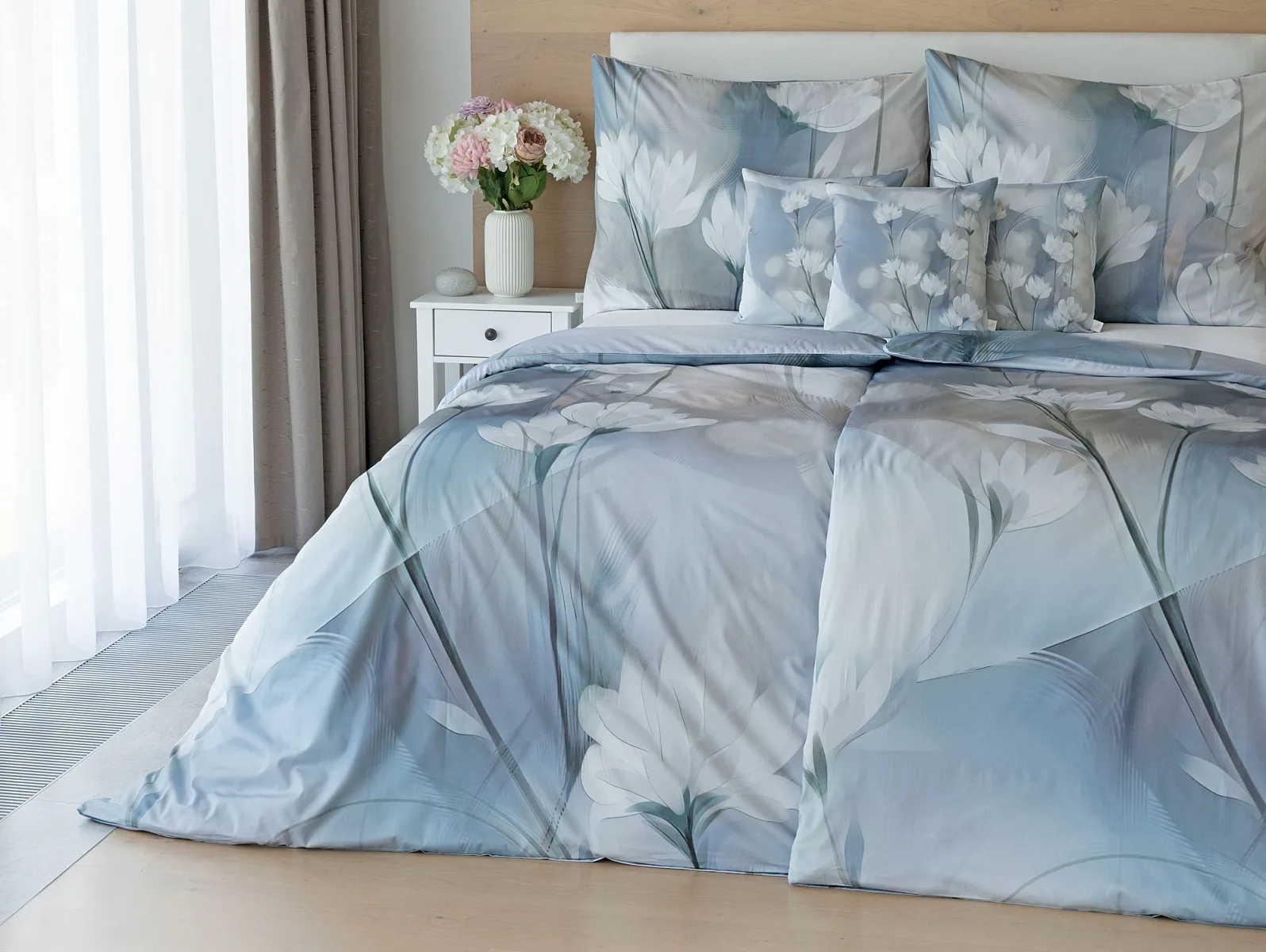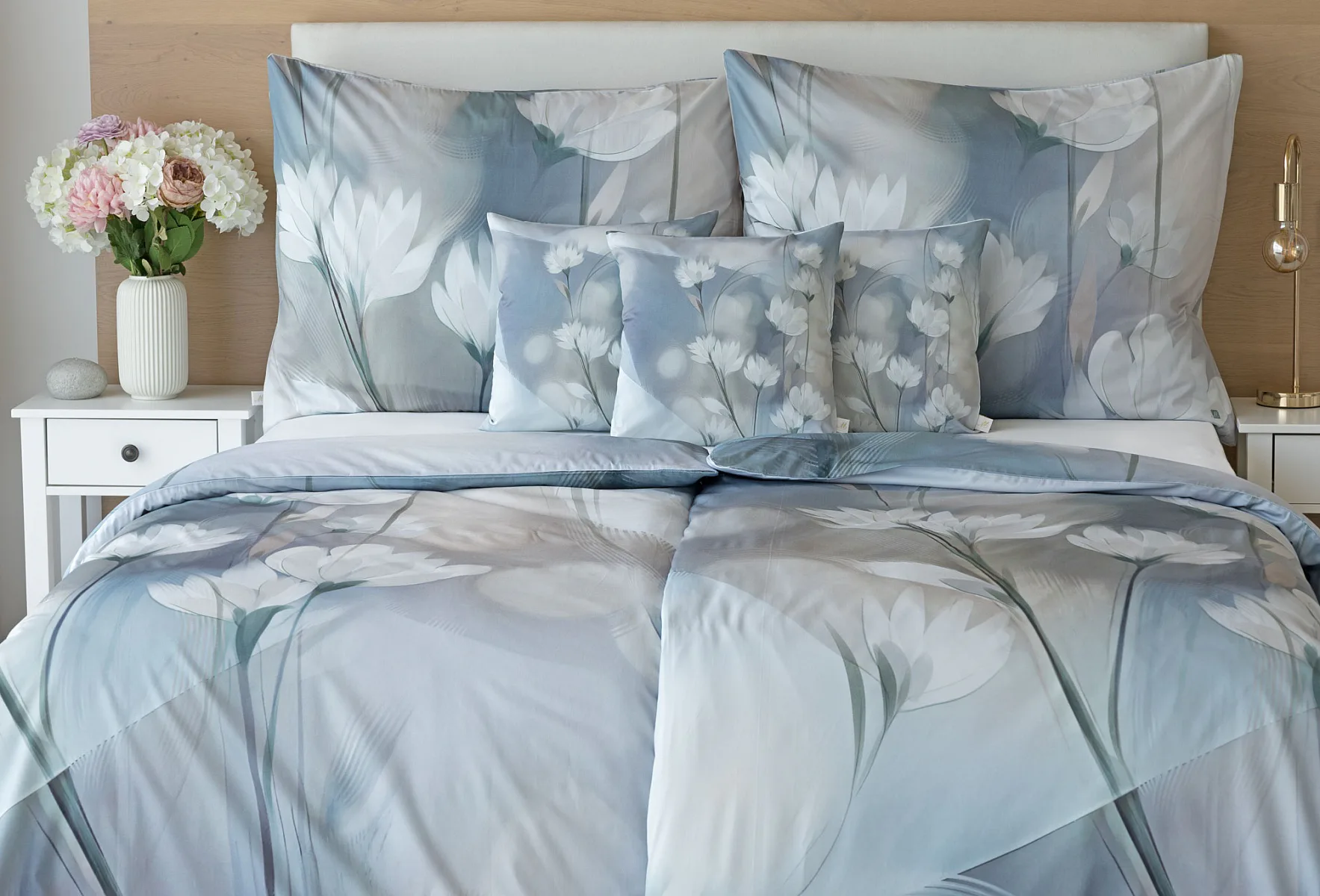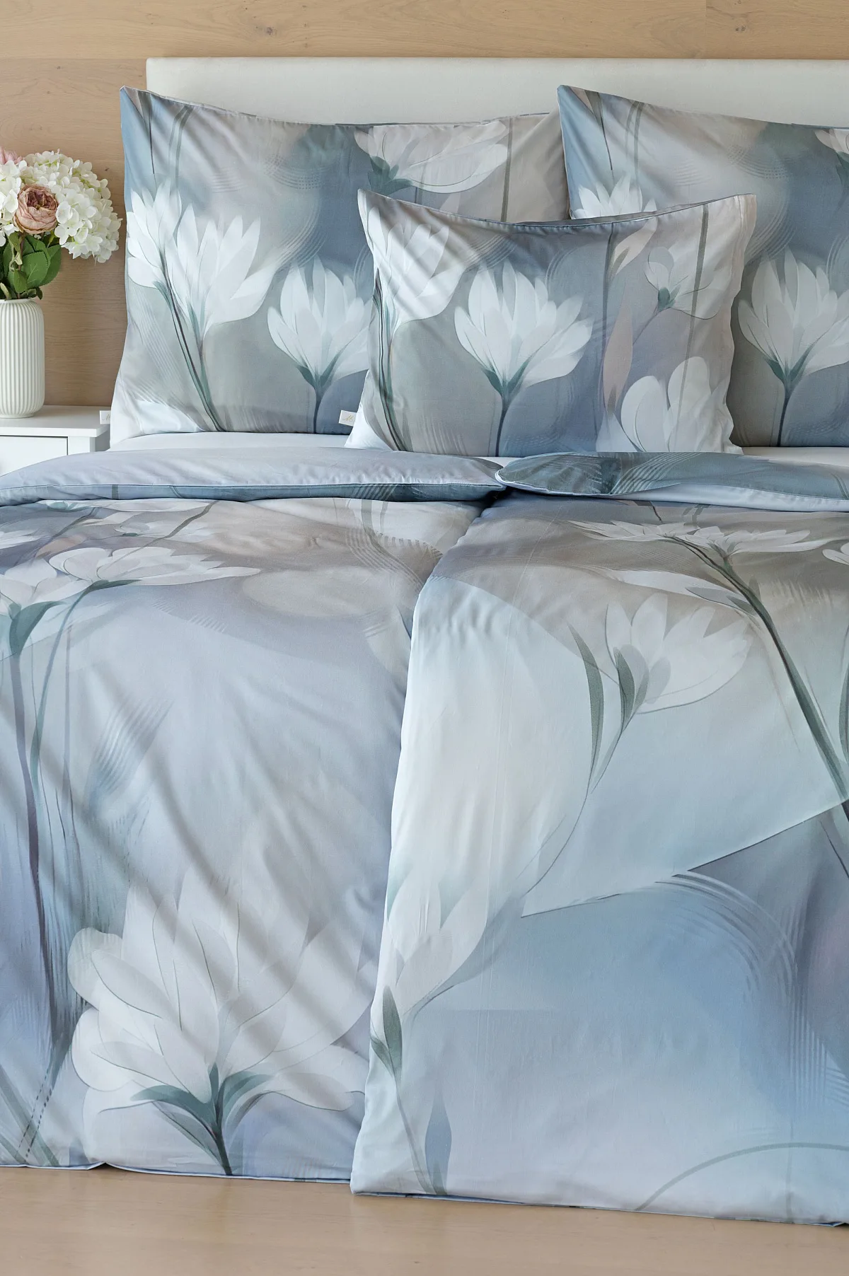 Vzoru Eloise dominuje atraktivní florální motiv v paletě modrých a tlumených pudrových tónů. Povlak na polštář i na přikrývku je z obou stran stejný, vrchní stranu povlaku na polštář zdobí malé logo "M" v pravém dolním rohu. Povlečení je opatřeno komfortním zipovým uzávěrem.