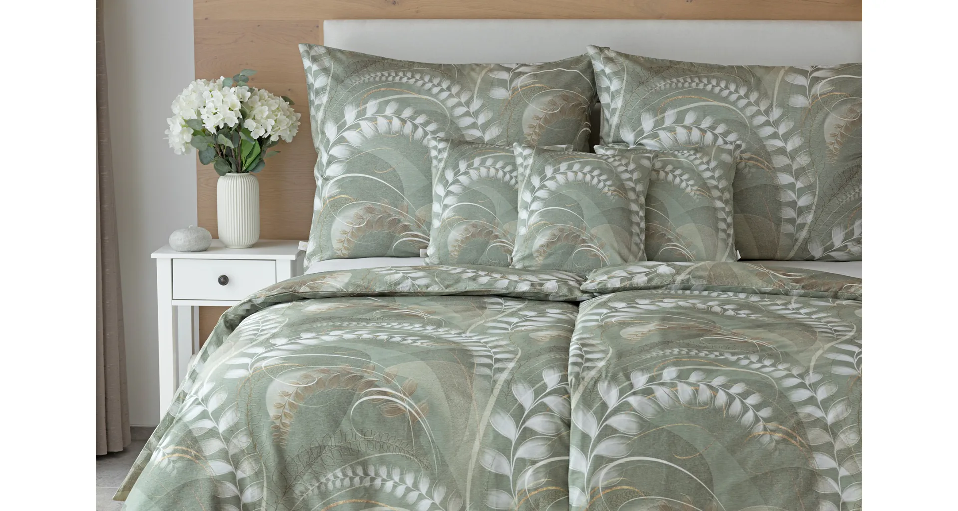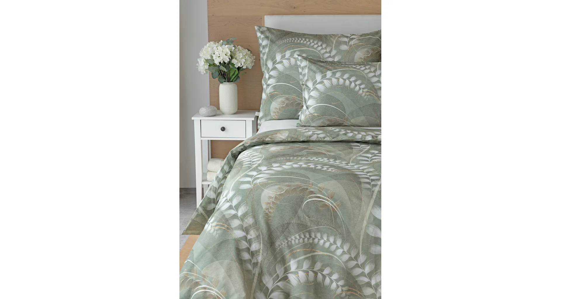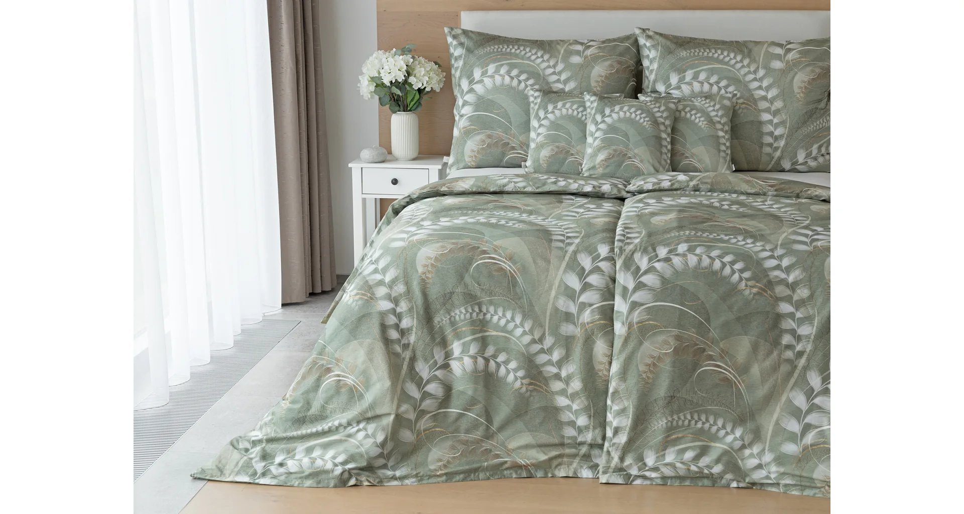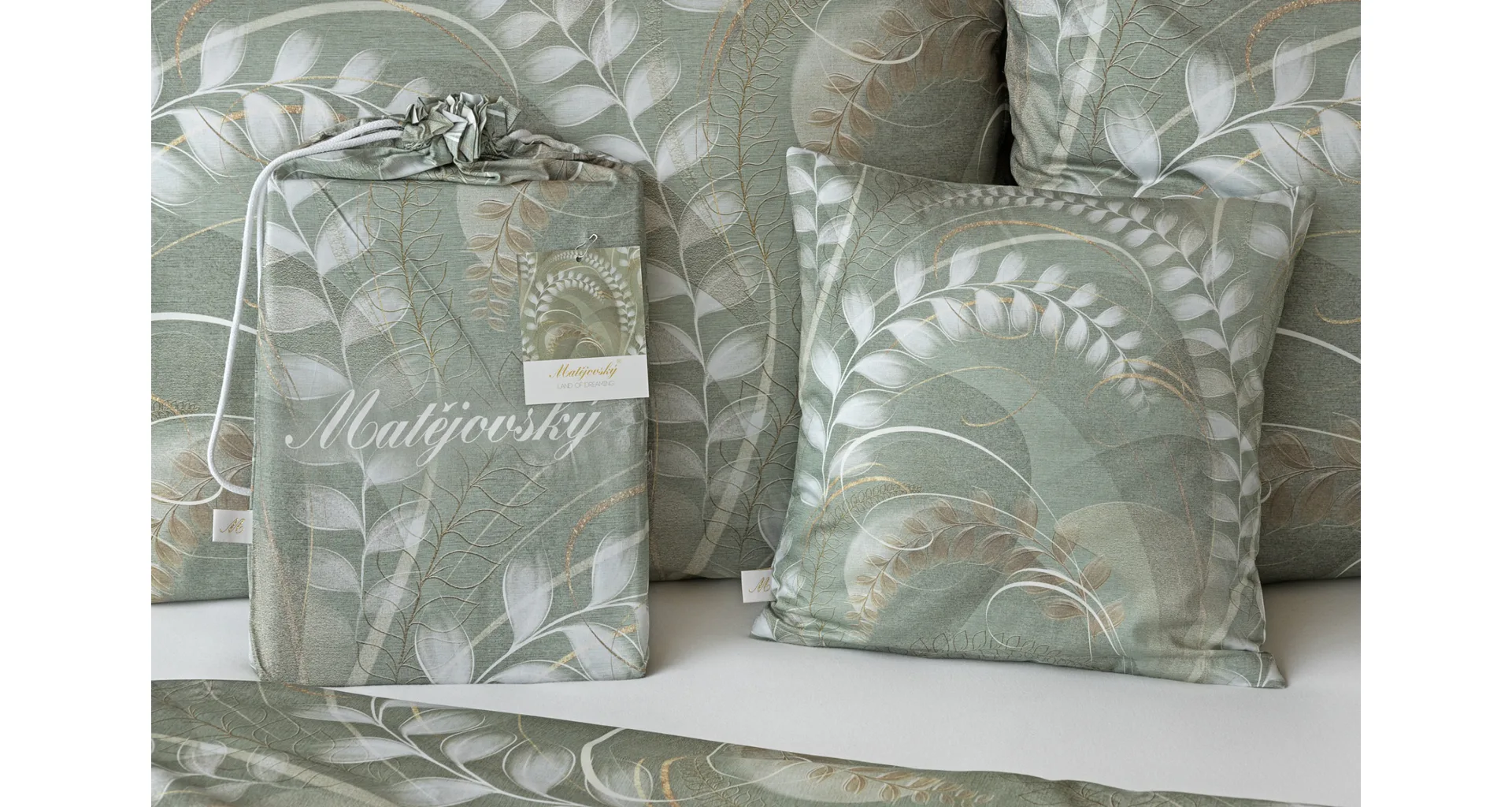 Vzor Ezra zdobí elegantní florální motiv v paletě krémových a zlatohnědých tónů na tlumeném zelenošedém podkladu. Povlak na polštář i na přikrývku je z obou stran stejný, povlečení je opatřeno komfortním zipovým uzávěrem.