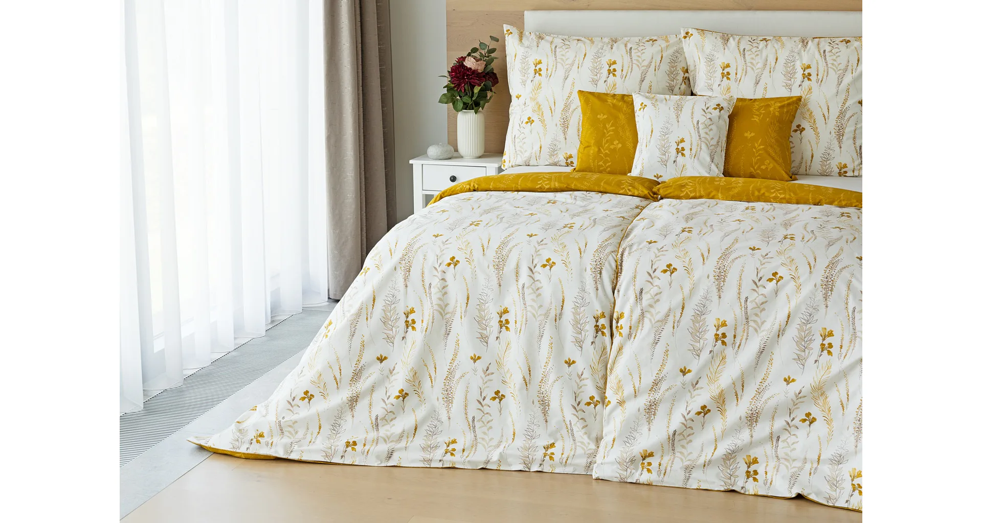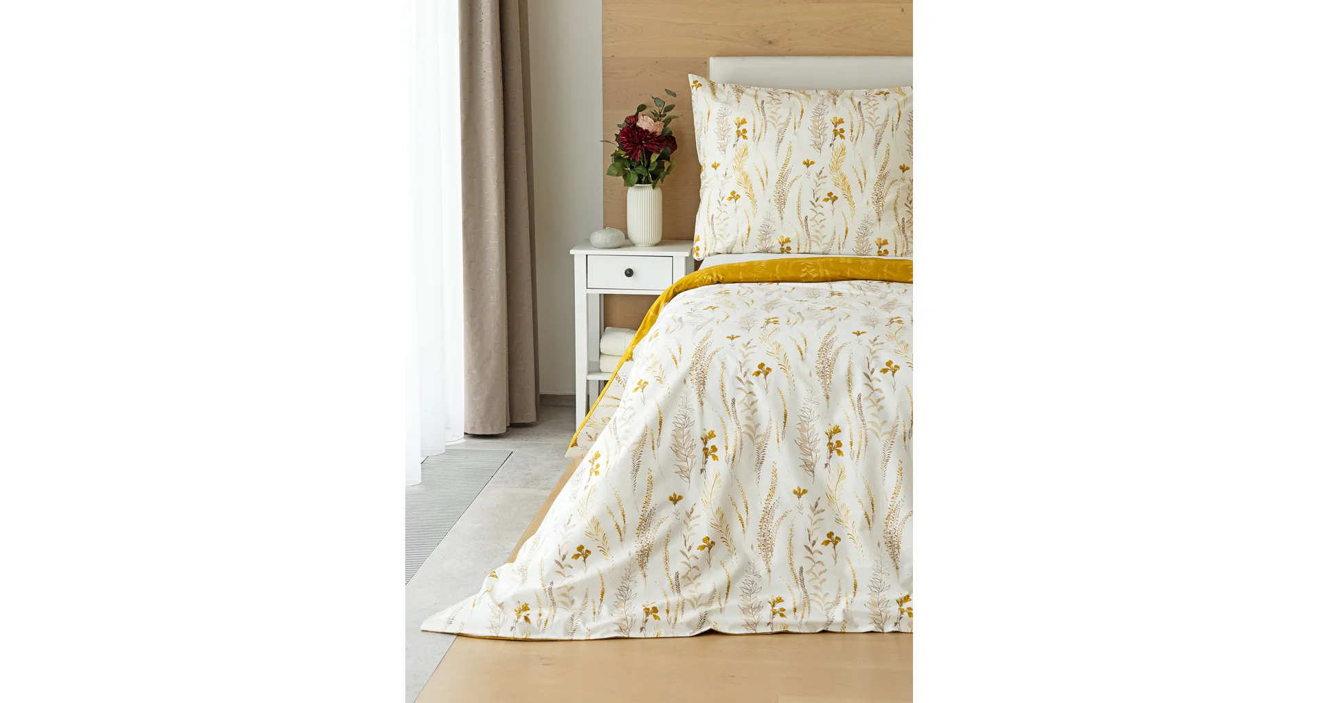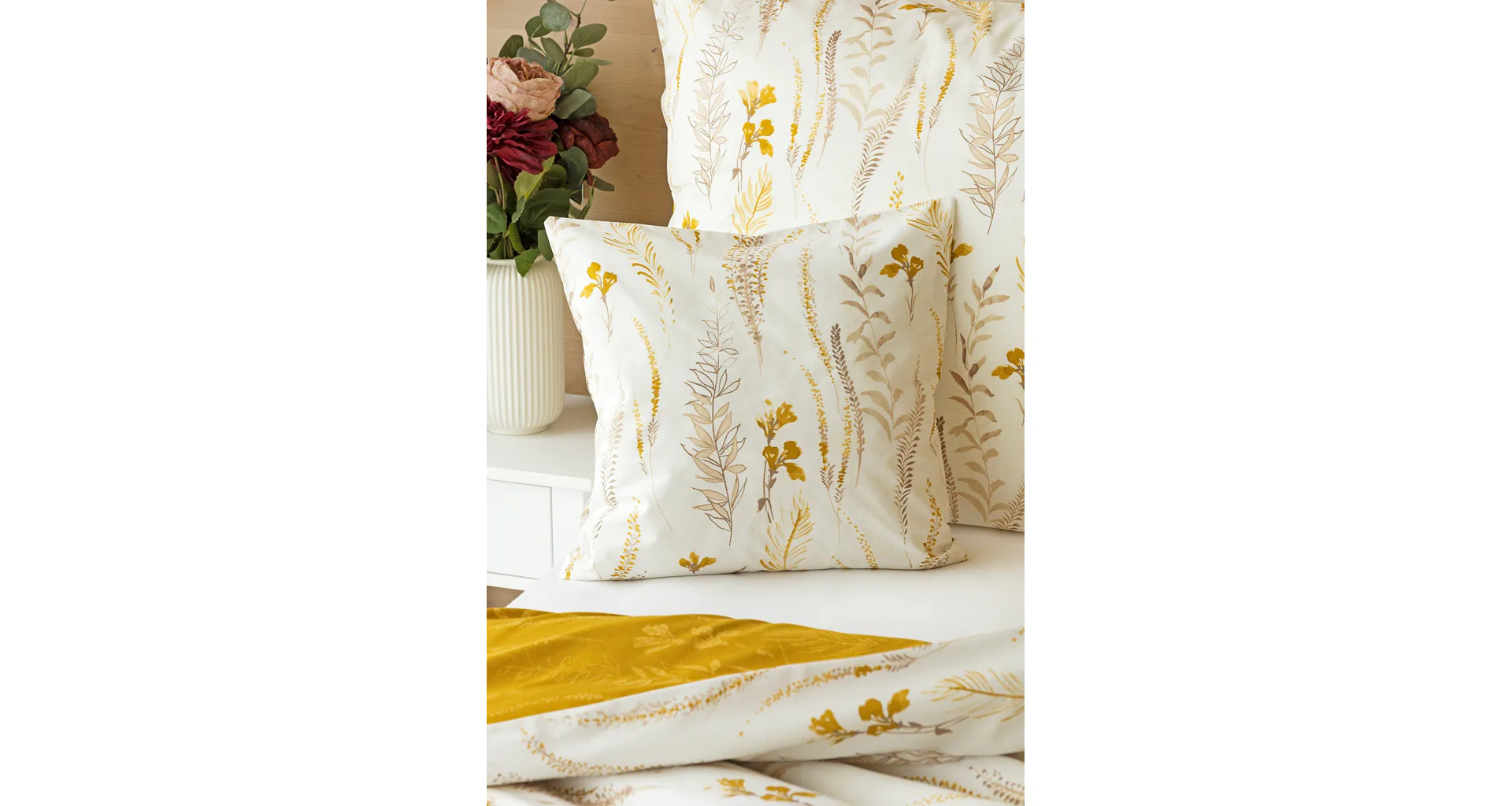 Nechte se okouzlit hřejivou souhrou barev v květinovém vzoru bavlněného povlečení Fabien. Jemný florální motiv v paletě hnědých a medově žlutých tónů se vyjímá z jedné strany na krémovém podkladu. Z druhé strany jsou světlé kontury květů zaneseny do medově žlutého podkladu. Díky tomuto oblíbenému oboustrannému provedení můžete při stlaní hravě experimentovat!