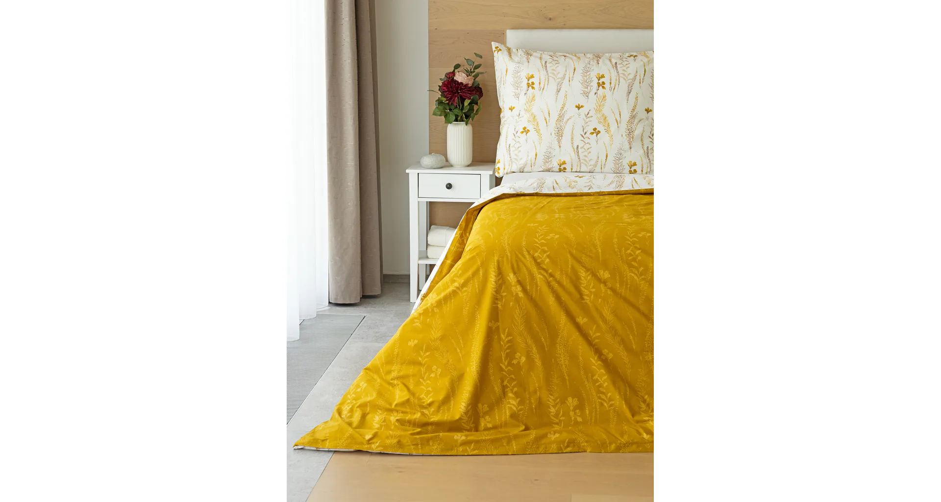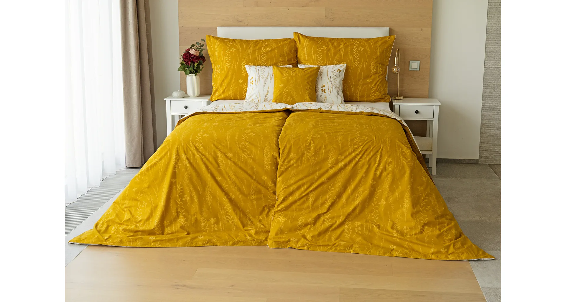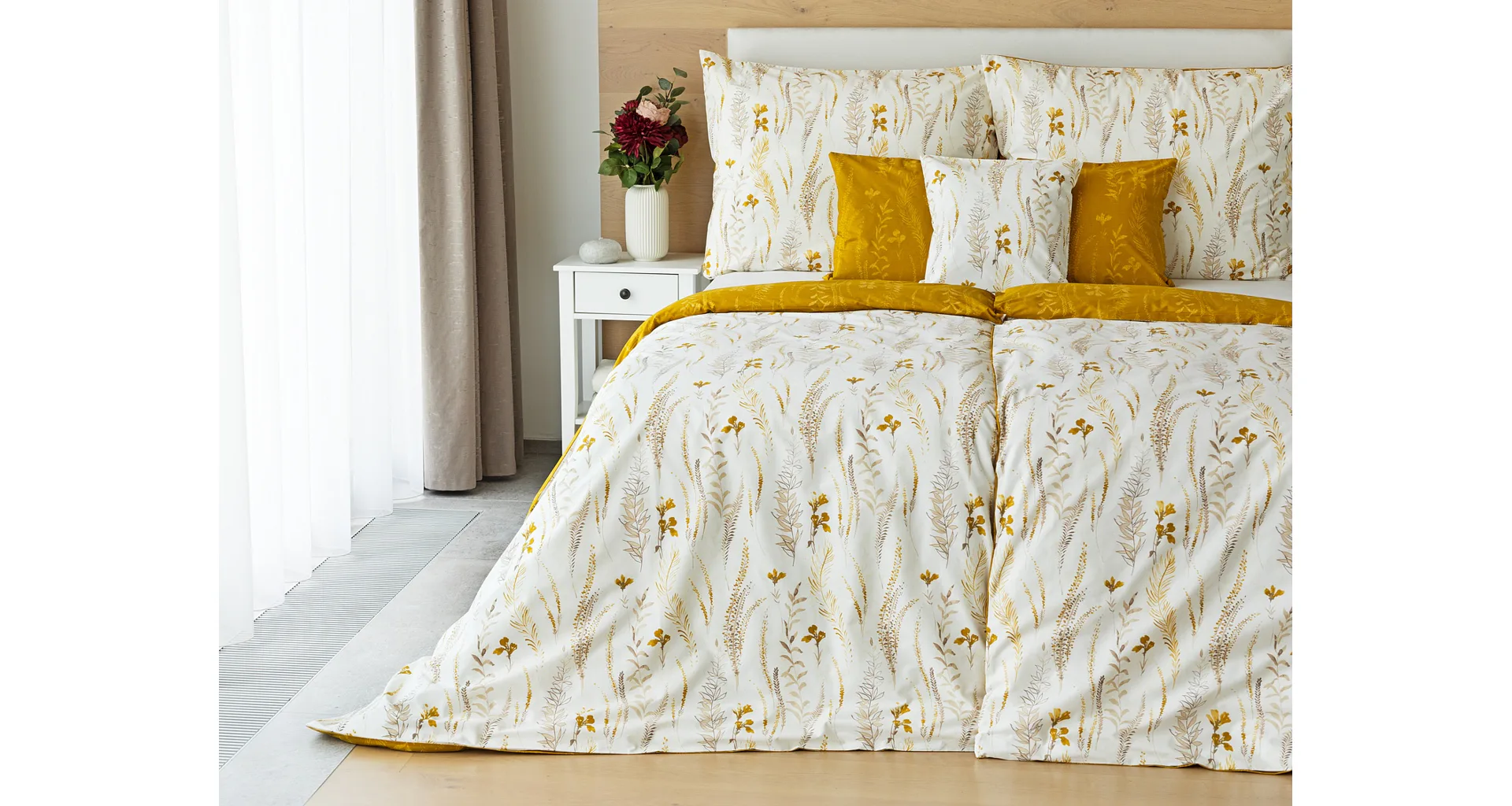 Nechte se okouzlit hřejivou souhrou barev v květinovém vzoru bavlněného povlečení Fabien. Jemný florální motiv v paletě hnědých a medově žlutých tónů se vyjímá z jedné strany na krémovém podkladu. Z druhé strany jsou světlé kontury květů zaneseny do medově žlutého podkladu. Díky tomuto oblíbenému oboustrannému provedení můžete při stlaní hravě experimentovat!