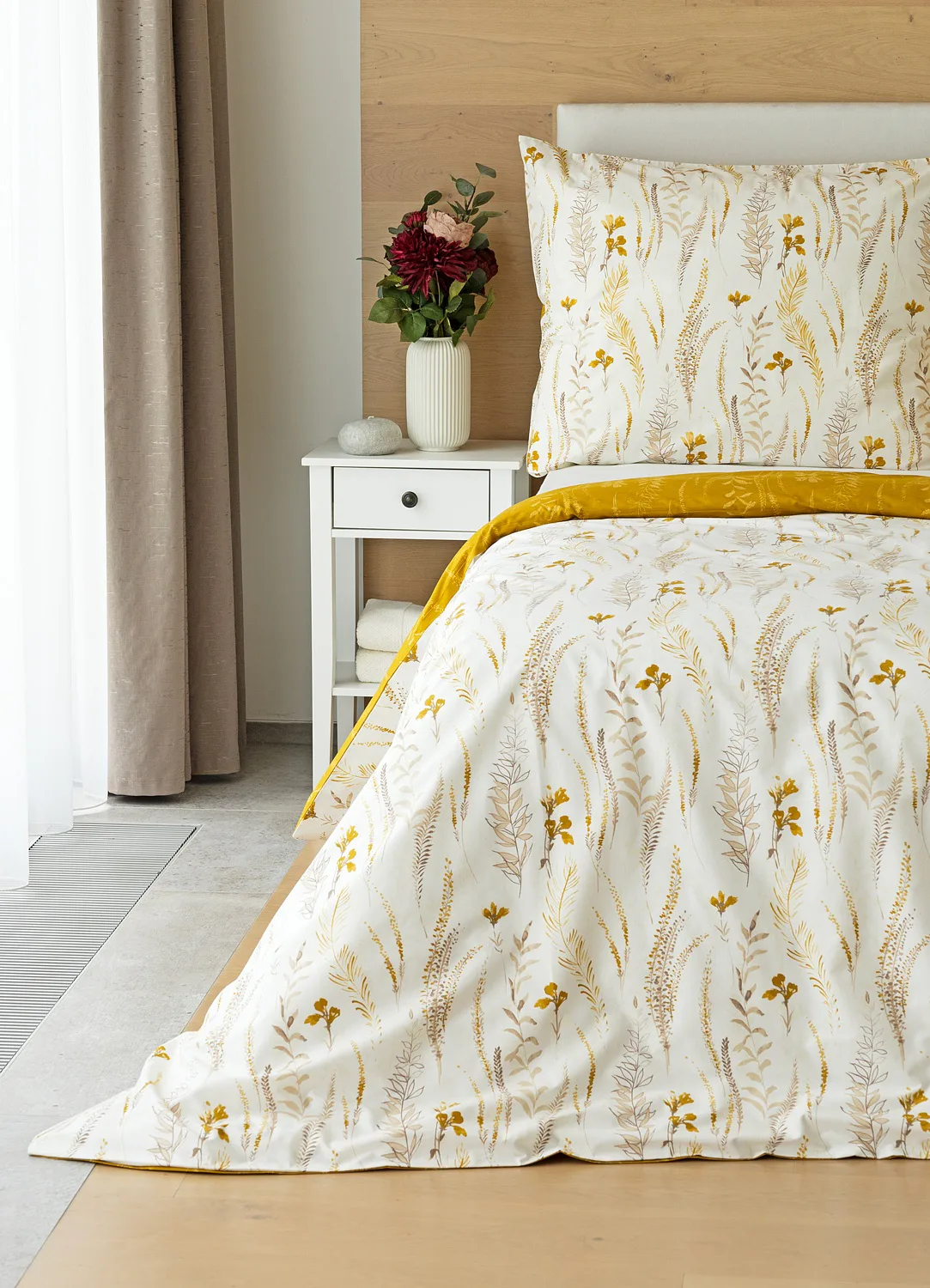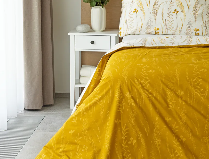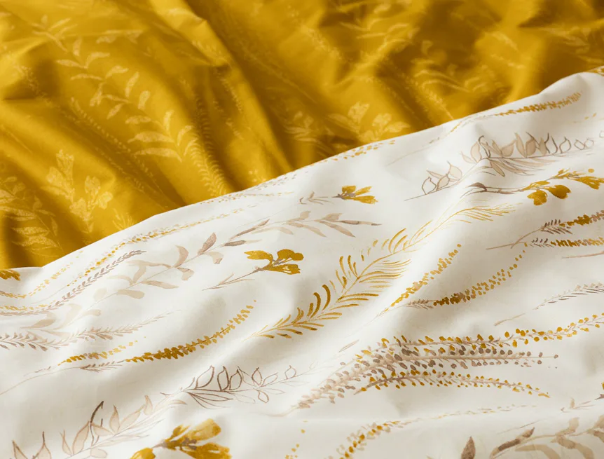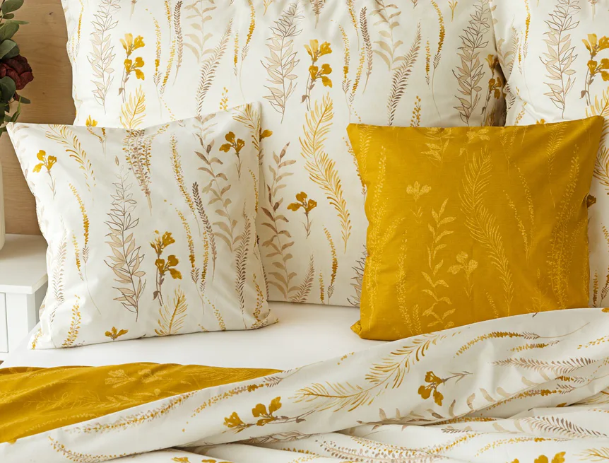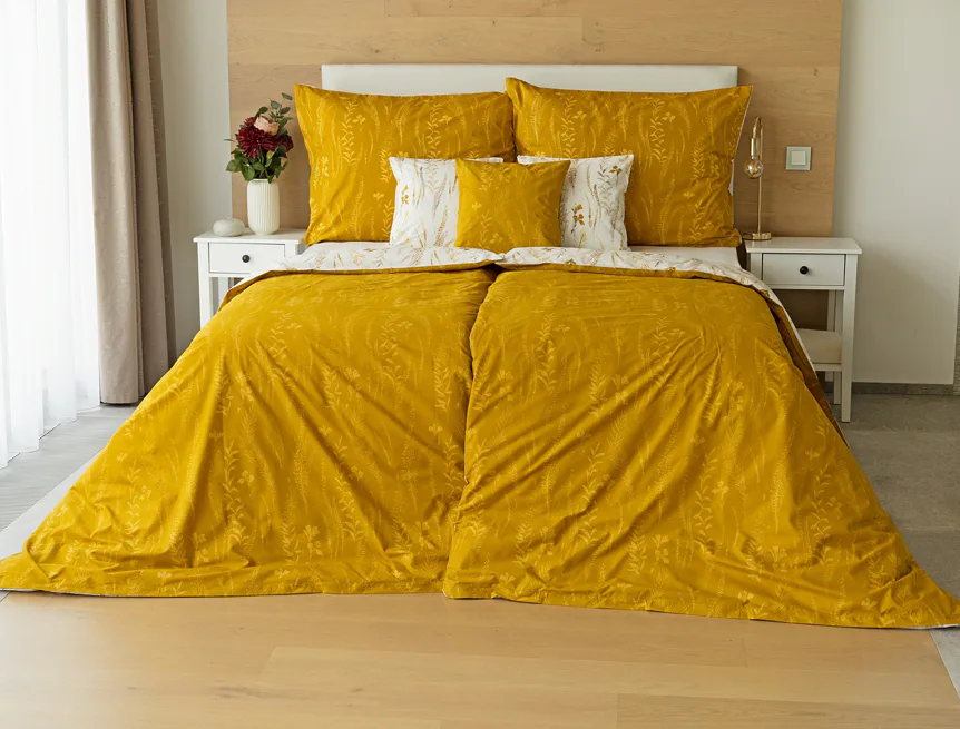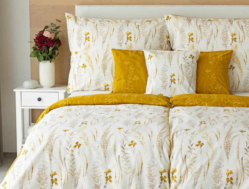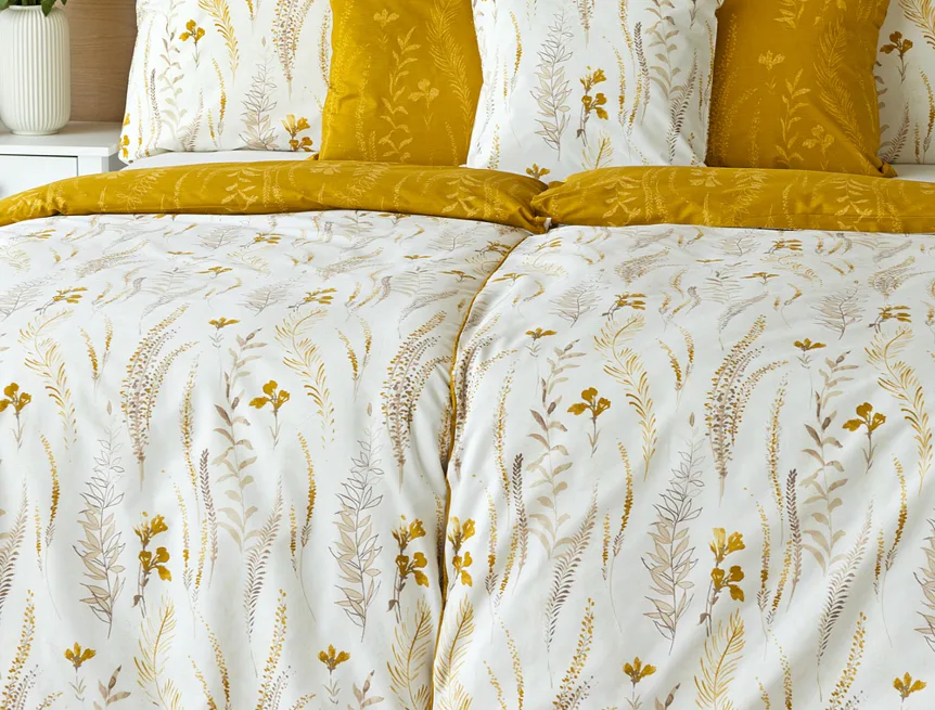 Nechte se okouzlit hřejivou souhrou barev v květinovém vzoru bavlněného povlečení Fabien. Jemný florální motiv v paletě hnědých a medově žlutých tónů se vyjímá z jedné strany na krémovém podkladu. Z druhé strany jsou světlé kontury květů zaneseny do medově žlutého podkladu. Díky tomuto oblíbenému oboustrannému provedení můžete při stlaní hravě experimentovat!