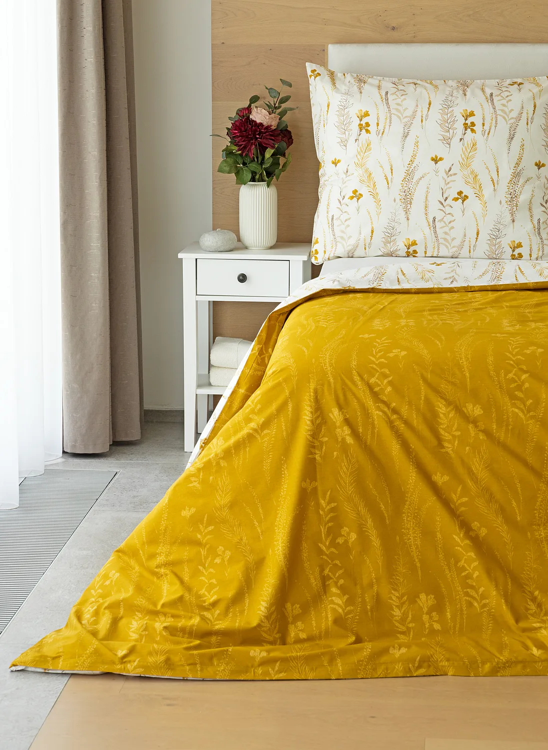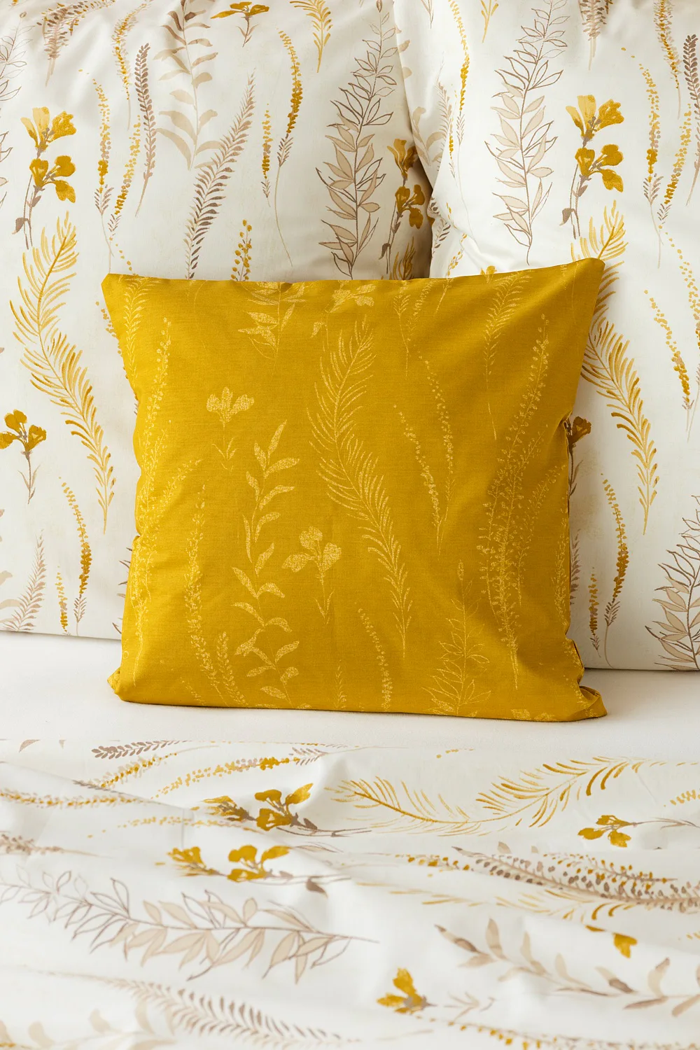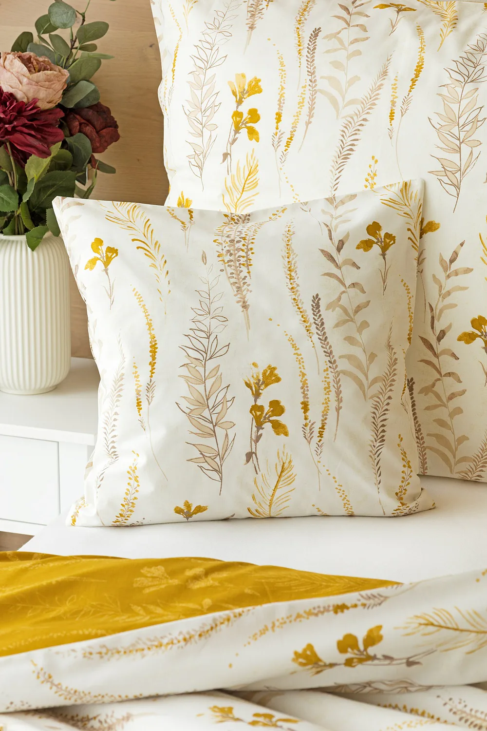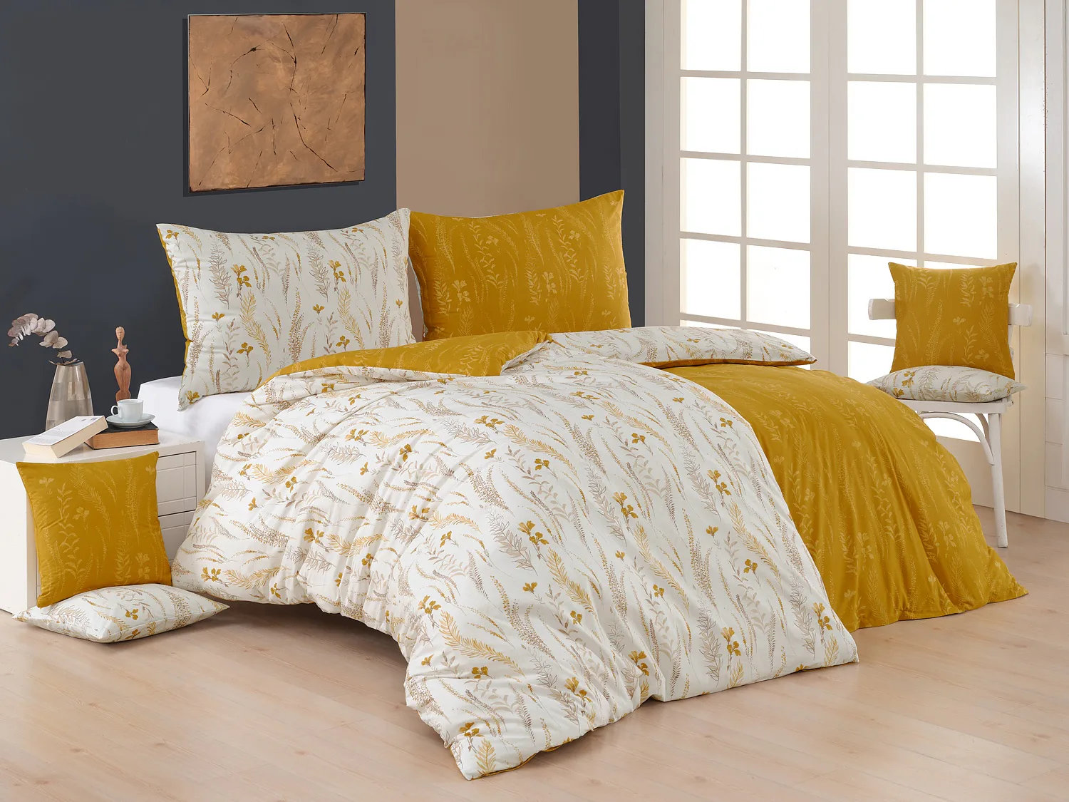 Nechte se okouzlit hřejivou souhrou barev v květinovém vzoru bavlněného povlečení Fabien. Jemný florální motiv v paletě hnědých a medově žlutých tónů se vyjímá z jedné strany na krémovém podkladu. Z druhé strany jsou světlé kontury květů zaneseny do medově žlutého podkladu. Díky tomuto oblíbenému oboustrannému provedení můžete při stlaní hravě experimentovat!