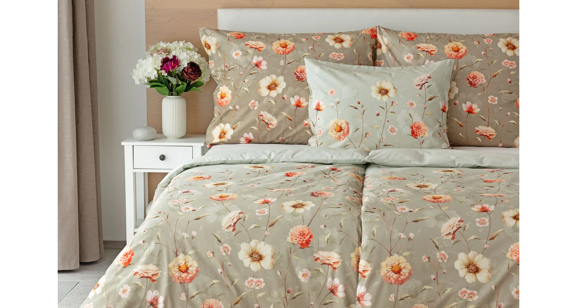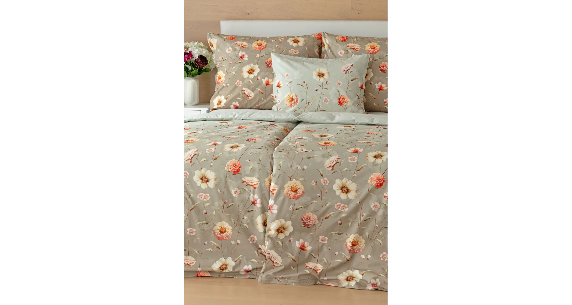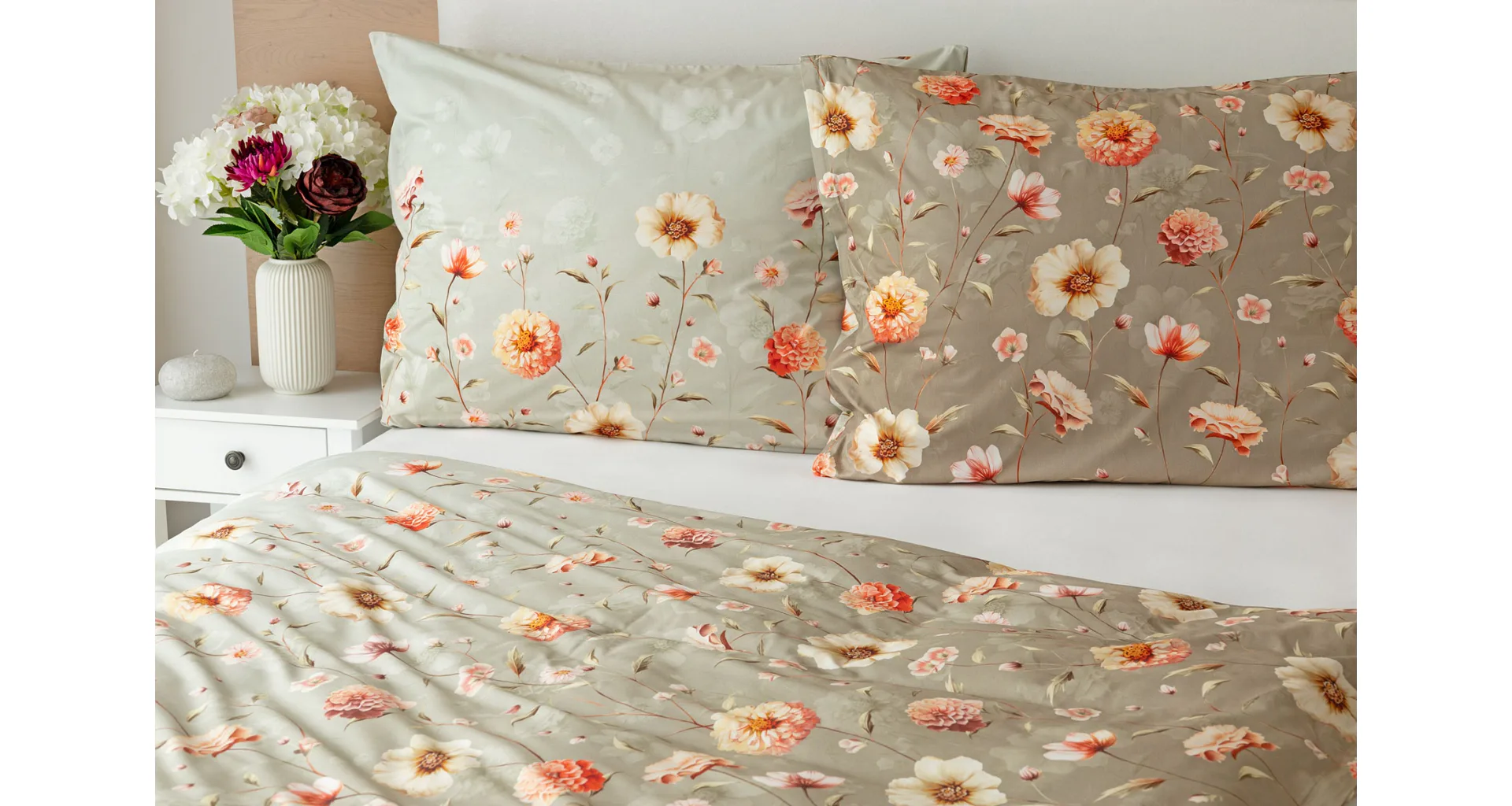 Okouzlující květinovou souhru v hřejivých barvách přináší bavlněné ložní povlečení Floral. Dominantní jiřiny s korálově růžovými květy doplňuje luční kvítí v přírodních tónech. Podkladová barva ložního povlečení přechází od spodní šedozelené po světlounce šedou.