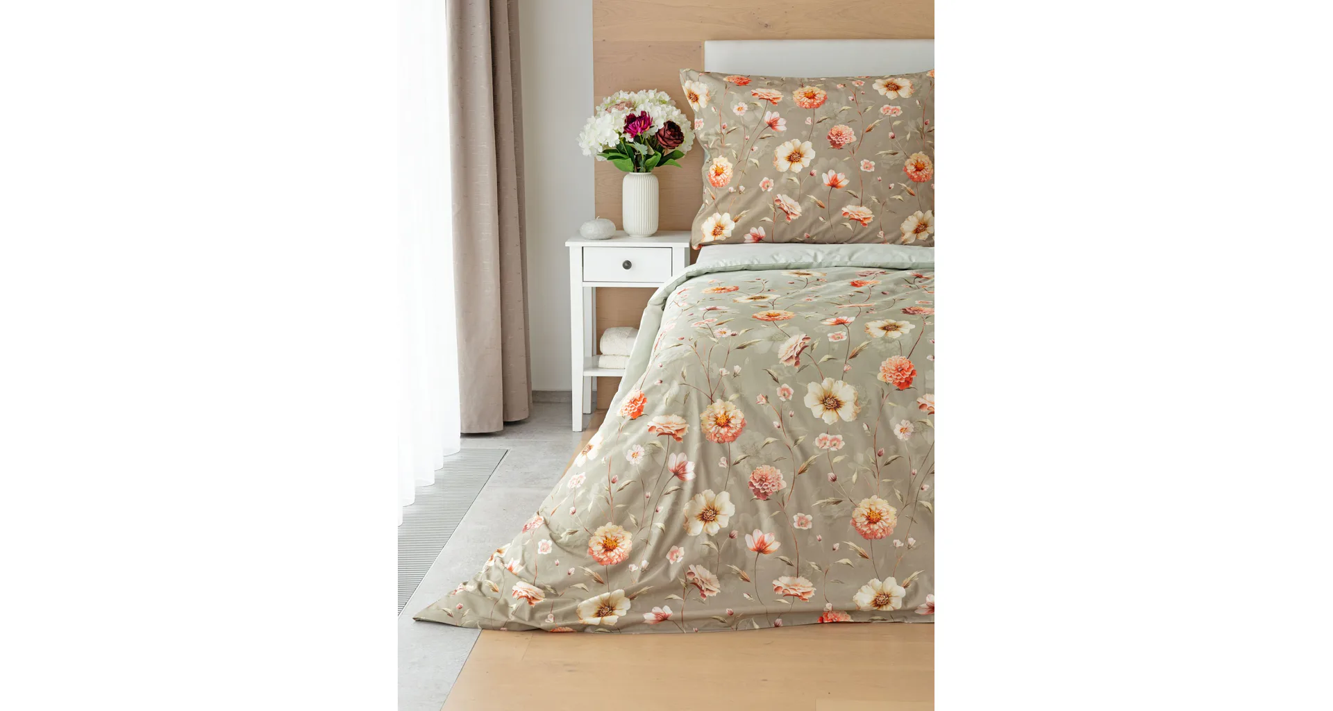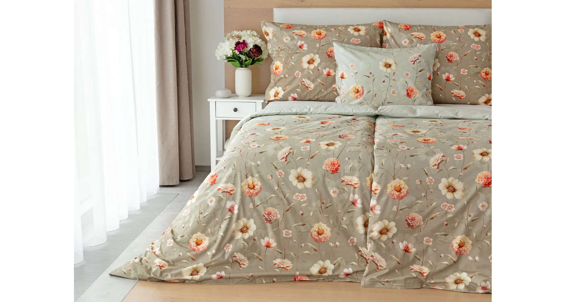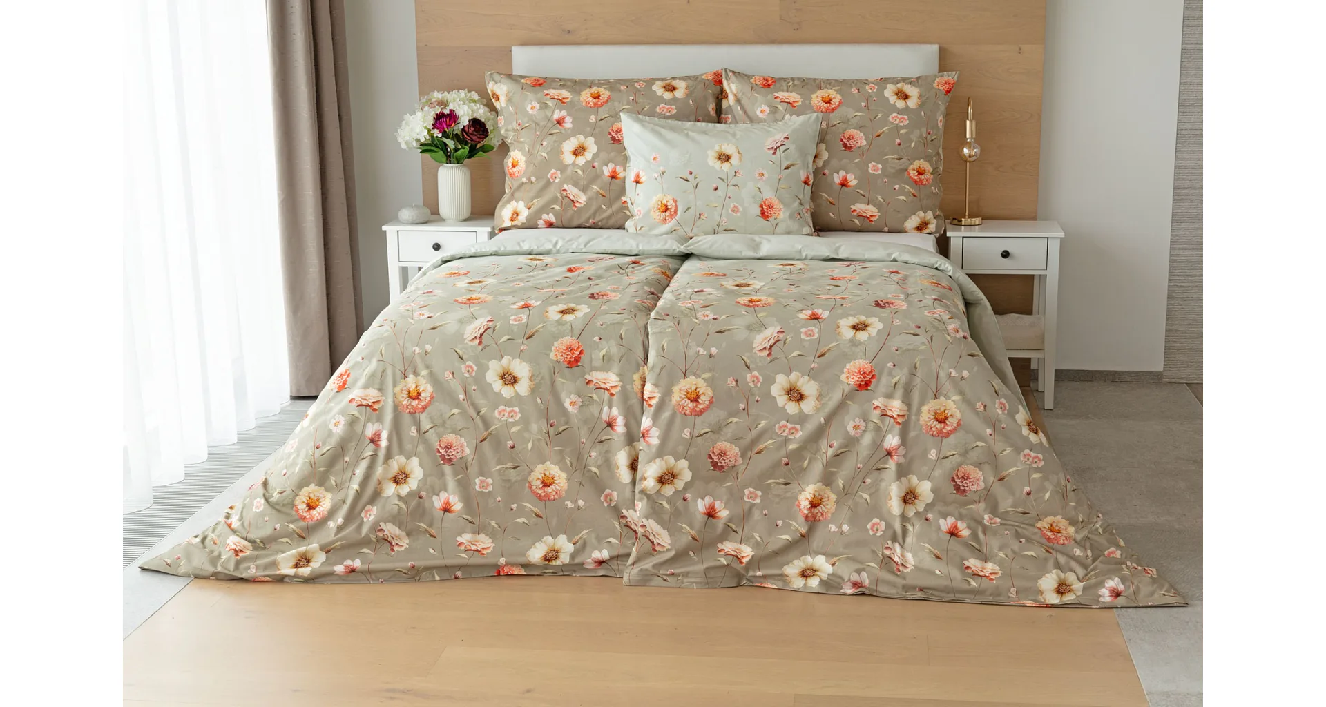 Okouzlující květinovou souhru v hřejivých barvách přináší bavlněné ložní povlečení Floral. Dominantní jiřiny s korálově růžovými květy doplňuje luční kvítí v přírodních tónech. Podkladová barva ložního povlečení přechází od spodní šedozelené po světlounce šedou.