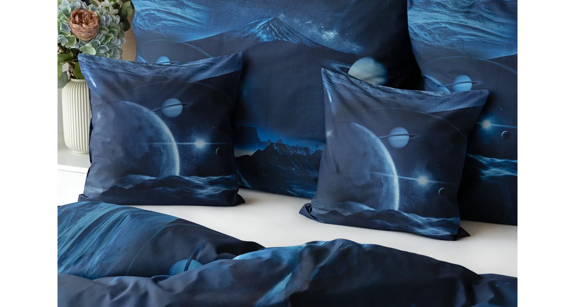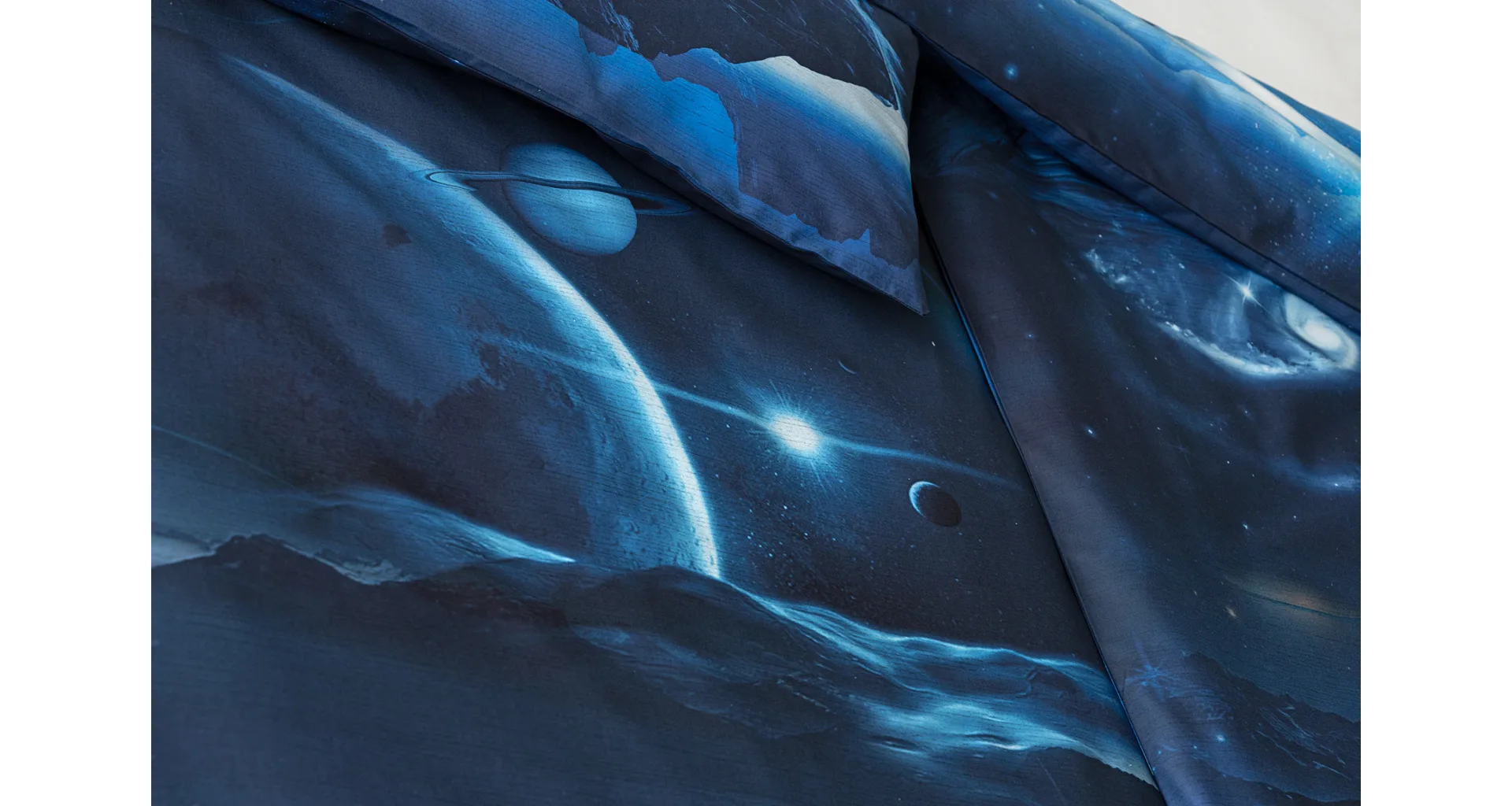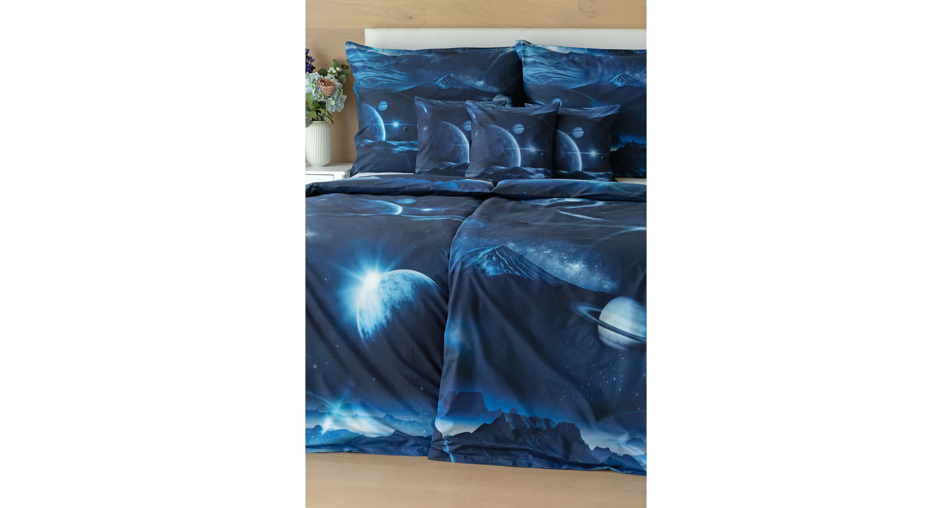 Objevte tajemství vesmíru přímo z vaší ložnice s hebkým bavlněným povlečením Galaxie. Tmavě modrý podklad zdobí motivy planet. Díky nejmodernějšímu digitálním tisku vyniká vzor v precizním detailu. Přeneste se do vesmíru každou noc a nechte své sny volně plynout mezi hvězdami.