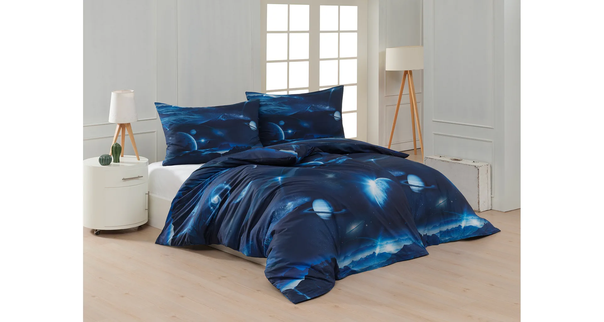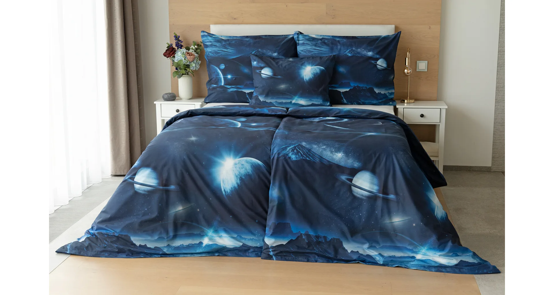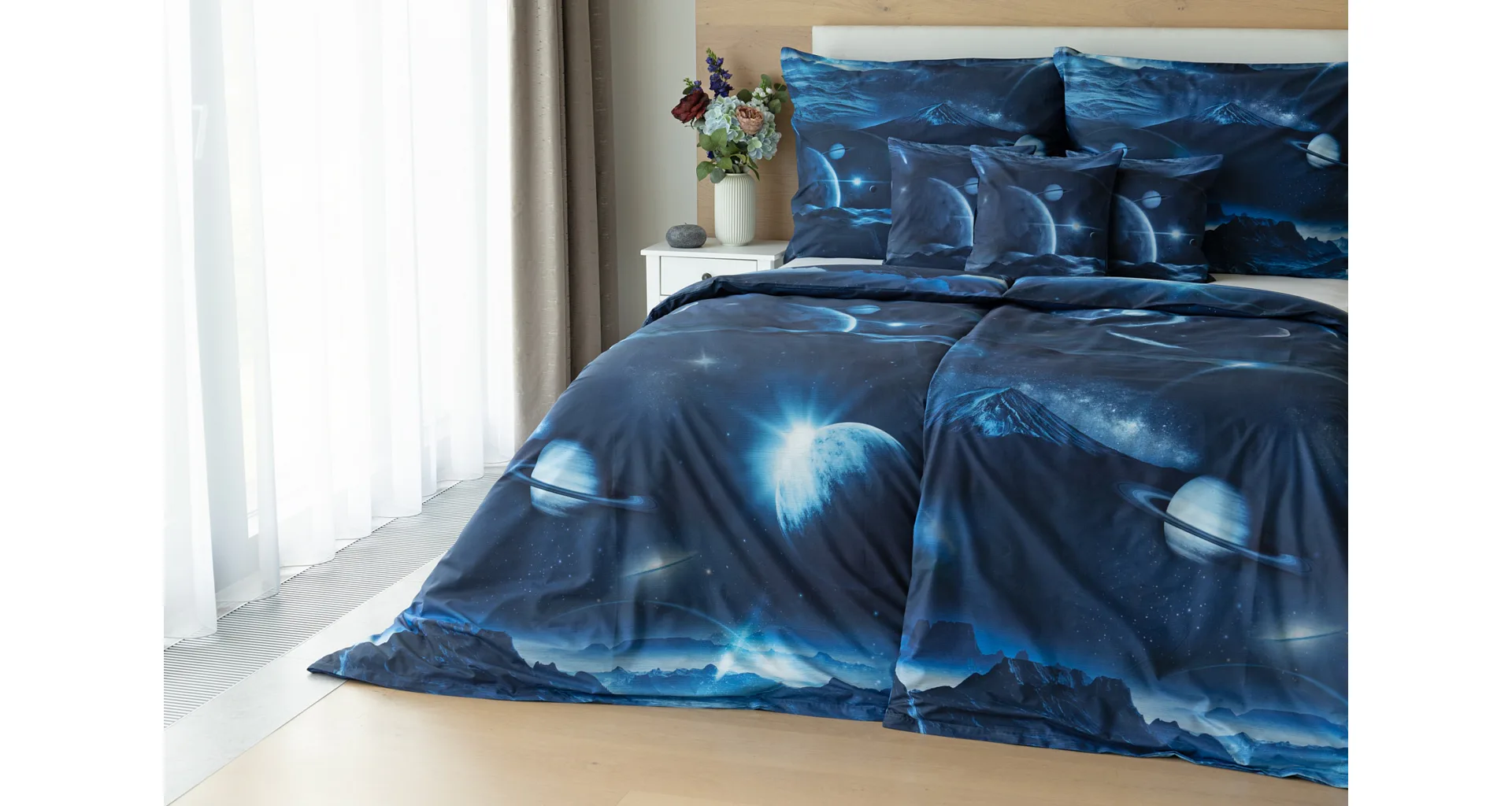 Objevte tajemství vesmíru přímo z vaší ložnice s hebkým bavlněným povlečením Galaxie. Tmavě modrý podklad zdobí motivy planet. Díky nejmodernějšímu digitálním tisku vyniká vzor v precizním detailu. Přeneste se do vesmíru každou noc a nechte své sny volně plynout mezi hvězdami.