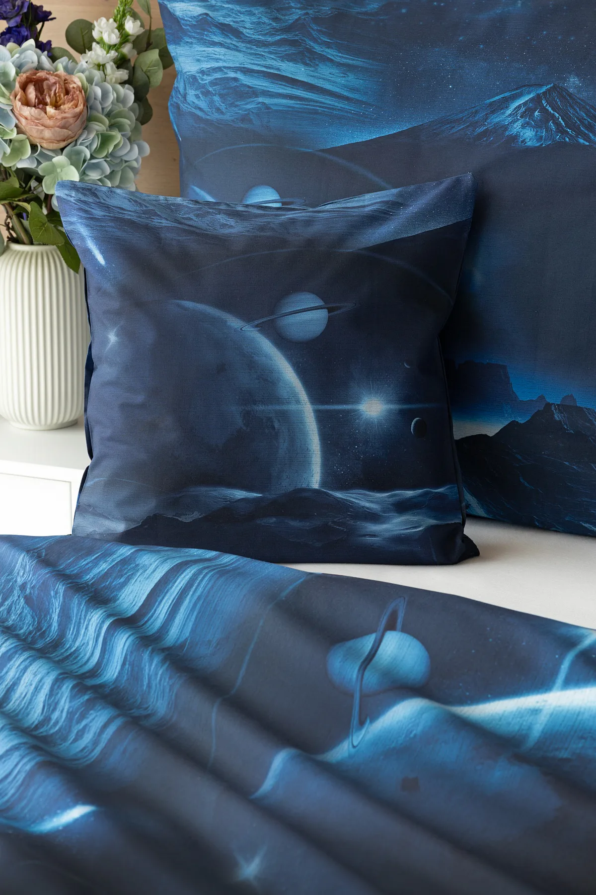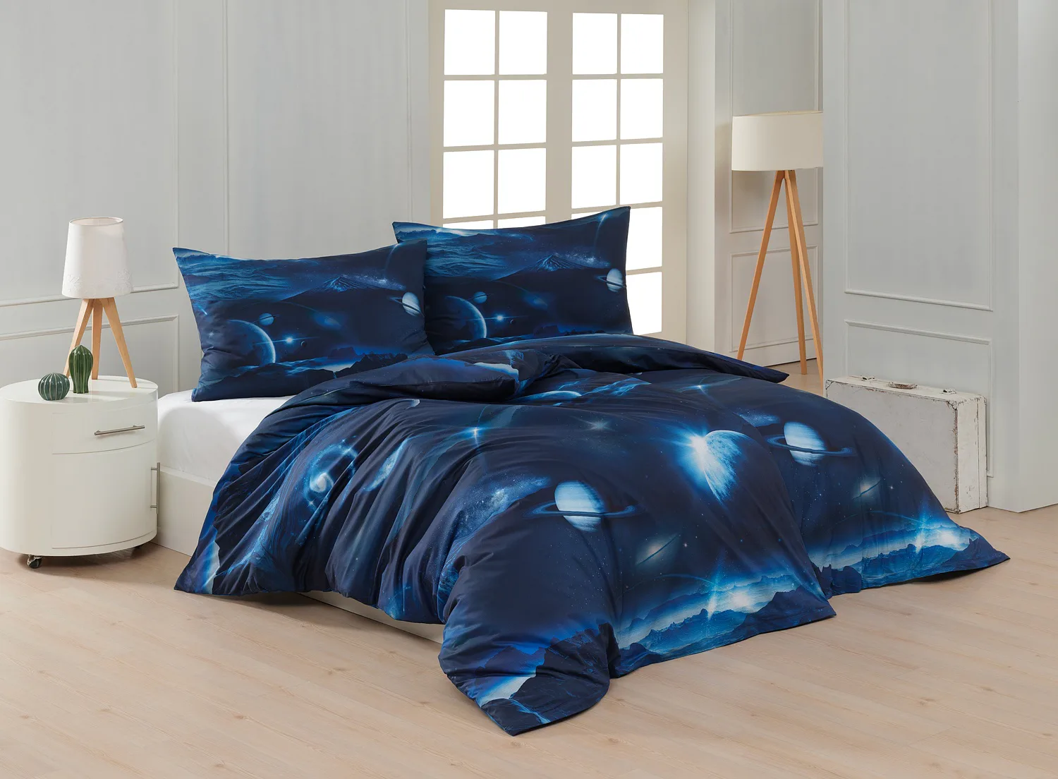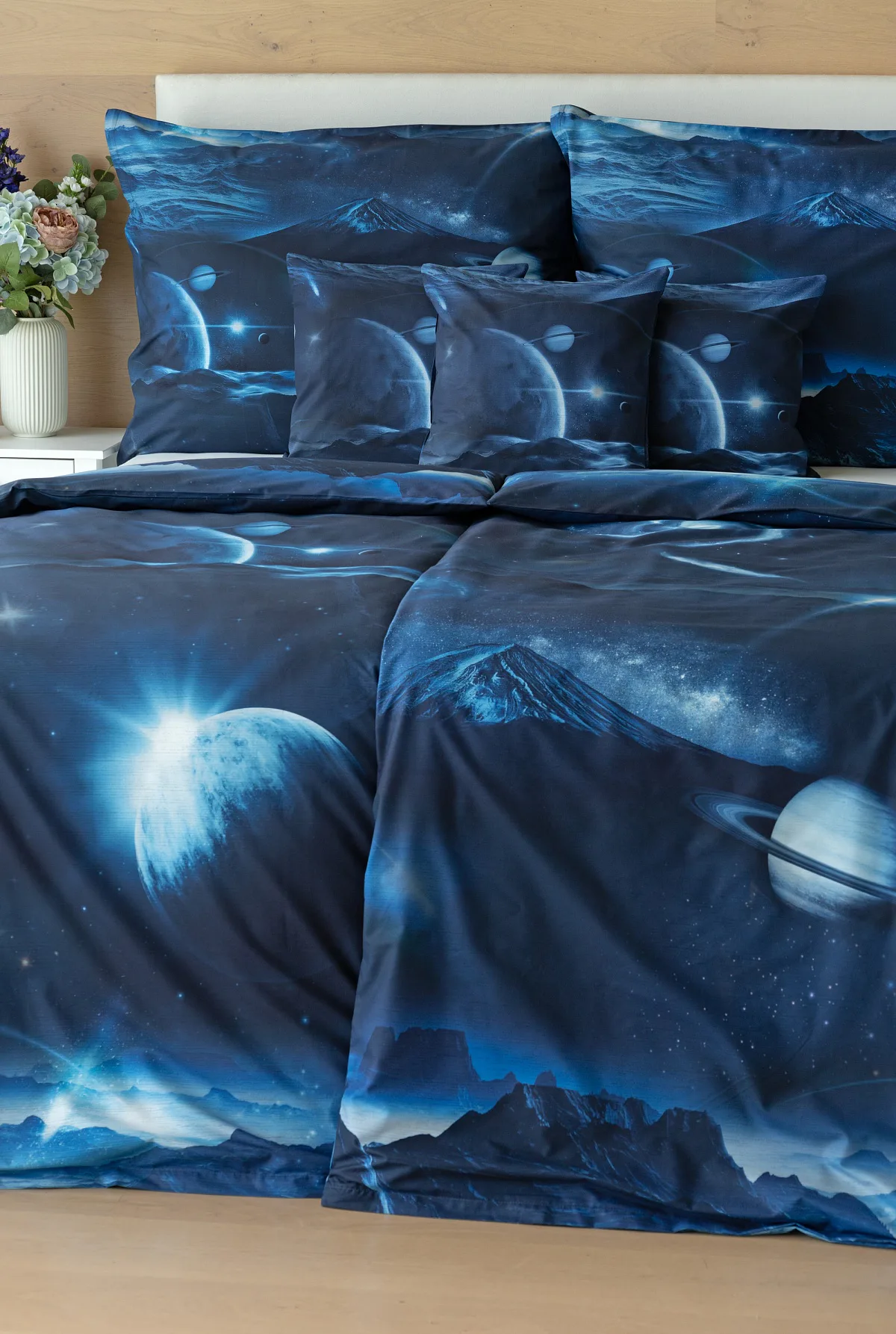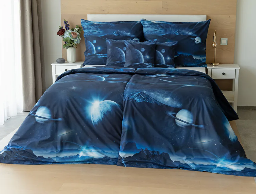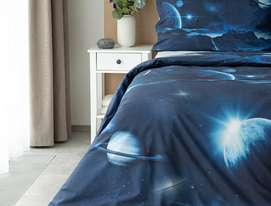 Objevte tajemství vesmíru přímo z vaší ložnice s hebkým bavlněným povlečením Galaxie. Tmavě modrý podklad zdobí motivy planet. Díky nejmodernějšímu digitálním tisku vyniká vzor v precizním detailu. Přeneste se do vesmíru každou noc a nechte své sny volně plynout mezi hvězdami.