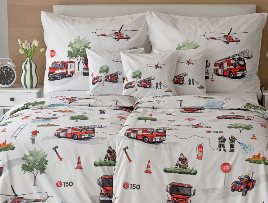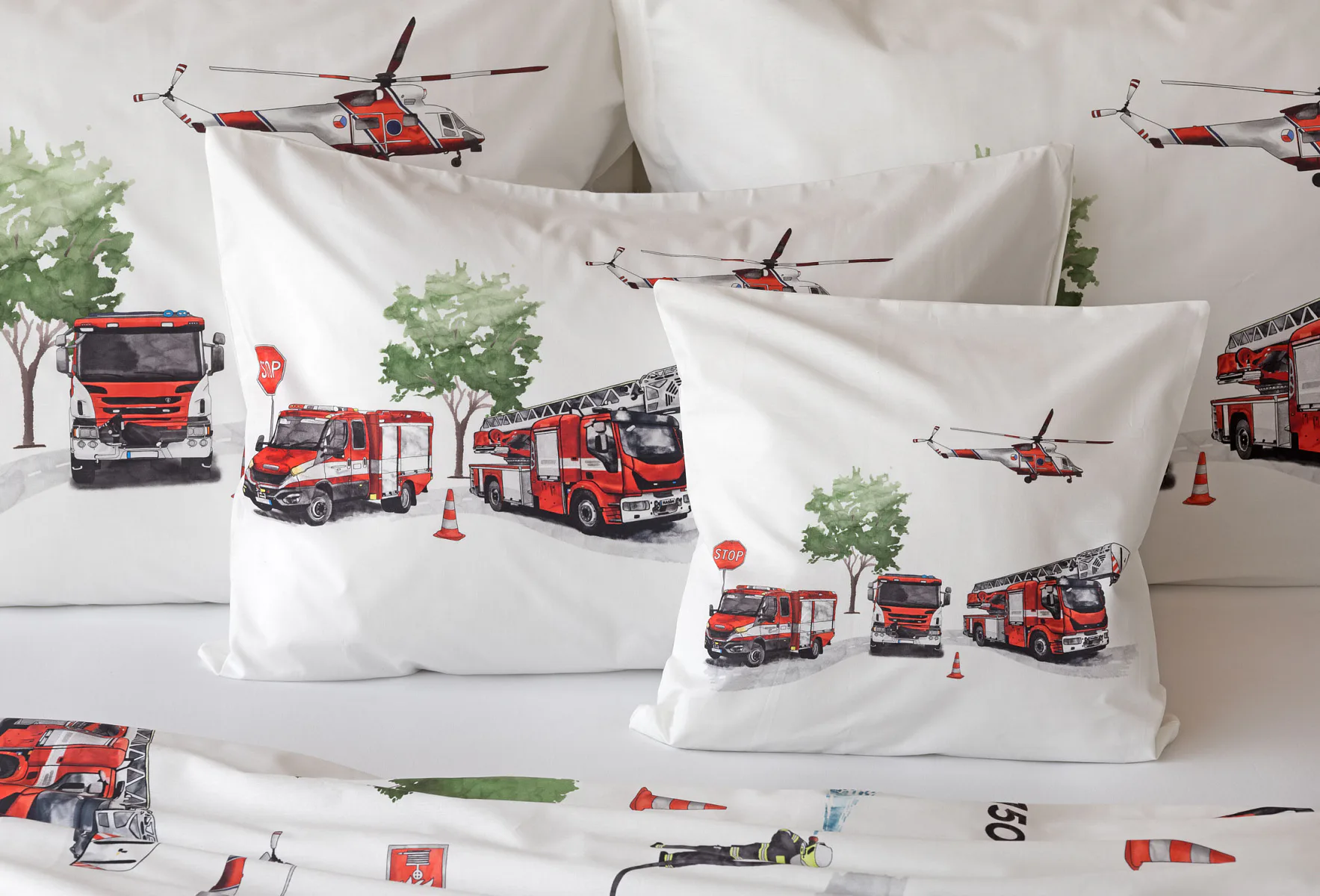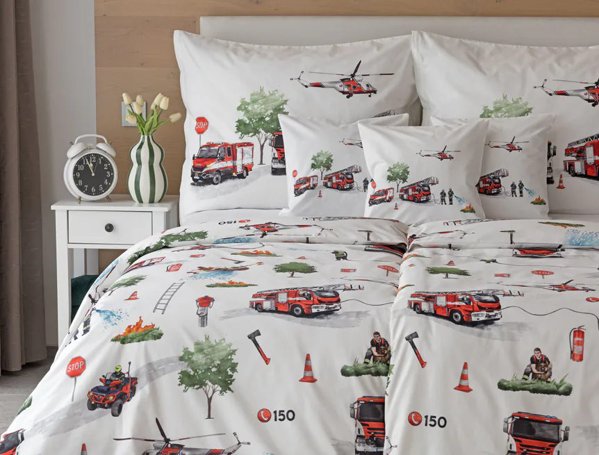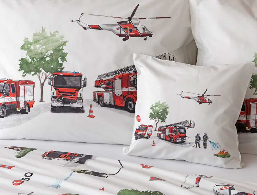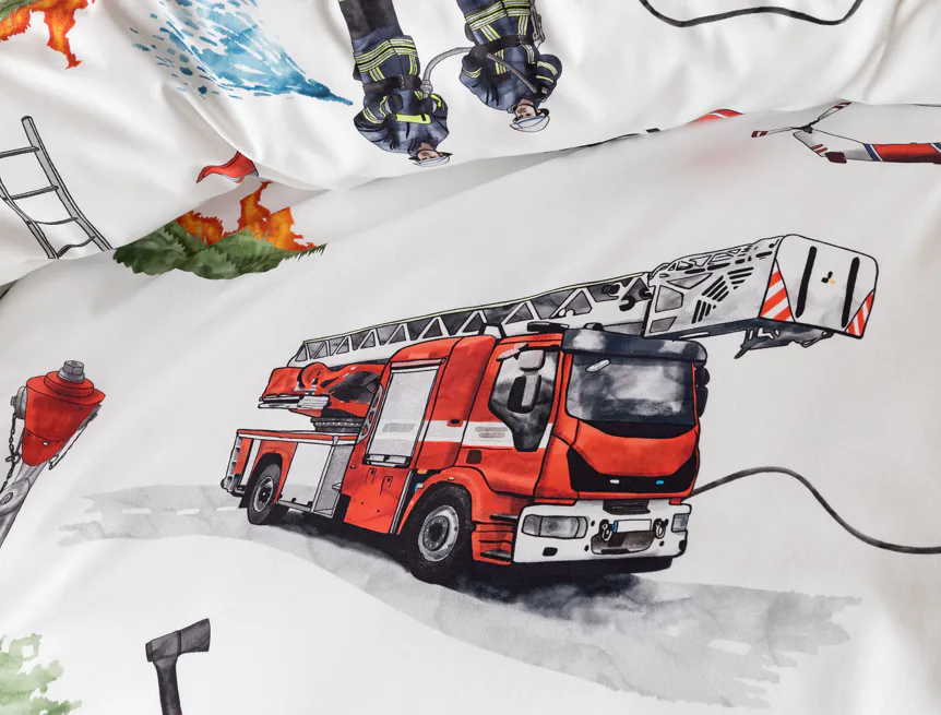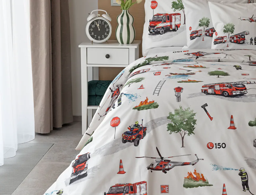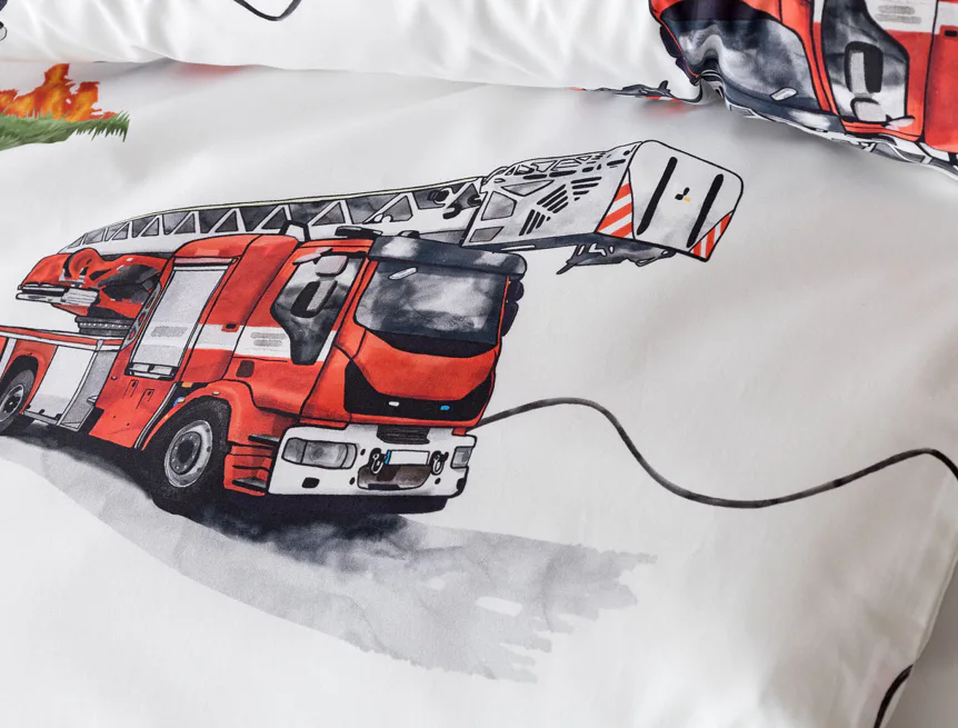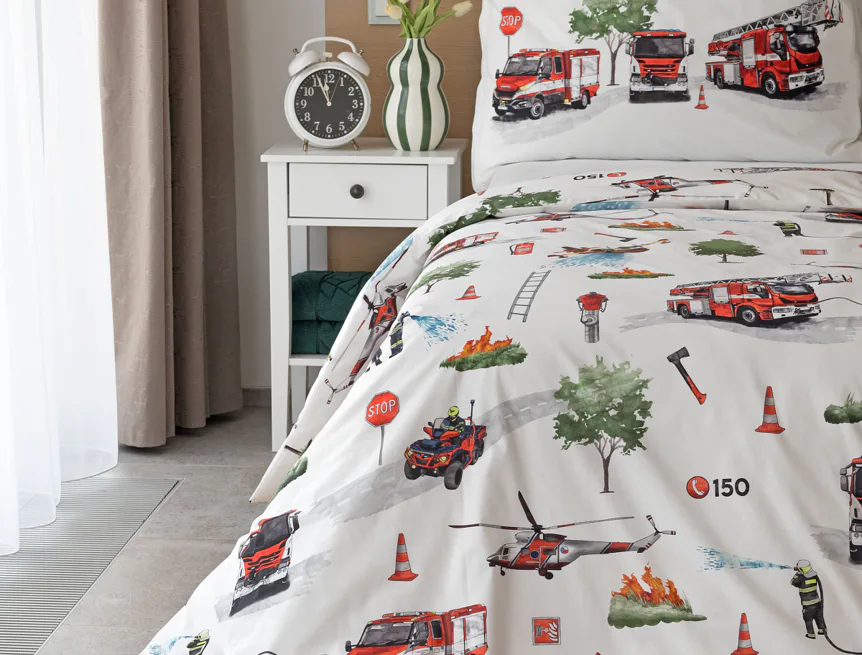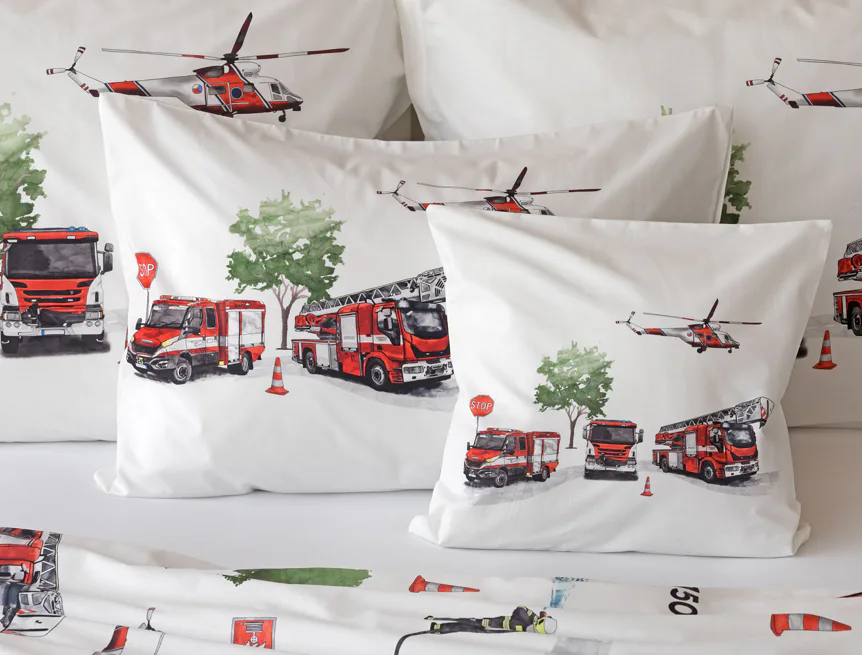 Dětské povlečení Hasiči s motivy hasičské techniky potěší všechny malé milovníky záchranářských dobrodružství. Na bílém podkladu ožívají realistické ilustrace hasičských aut, vrtulníku, čtyřkolky i požárníků v akci. Dynamický motiv doplňují dopravní značky, kužely a další detaily, které vytvářejí hravou atmosféru. Zatímco malí záchranáři sní o dobrodružstvích, o jejich spokojený spánek se postará hebká prvotřídní bavlna.