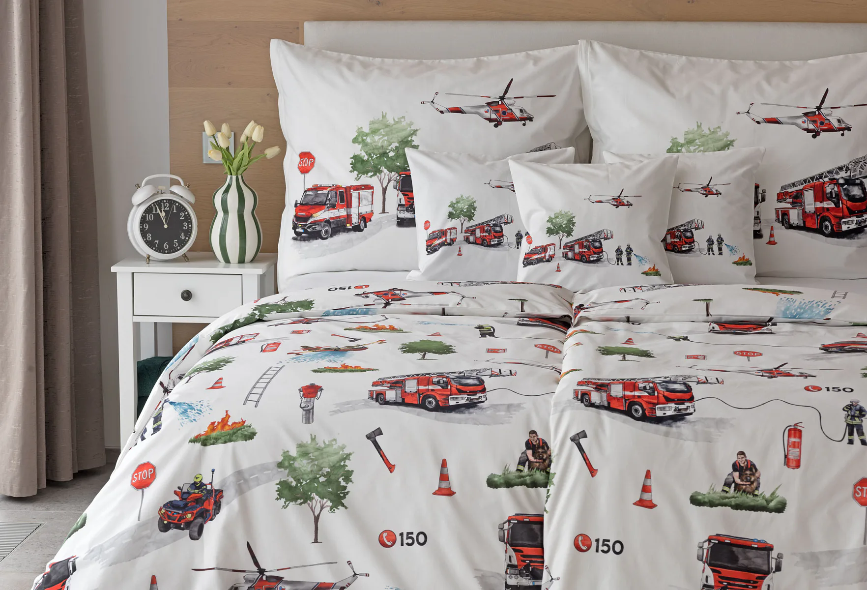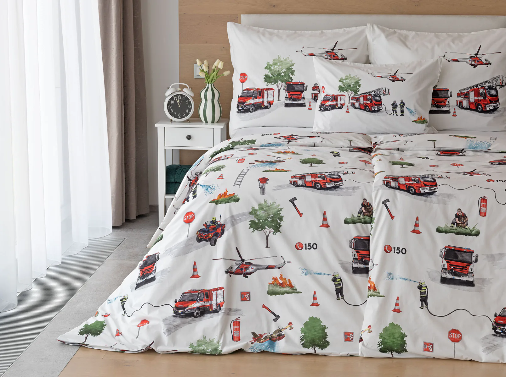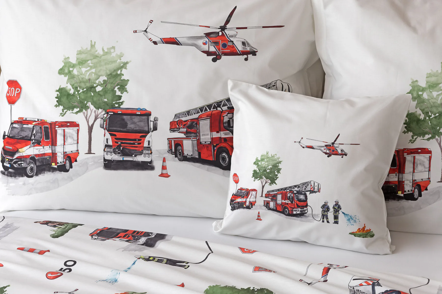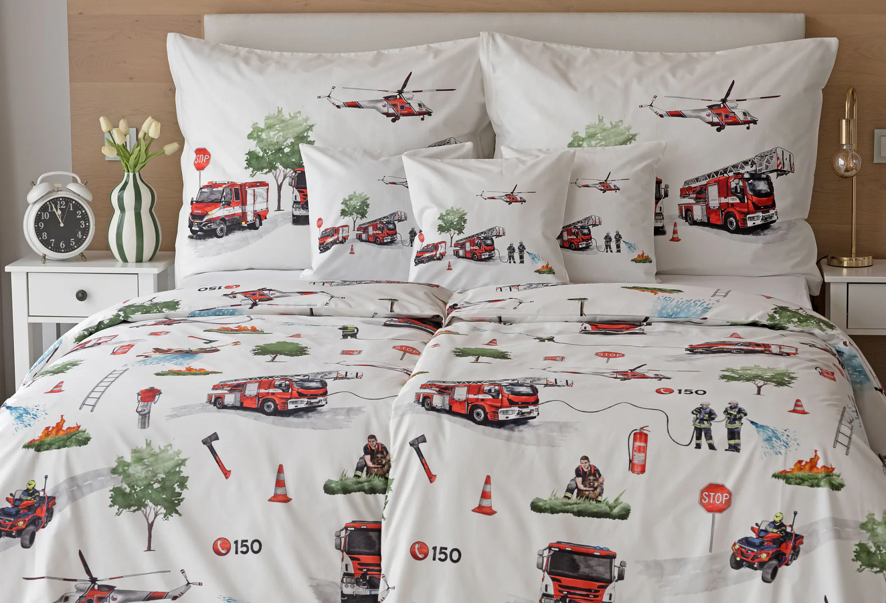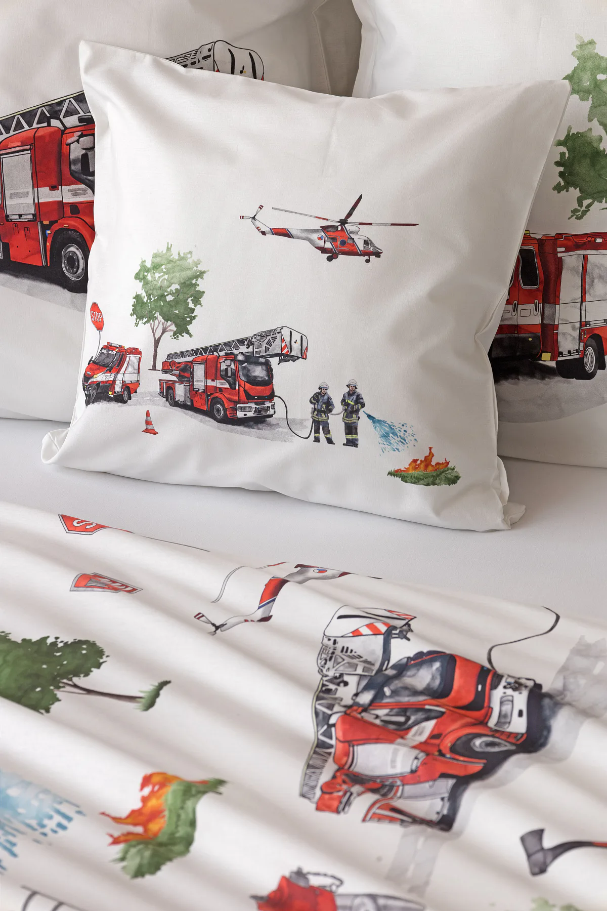 Dětské povlečení Hasiči s motivy hasičské techniky potěší všechny malé milovníky záchranářských dobrodružství. Na bílém podkladu ožívají realistické ilustrace hasičských aut, vrtulníku, čtyřkolky i požárníků v akci. Dynamický motiv doplňují dopravní značky, kužely a další detaily, které vytvářejí hravou atmosféru. Zatímco malí záchranáři sní o dobrodružstvích, o jejich spokojený spánek se postará hebká prvotřídní bavlna.