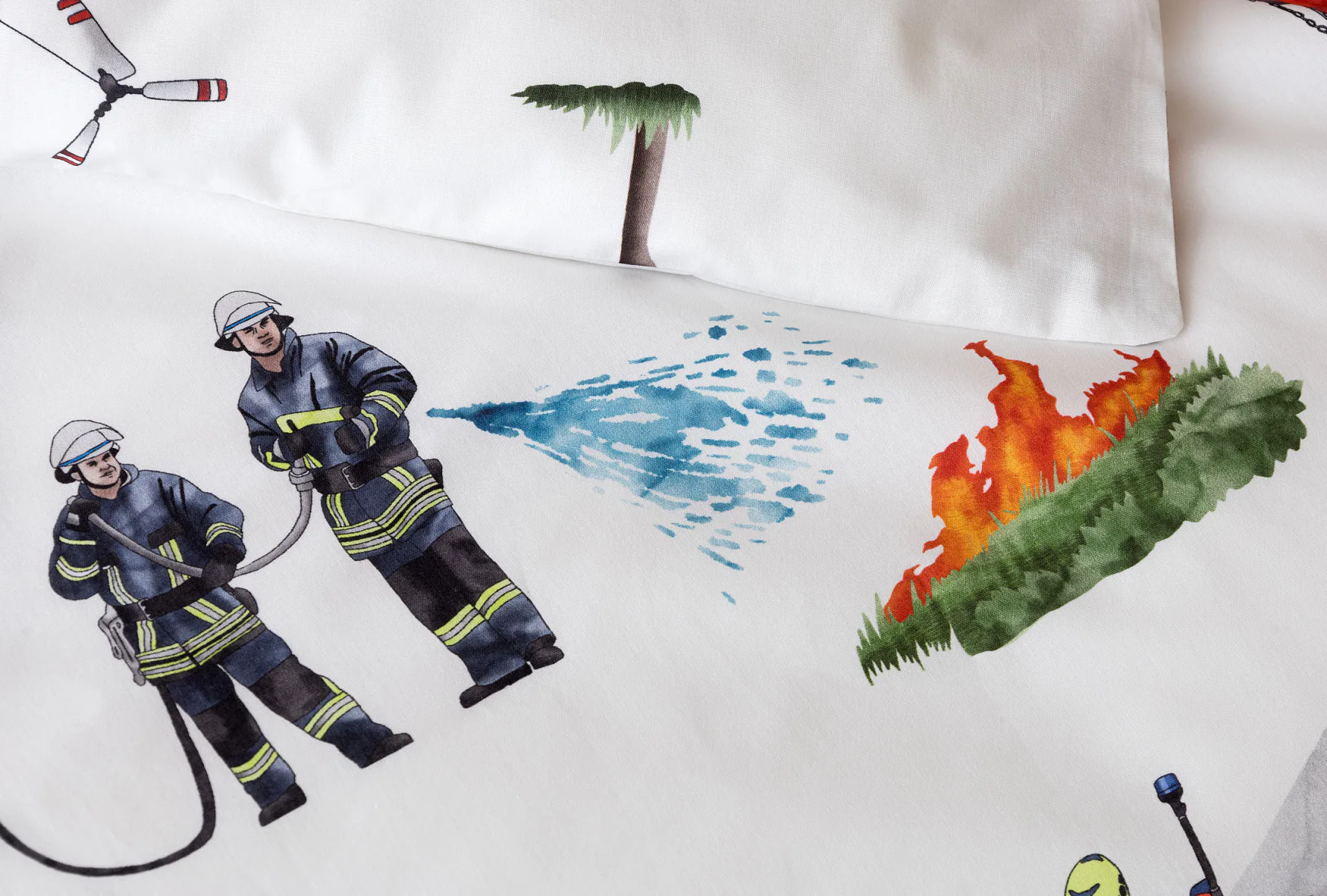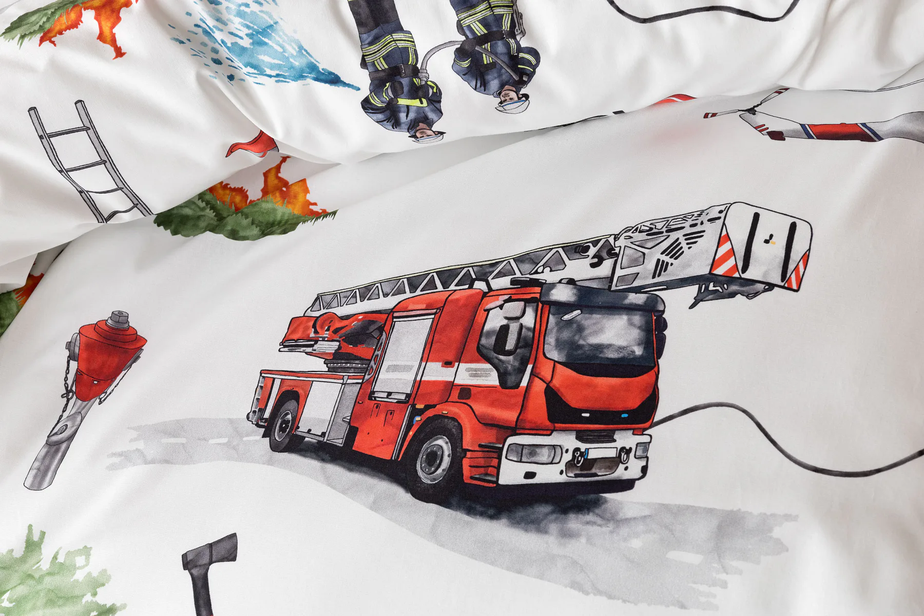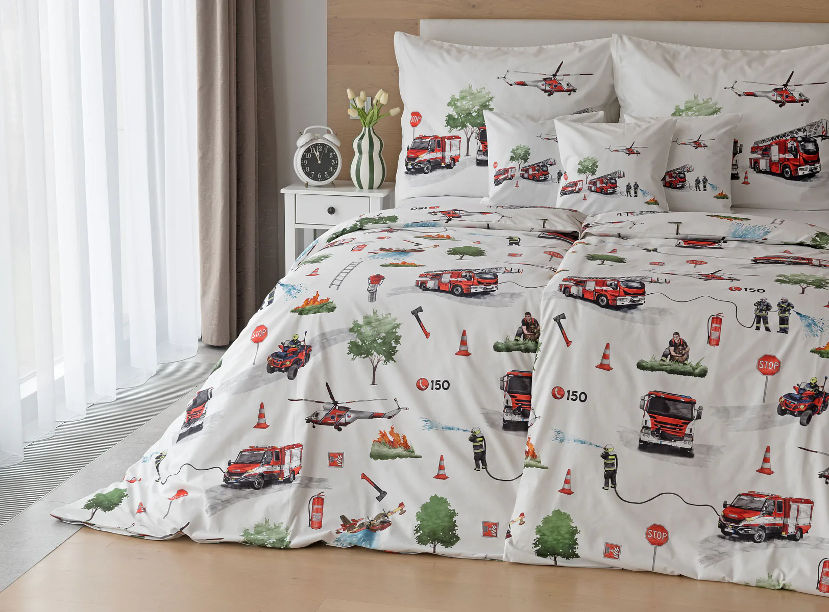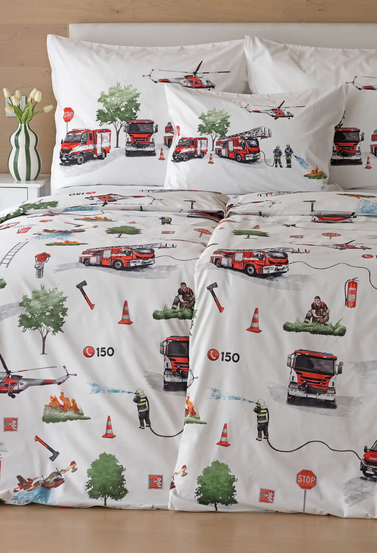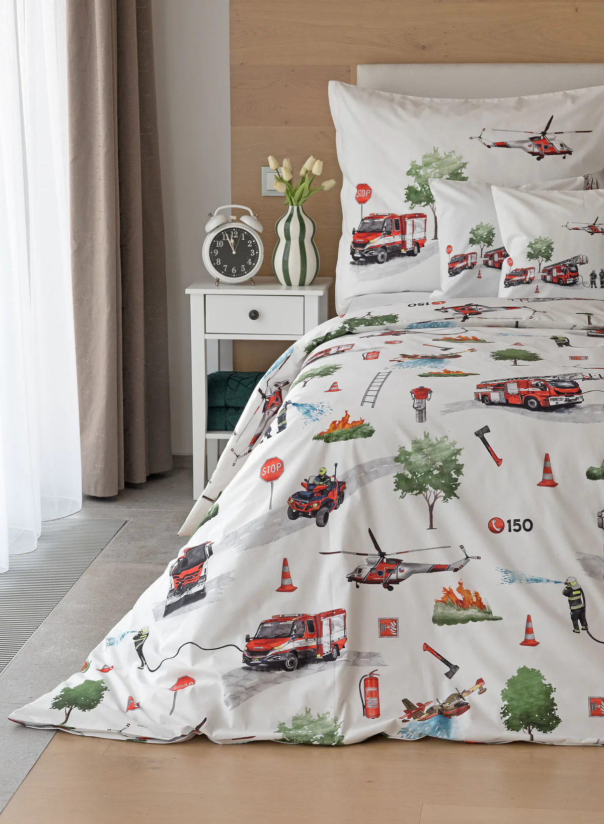 Dětské povlečení Hasiči s motivy hasičské techniky potěší všechny malé milovníky záchranářských dobrodružství. Na bílém podkladu ožívají realistické ilustrace hasičských aut, vrtulníku, čtyřkolky i požárníků v akci. Dynamický motiv doplňují dopravní značky, kužely a další detaily, které vytvářejí hravou atmosféru. Zatímco malí záchranáři sní o dobrodružstvích, o jejich spokojený spánek se postará hebká prvotřídní bavlna.